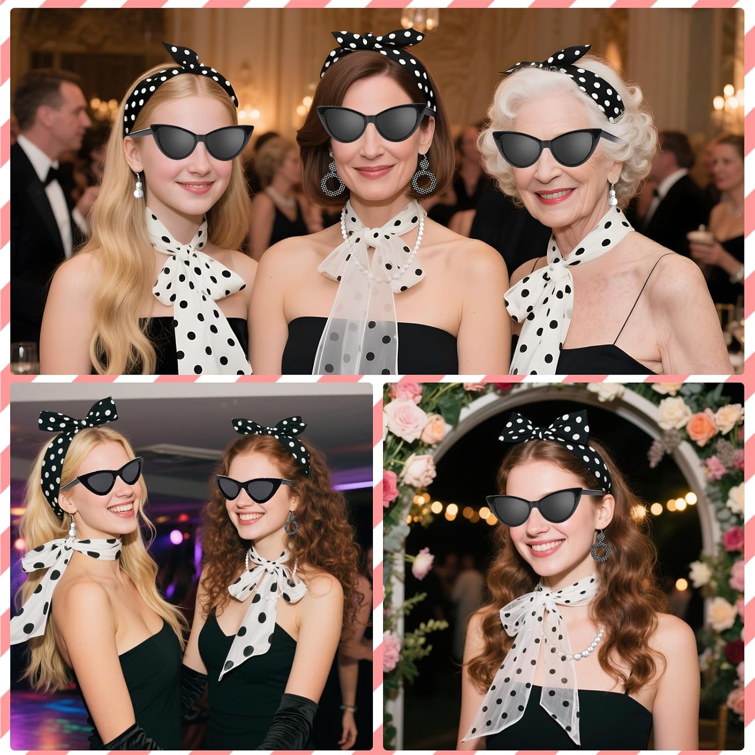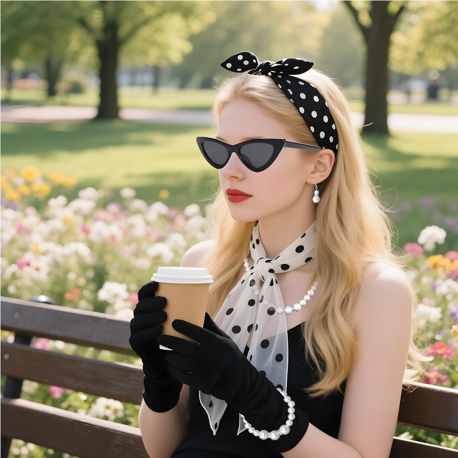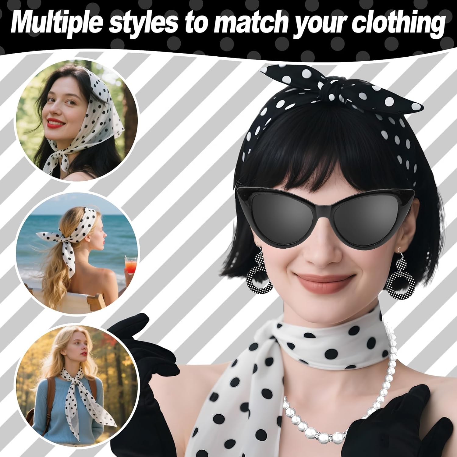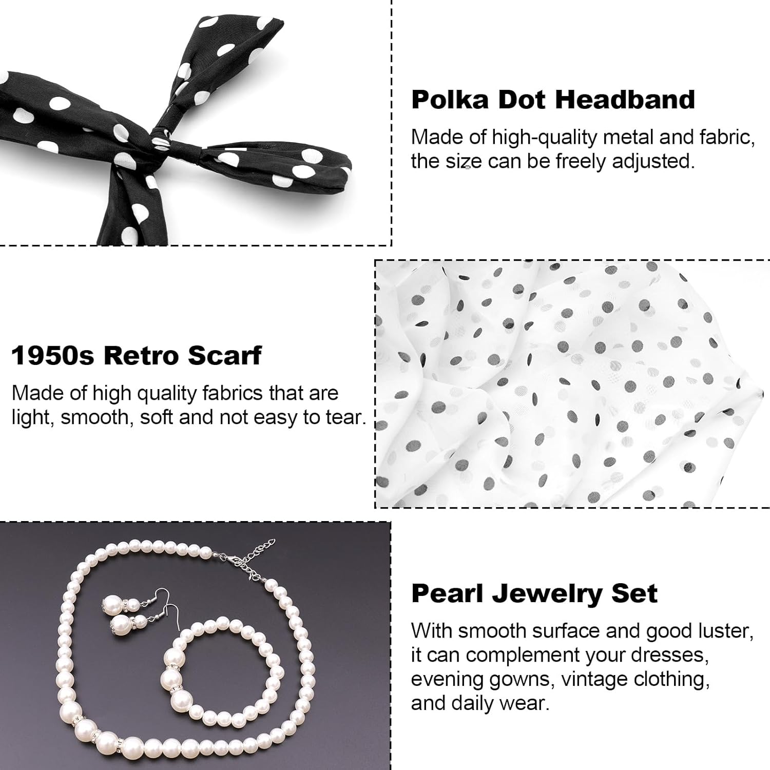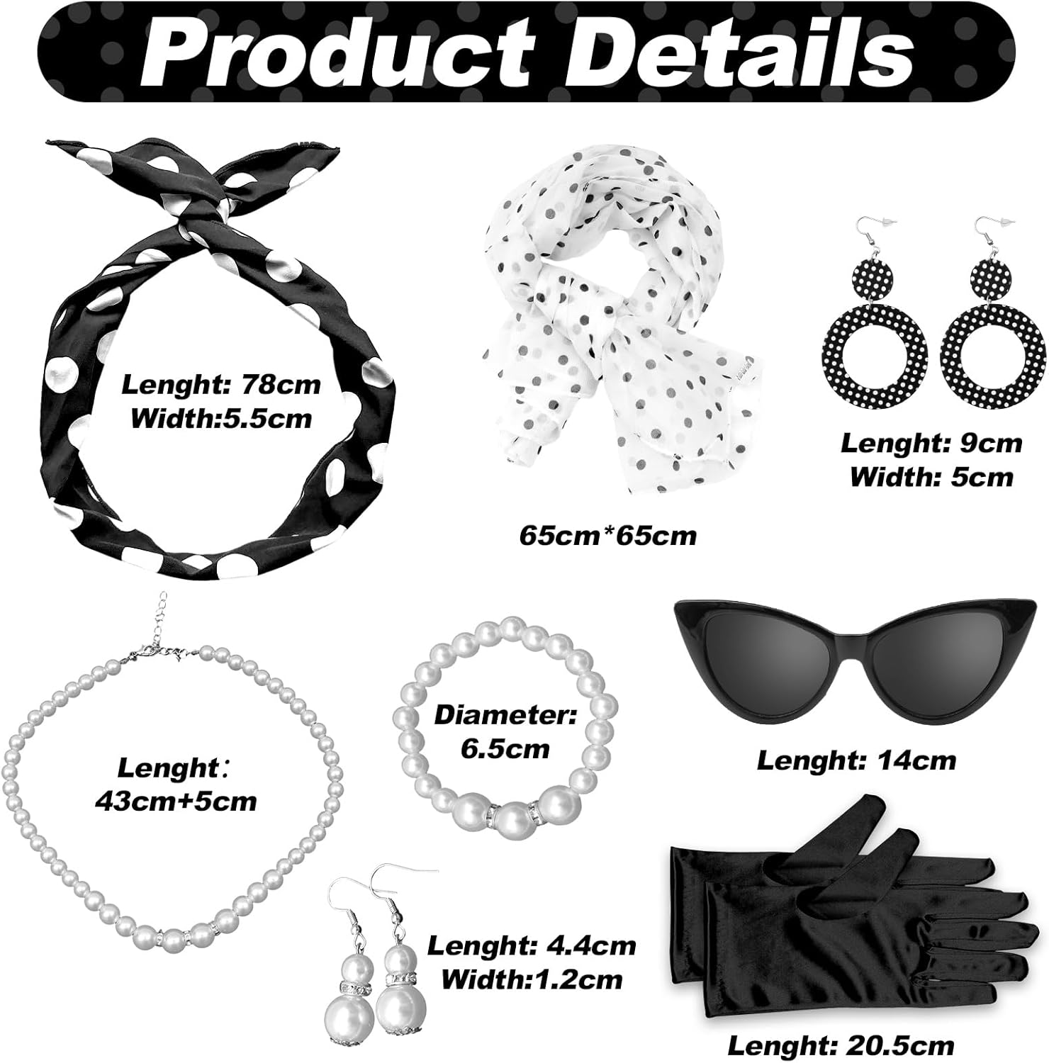 Caratteristiche: 1. Gli accessori da donna perfetti anni '50 rendono il tuo costume ancora perfetto. 2. Questi accessori Rockabilly anni '50 sono un set completo e possono essere combinati con molti indumenti. 3. Il nostro set di accessori per costume anni '50 è realizzato con perline e pois che hanno un aspetto classico ed elegante. 4. Con l'accessorio per abito da donna anni '50, è possibile ripristinare perfettamente lo stile femminile e alla moda degli anni '50. Specifiche: Colore: bianco/rosso. Materiale: plastica, nylon, chiffon, metallo. La confezione include: 1 fascia per capelli a pois 1 sciarpa a bandana. 1 paio di occhiali da sole. 1 paio di guanti neri. 1 paio di orecchini a pois 1 collana di perle. 1 braccialetto di perle. 1 paio di orecchini con perle. Perfetto per diverse occasioni: Festa a tema anni '50 Festa a tema Rock Halloween Carnevale Festa in costume Vestire Natale