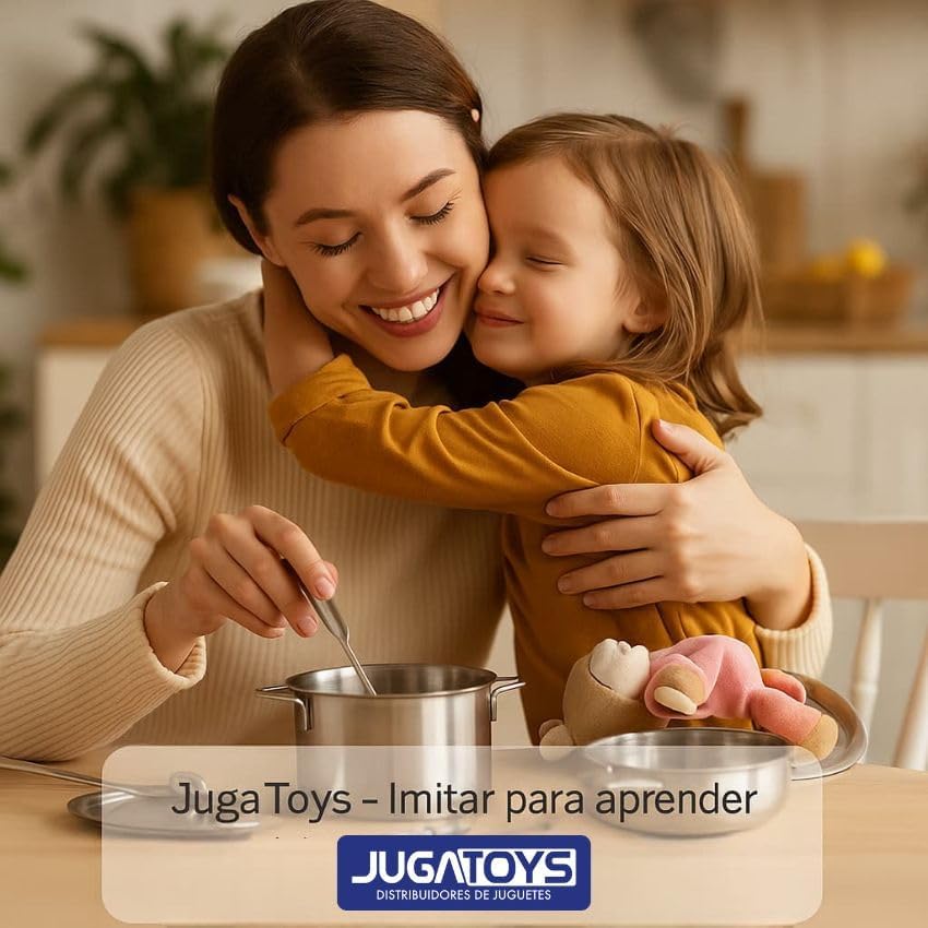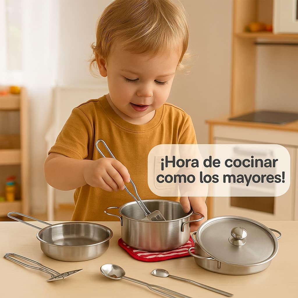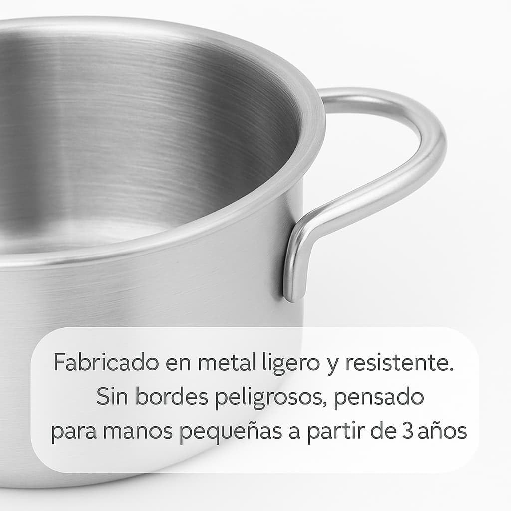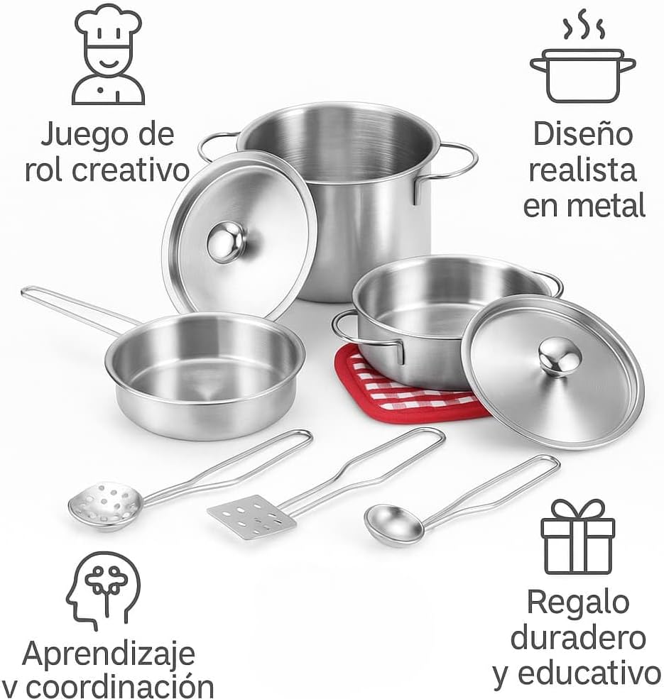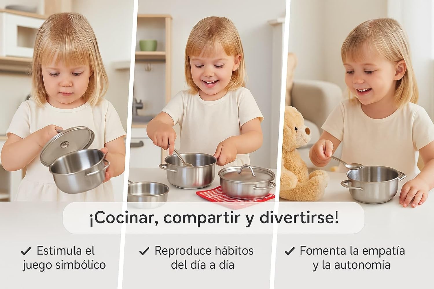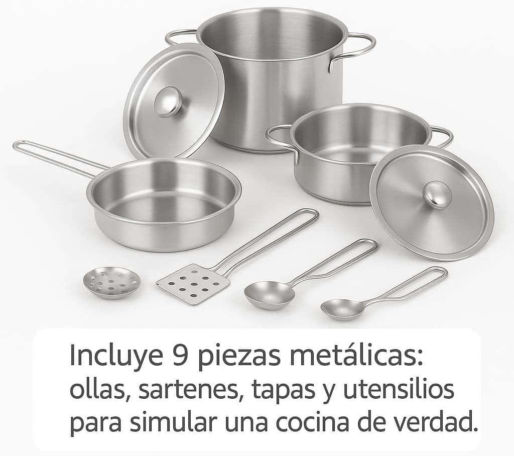 Set completo di stoviglie per bambini con 9 pezzi in metallo: include pentola grande con coperchio, casseruola, padella, pentola bassa con coperchio, schiumarola, mestolo, spatola metallica, pinza in tessuto e altro ancora. Un giocattolo perfetto per bambini e ragazze dai 3 anni in su per sviluppare la loro creatività in cucina mentre imitano gli adulti. Include 3 utensili da cucina in legno per la rimozione degli alimenti, ideali per completare l'esperienza del gioco simbolico. I bambini possono mescolare, servire e cucinare realisticamente come veri chef. Perfetto per rafforzare la coordinazione occhio-mano e le capacità motorie fini, divertendosi. Design esclusivo e realistico di JugaToys, realizzato in acciaio inossidabile di alta qualità. Tutti gli utensili e gli accessori sono progettati per resistere all'uso quotidiano nel gioco, senza bordi taglienti o parti pericolose. Materiali sicuri e durevoli che garantiscono ore di divertimento. Ideale come complemento per qualsiasi cucina per bambini o gioco di ruolo da chef. Questo set di stoviglie consente a ragazzi e ragazze di imparare mentre giocano, simulando compiti di cucina come bollire, friggere o servire cibo immaginario. Include una pinza in tessuto per un maggiore realismo. Adatto per bambini e ragazze dai 3 anni in su, favorisce la creatività, l'autonomia e il gioco collaborativo. Perfetto come regalo per compleanno, Natale o qualsiasi occasione speciale. Dimensioni del set: 30 x 10 x 20 cm, facile da riporre e trasportare.