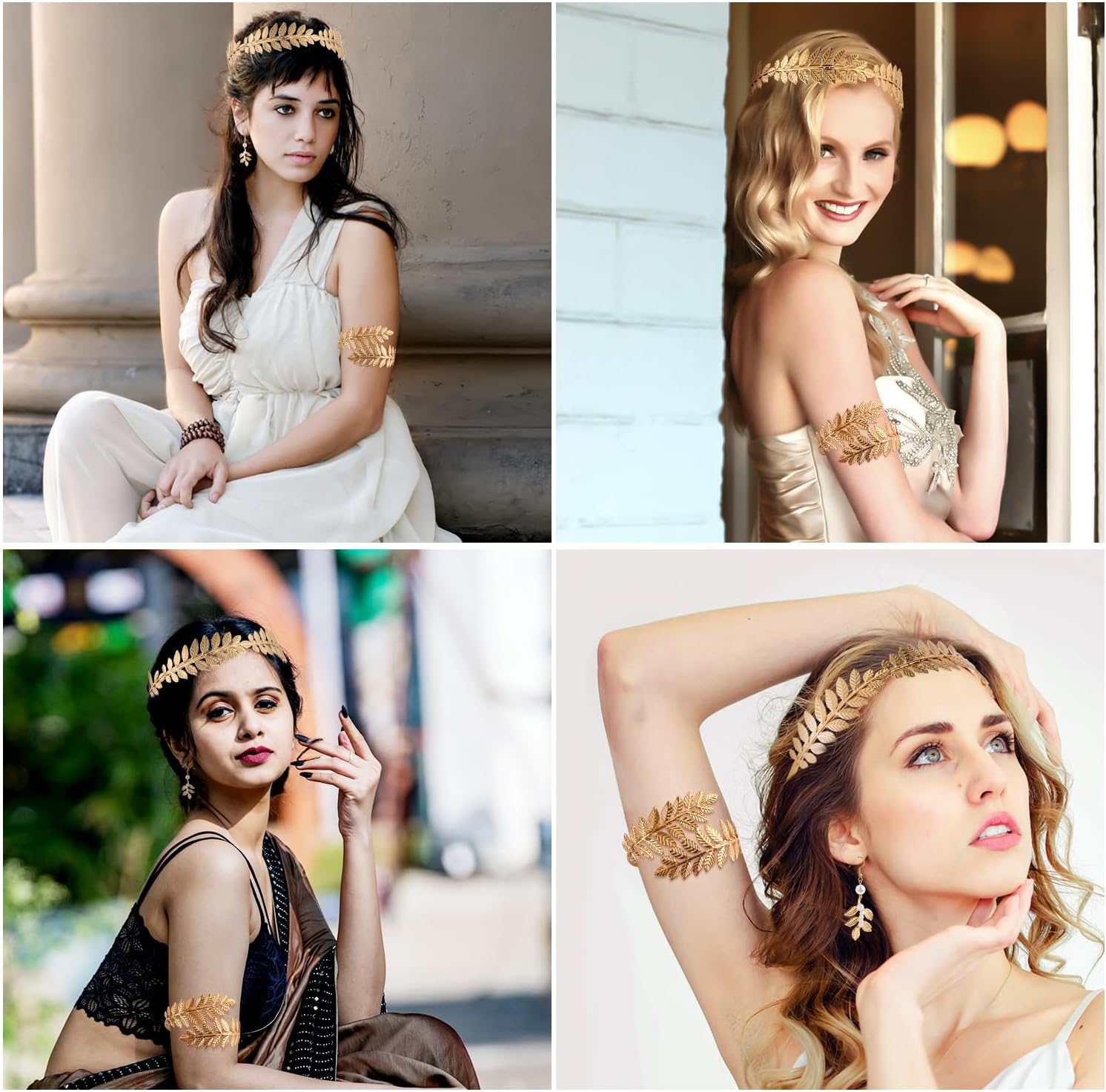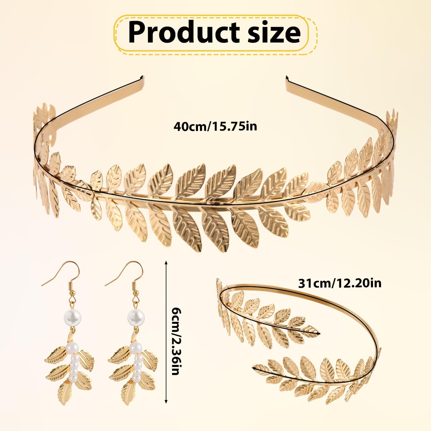 Specifiche: Colore: fascia: oro, orecchini: bianco, oro, bracciale: oro Materiale: lega Dimensioni del prodotto: fascia: circonferenza 40cm, bracciale: circonferenza 31cm, orecchini: diametro 6cm Dettagli della confezione: 1 set di accessori della dea greca Nota: A causa della misurazione manuale, le dimensioni e il peso potrebbero presentare un certo errore. A causa della differenza tra i monitor, potrebbe esserci una leggera differenza di colore.