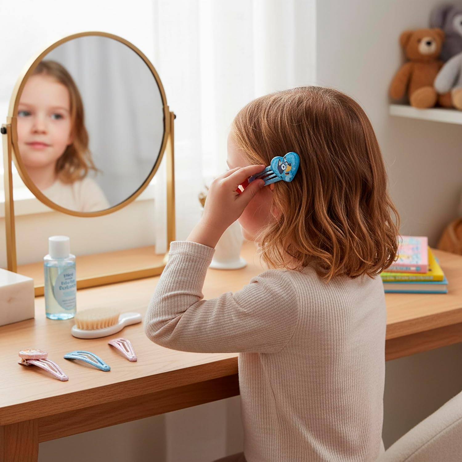 Set fermagli per capelli Bluey - Include 4 fermagli per capelli metallici con finitura lucida nei toni del rosa e del blu, decorati con cuori e personaggi Bluey e Bingo per un tocco divertente e colorato. MATERIALE SICURO E CONFORTEVOLE PER LE RAGAZZE: Realizzato con materiali atossici e durevoli e un sistema di chiusura a scatto che impedisce la trazione e si adatta ai capelli del tuo bambino senza danneggiarli. Ideale per ragazze dai 3 anni in su: progettato per acconciare, trattenere o abbellire i capelli in modo sicuro ed elegante, ideale per l'uso quotidiano a scuola o per giocare a casa. Prodotto Bluey con licenza ufficiale - Prodotto con licenza ufficiale che garantisce qualità, autenticità e appeal visivo per i fan della serie animata Bluey. REGALO PERFETTO PER I FAN DEI BLUEY - Un accessorio divertente, funzionale e adorabile per compleanni, celebrazioni o come regalo speciale.