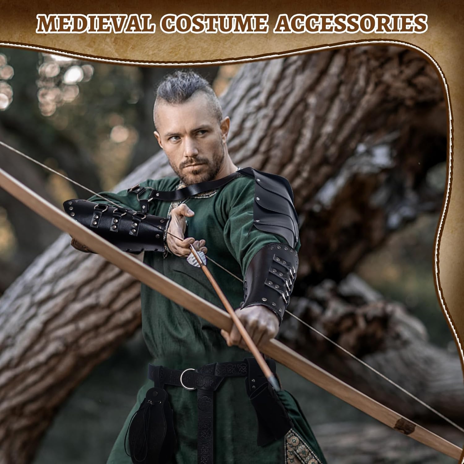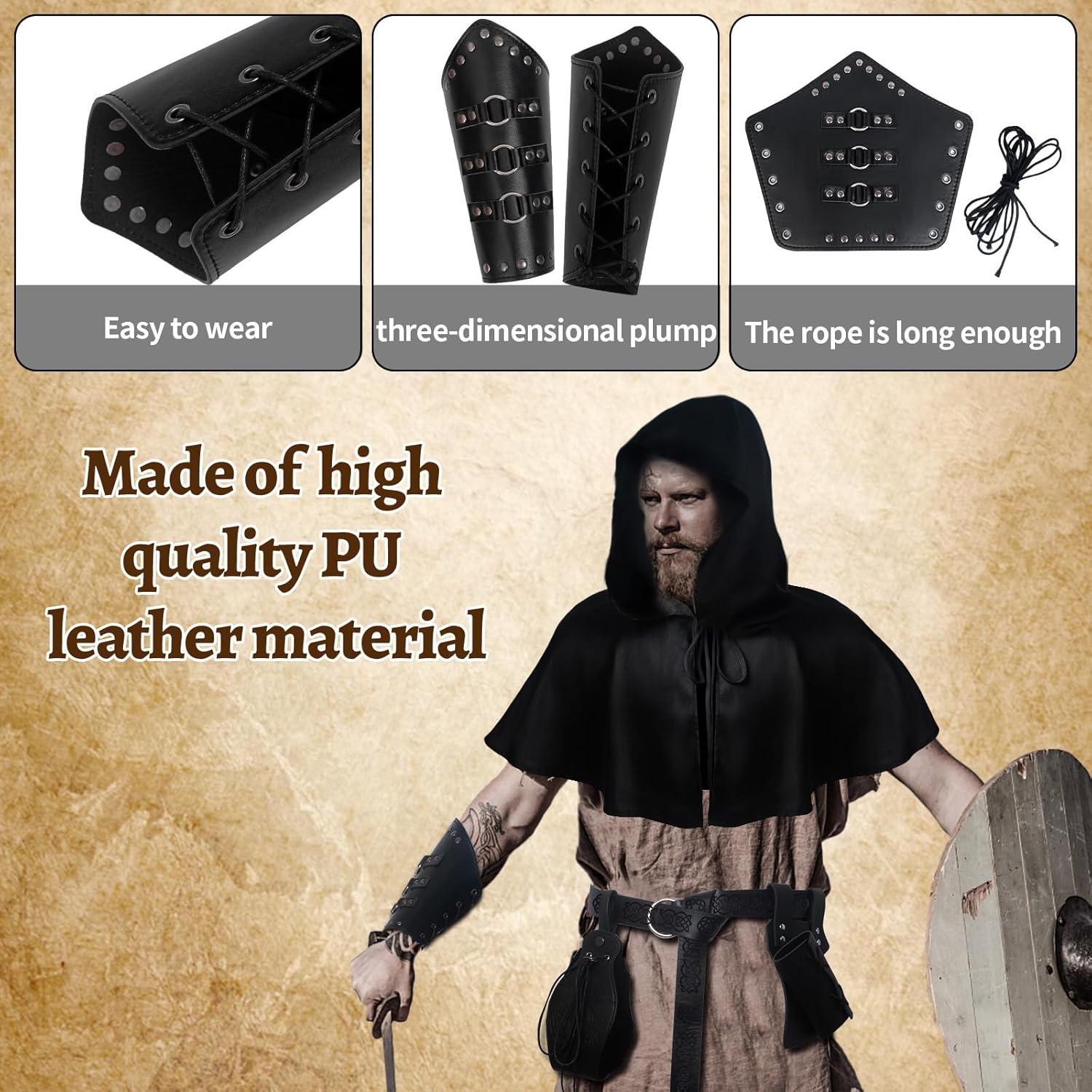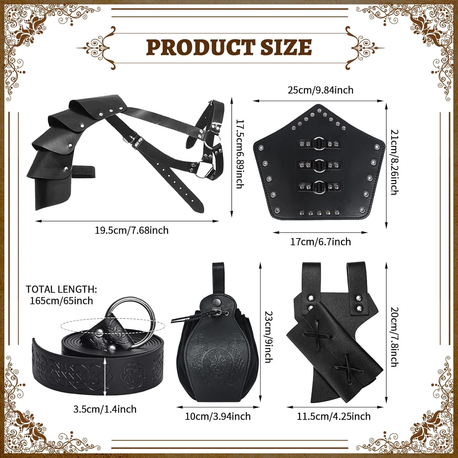 Set di accessori medievali: riceverete 1 sciarpa retrò, 1 cintura in pelle, 2 fasce per braccio, 1 marsupio vintage, 1 spalliera, 1 rana in pelle, 3 penne curve, abbastanza accessori per soddisfare le vostre esigenze di set da cavaliere abbinati. Materiale di qualità: la sciarpa nera è realizzata in tela di cotone, morbida e comoda da indossare, e altri accessori sono realizzati in similpelle PU di alta qualità, sono durevoli e riutilizzabili, non si sbiadiscono o si rompono facilmente. Design regolabile: è possibile combinare il marsupio in PU con il costume medievale da cavaliere per distinguersi alla festa. La spalla, il braccio e la cintura sono regolabili per adattarsi a diverse altezze. Adatto per uomini e donne. Stile retrò: la mantella per la copertura delle spalle retrò è realizzata con borchie e fibbie in metallo, accessorio steampunk pieno di ricca atmosfera medievale, classica e retrò, ideale per eventi rinascimentali, feste vintage e così via. Ampia gamma di applicazioni: questo costume medievale rinascimentale da uomo è adatto per una varietà di occasioni, tra cui feste di travestimento, spettacoli, spettacoli teatrali, feste in maschera, Halloween, Natale, costumi e feste a tema rinascimentale.