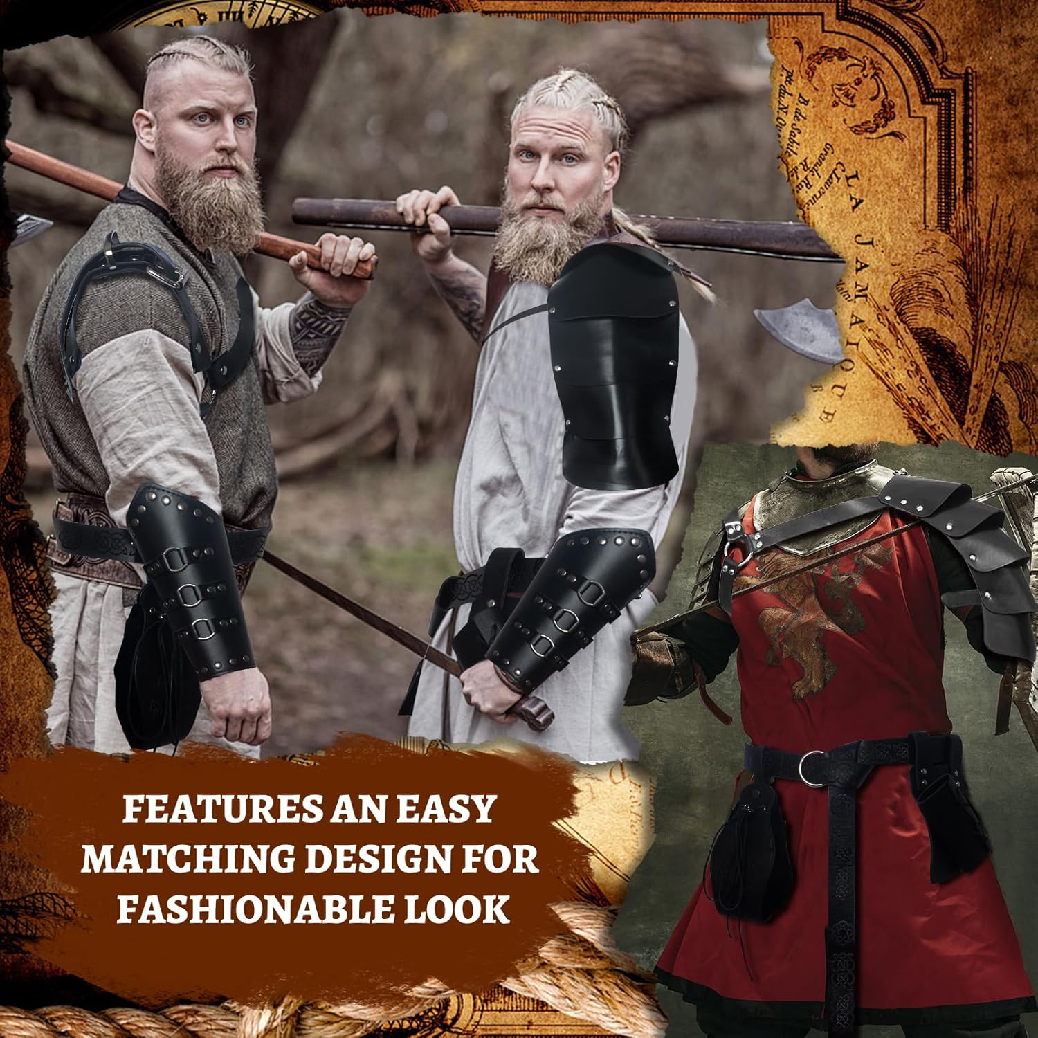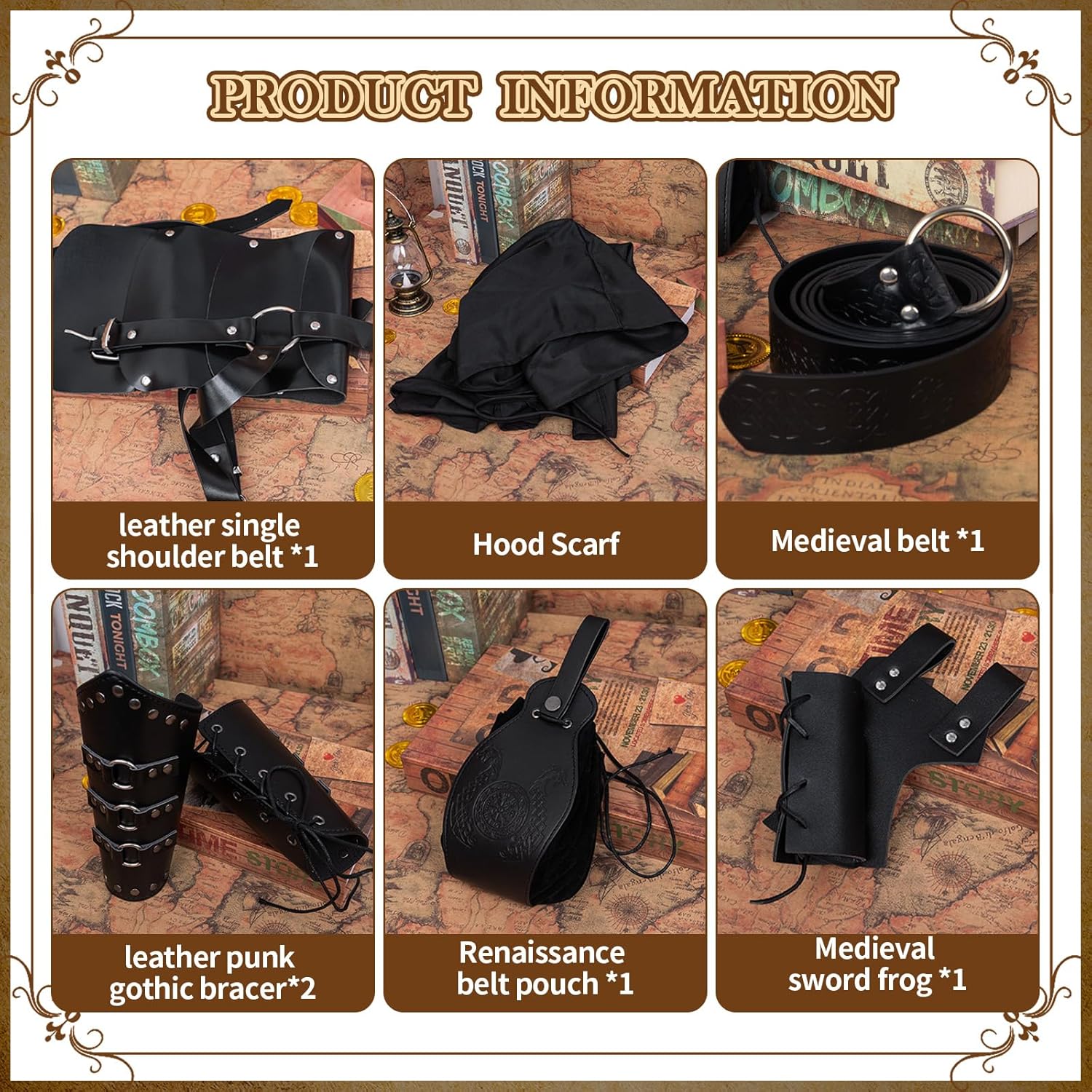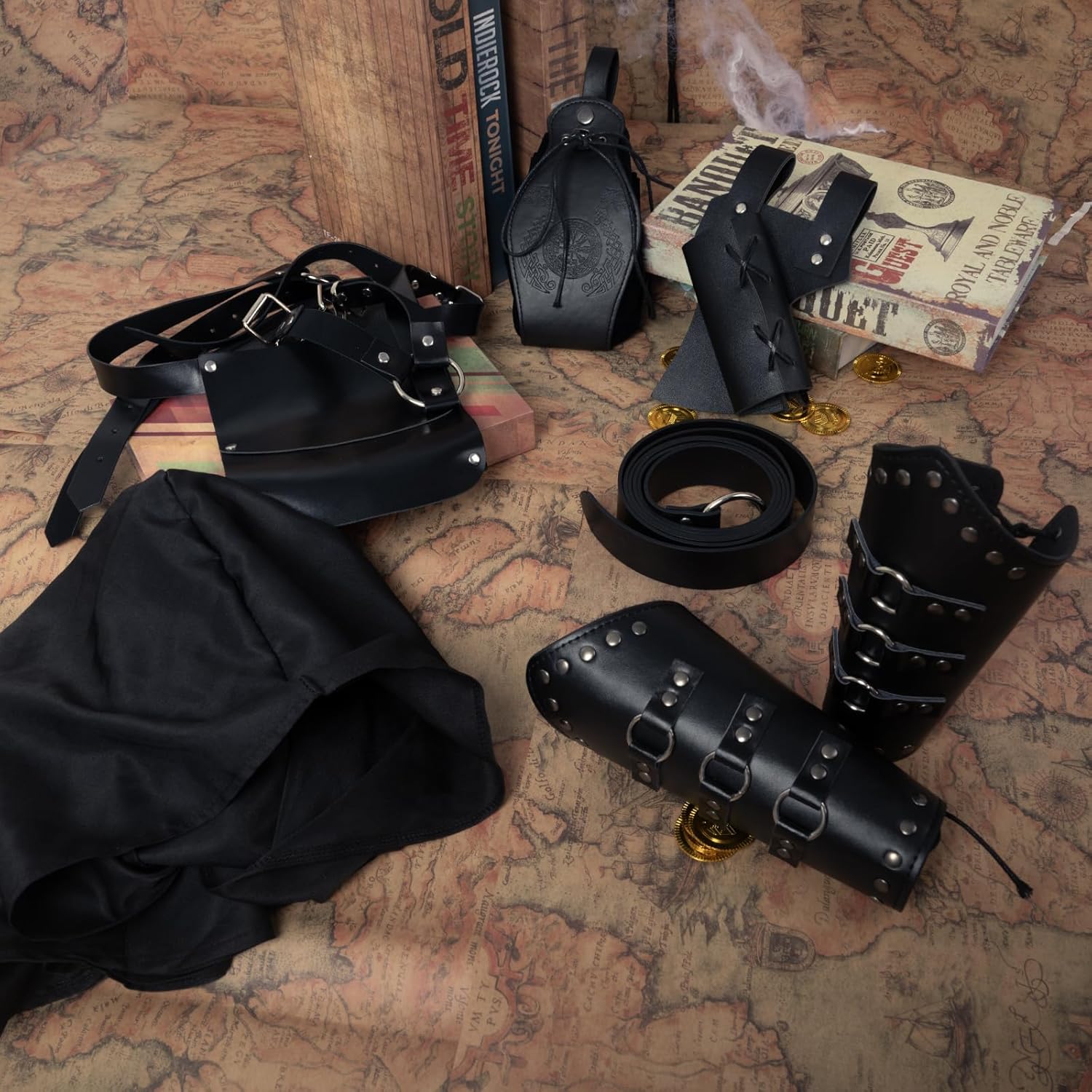 Set di accessori medievali: riceverete 1 sciarpa retrò, 1 cintura in pelle, 2 fasce per braccio, 1 marsupio vintage, 1 spalliera, 1 rana in pelle, 3 penne curve, abbastanza accessori per soddisfare le vostre esigenze di set da cavaliere abbinati. Materiale di qualità: la sciarpa nera è realizzata in tela di cotone, morbida e comoda da indossare, e altri accessori sono realizzati in similpelle PU di alta qualità, sono durevoli e riutilizzabili, non si sbiadiscono o si rompono facilmente. Design regolabile: è possibile combinare il marsupio in PU con il costume medievale da cavaliere per distinguersi alla festa. La spalla, il braccio e la cintura sono regolabili per adattarsi a diverse altezze. Adatto per uomini e donne. Stile retrò: la mantella per la copertura delle spalle retrò è realizzata con borchie e fibbie in metallo, accessorio steampunk pieno di ricca atmosfera medievale, classica e retrò, ideale per eventi rinascimentali, feste vintage e così via. Ampia gamma di applicazioni: questo costume medievale rinascimentale da uomo è adatto per una varietà di occasioni, tra cui feste di travestimento, spettacoli, spettacoli teatrali, feste in maschera, Halloween, Natale, costumi e feste a tema rinascimentale.