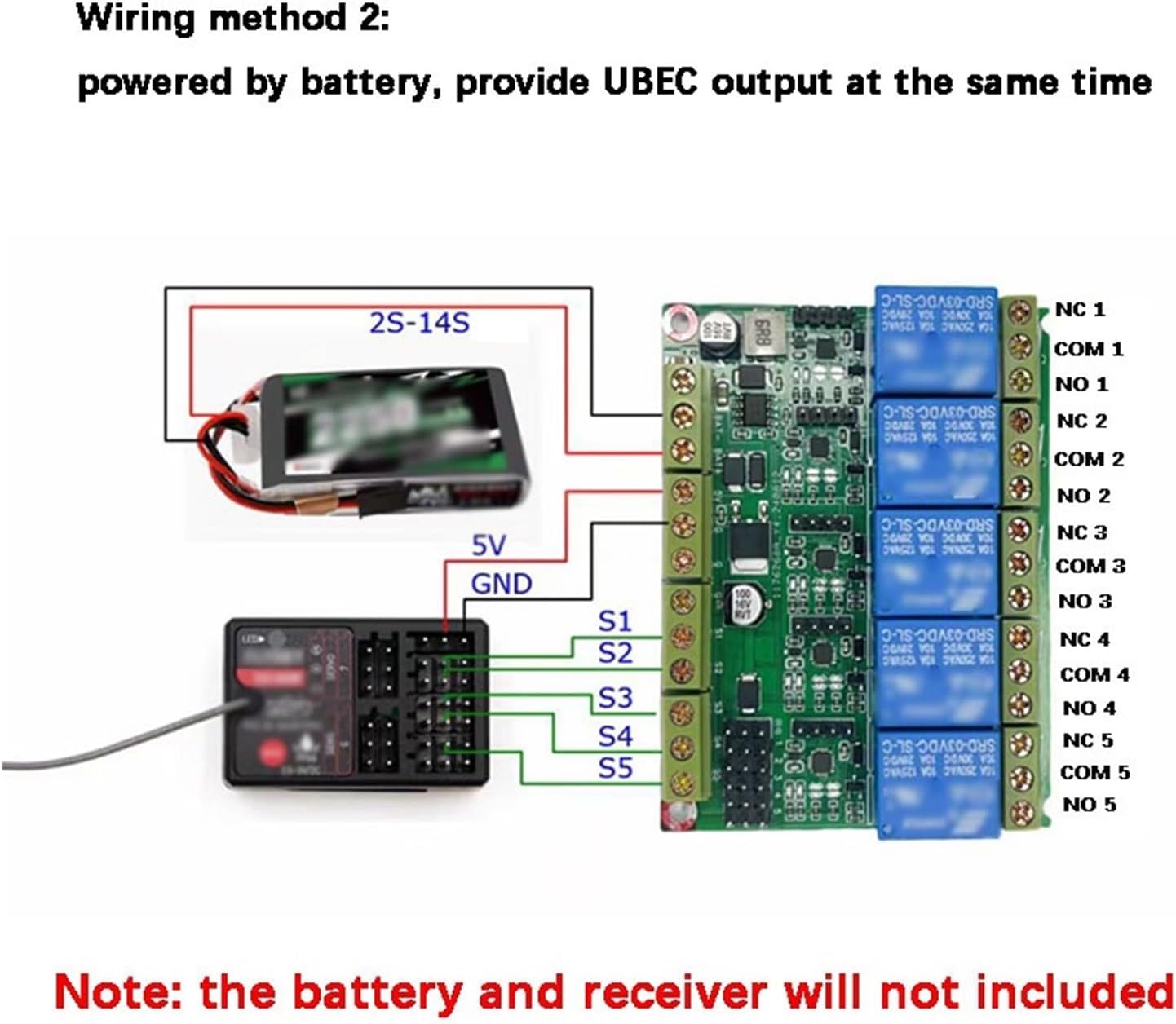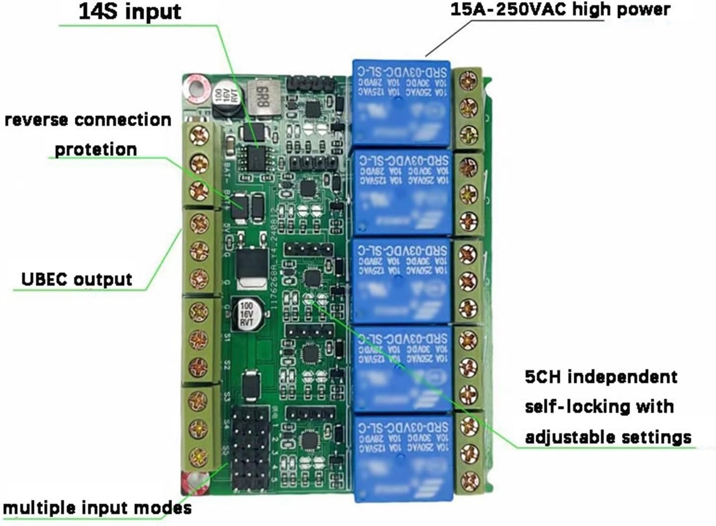 Ciascun canale di uscita supporta 15 A di corrente elevata 250 V CA ad alta tensione Supporto for collegare direttamente il ricevitore drone RC. Supporta l'output UBEC Interruttore relè 5CH controllo completamente indipendente di autobloccante e non autobloccante, alta velocità senza ritardo Protezione connessione inversa Piccole dimensioni e peso leggero. Facile da usare