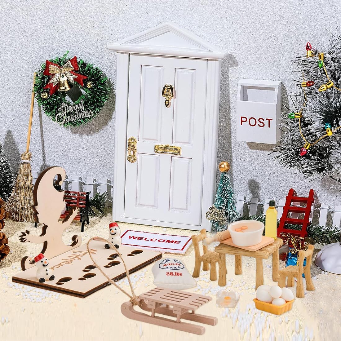 Materiale di qualità: il nostro set di accessori per gnomo è realizzato in resina e legno, superficie liscia, sicuro e durevole, il rapporto 1/12 e il design realistico rendono la vostra decorazione più vivace e realistica Contenuto della confezione: il nostro set per porta principale contiene tavolo e sedie, sacchi di farina in miniatura, pupazzo di neve in miniatura, uova in miniatura con cestino, bottiglia per olio, accessori da forno per casa delle bambole, slitta in assi con corda e stencil a gnomo impronte Perfetto per porta a gnomo: questo accessorio per porta a gnomo è il complemento perfetto per la cucina della casa delle bambole, la porta di gnomo e la decorazione in miniatura per Natale. Con accessori in miniatura gnomo di Natale set per le scene di attività davanti alla porta del nano ed esplorare il mondo dei nani Accessori per la casa delle bambole: decorate la vostra casa delle bambole, la vostra cucina in miniatura o personalizzate le custodie per cellulari, cornici o forcine fatte in casa con questo accessorio in miniatura di alta qualità Regalo ideale: questi accessori in miniatura sono il regalo perfetto per Natale, compleanni, Halloween, Ringraziamento e qualsiasi celebrazione speciale, per condividere la gioia con la famiglia, gli amici e tutti coloro che amano decorare la propria casa in miniatura