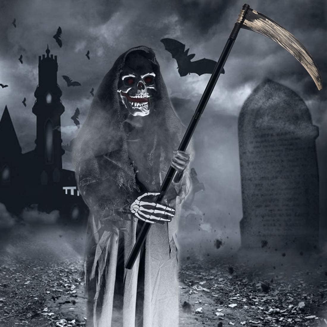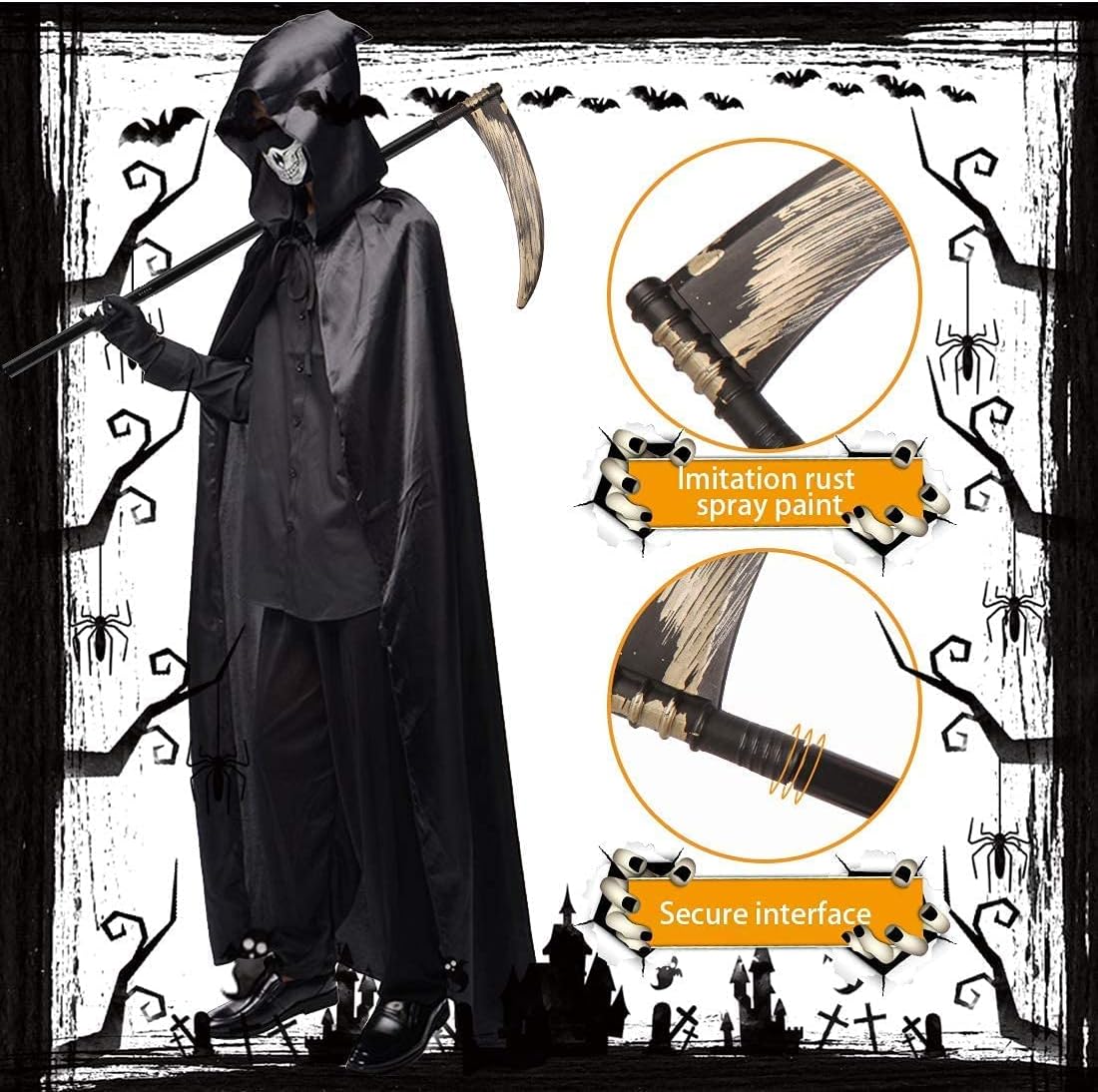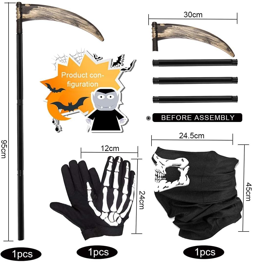 👻Confezione: falce 95 cm x 30 cm, panno scheletro e guanti scheletro. 👻QUALITÀ PREMIUM: il guanto e i guanti con teschio sono realizzati con materiali leggeri e di alta qualità. Le quattro parti della falce sono rimovibili per un facile montaggio e trasporto. 👻Costume di Halloween: perfetto per le foto di Halloween e altre feste. Le maschere con teschio possono essere utilizzate come maschere, fasce per la testa, braccialetti, bavaglini, ecc. 👻FACILE CURA: gli indumenti con teschi e ossa incrociate possono essere lavati a mano a 20-31°C in caso di contatto con macchie. Si consiglia di stirare il rovescio del tessuto a bassa temperatura per evitare macchie lucide. 👻Scenario: questo nuovo costume di Halloween del Tristo Mietitore è ideale per balli in maschera, feste di Halloween e altri articolati spettacoli di marionette mostruose.