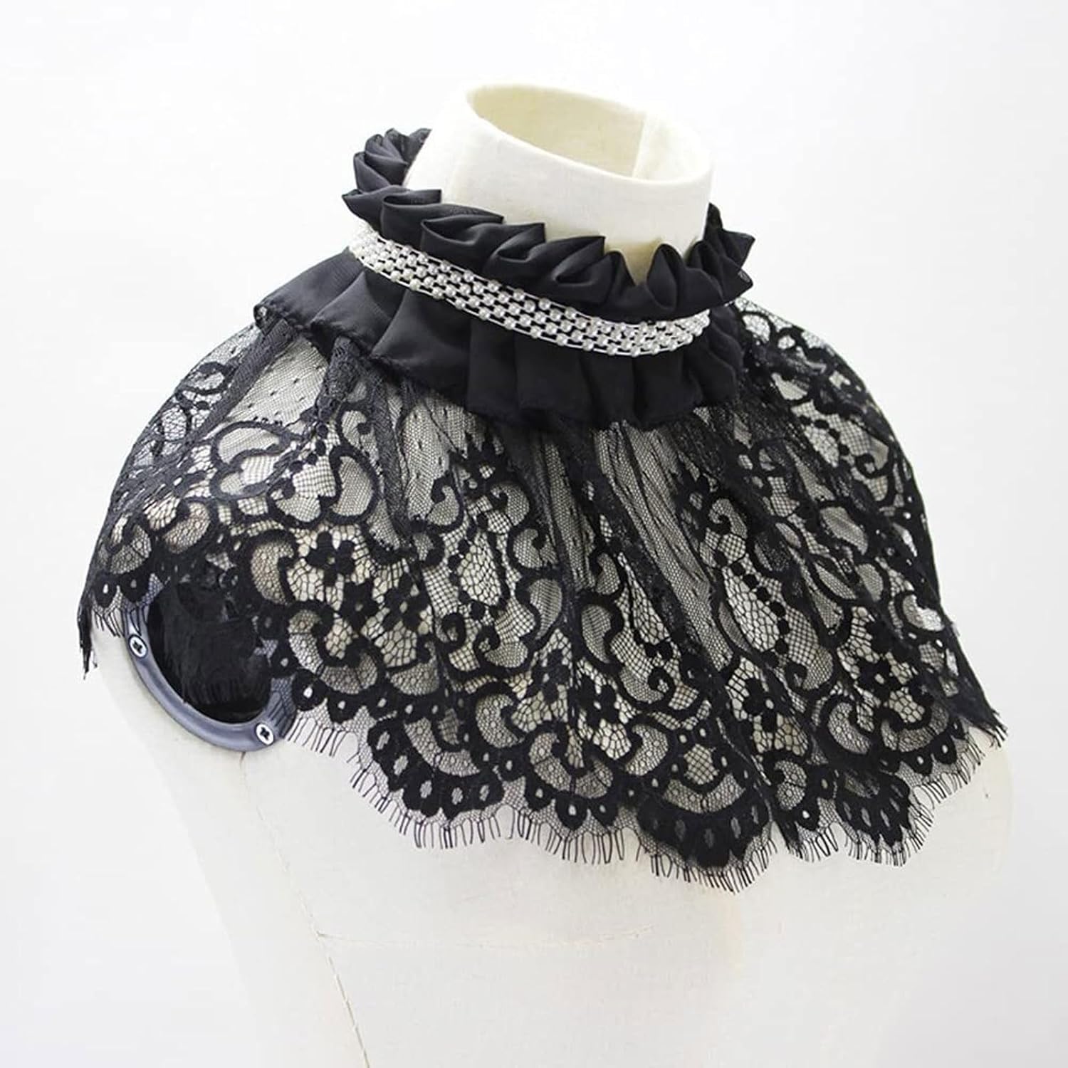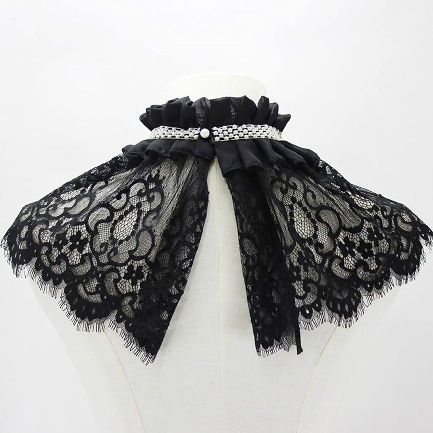 Dettagli: Materiale: pizzo di poliestere (si consiglia il lavaggio a mano) Stile: colletto finto in pizzo cavo con drappeggio a scialle Chiusura: lacci regolabili o bottoni automatici (come mostrato nelle immagini) Colore: Nero classico Ideale per: Costumi gotici/steampunk Servizi fotografici e spettacoli teatrali Indossare a strati sopra camicette o abiti Istruzioni for la cura: Lavare a mano a freddo Stendere ad asciugare Conservare in piano for evitare pieghe