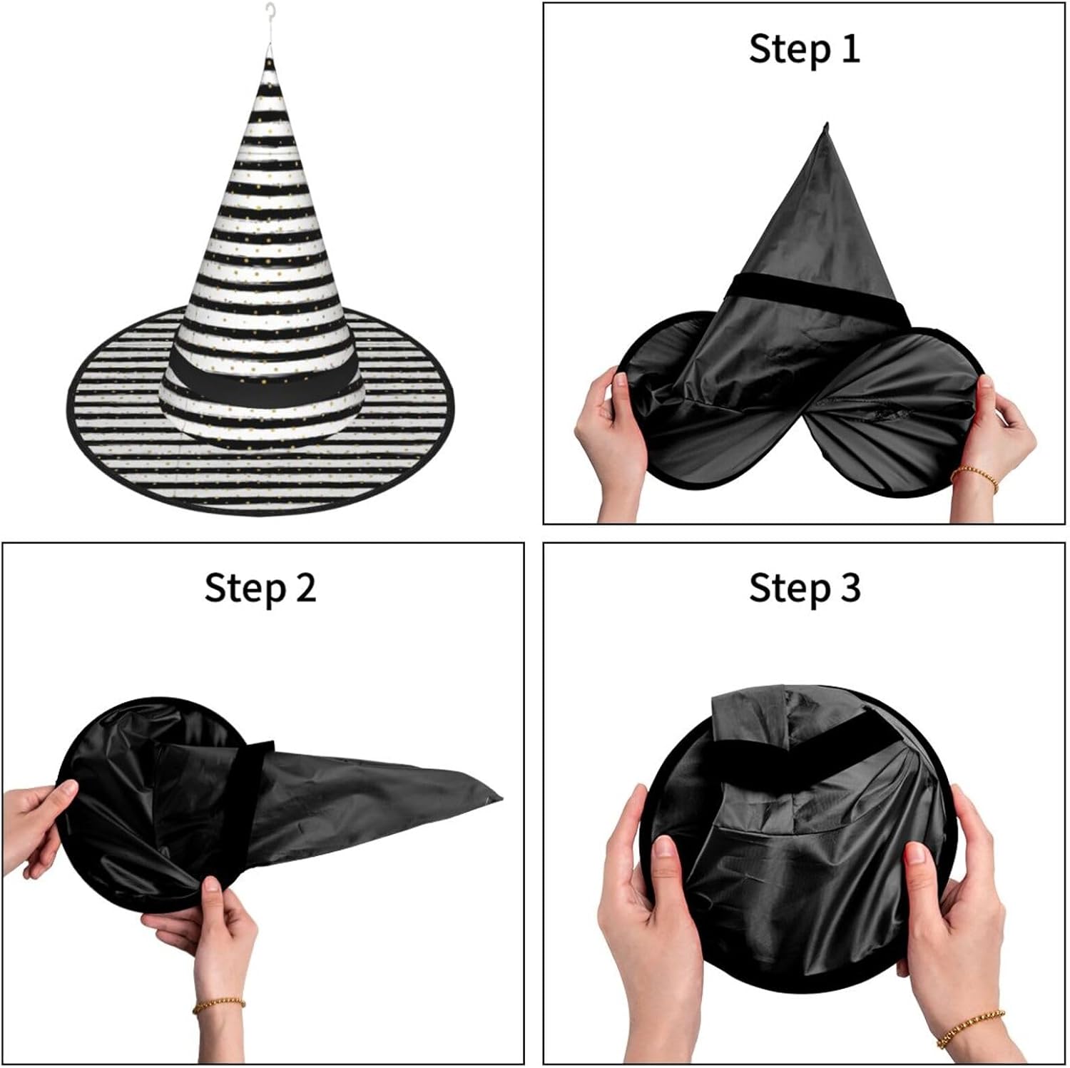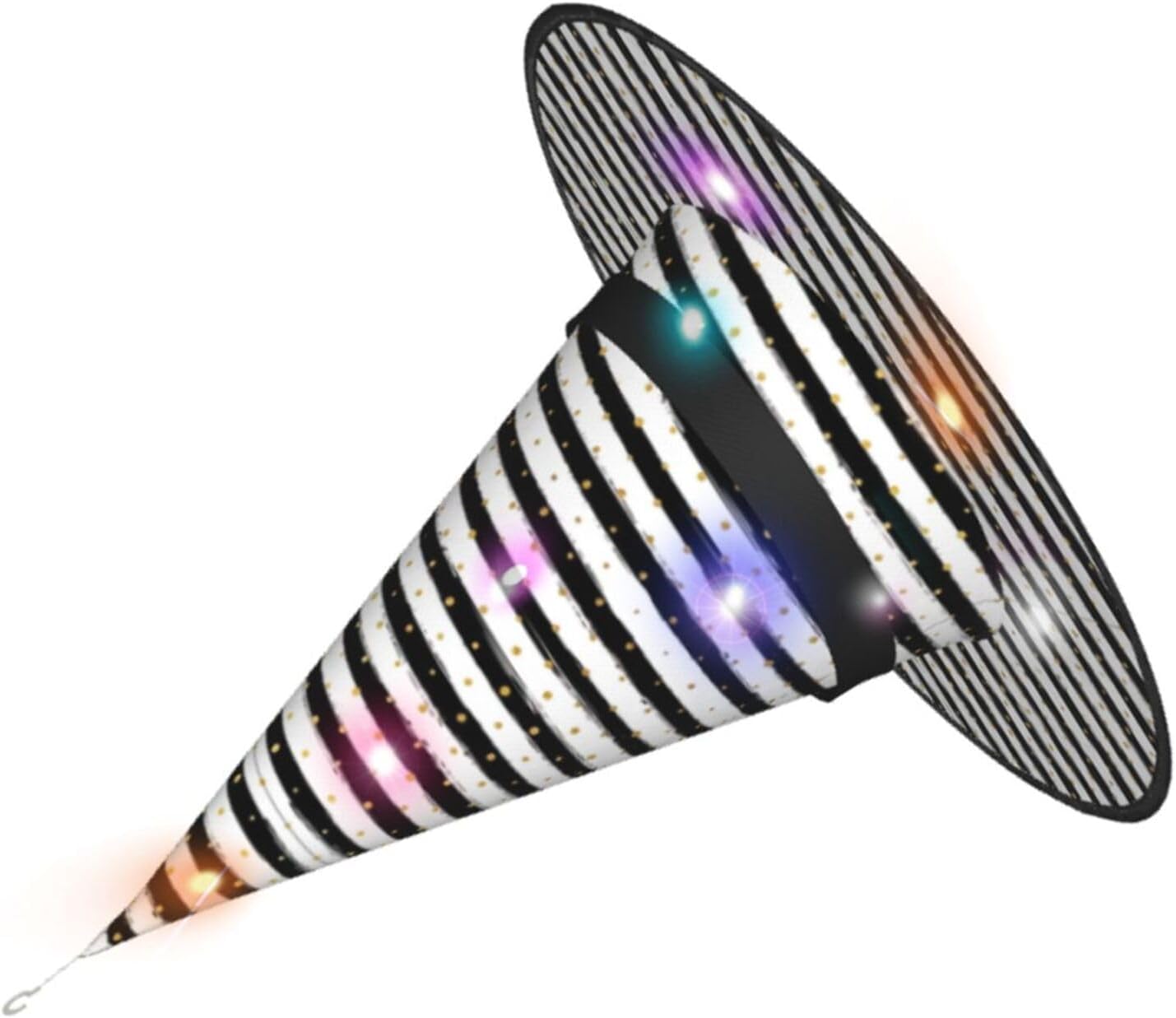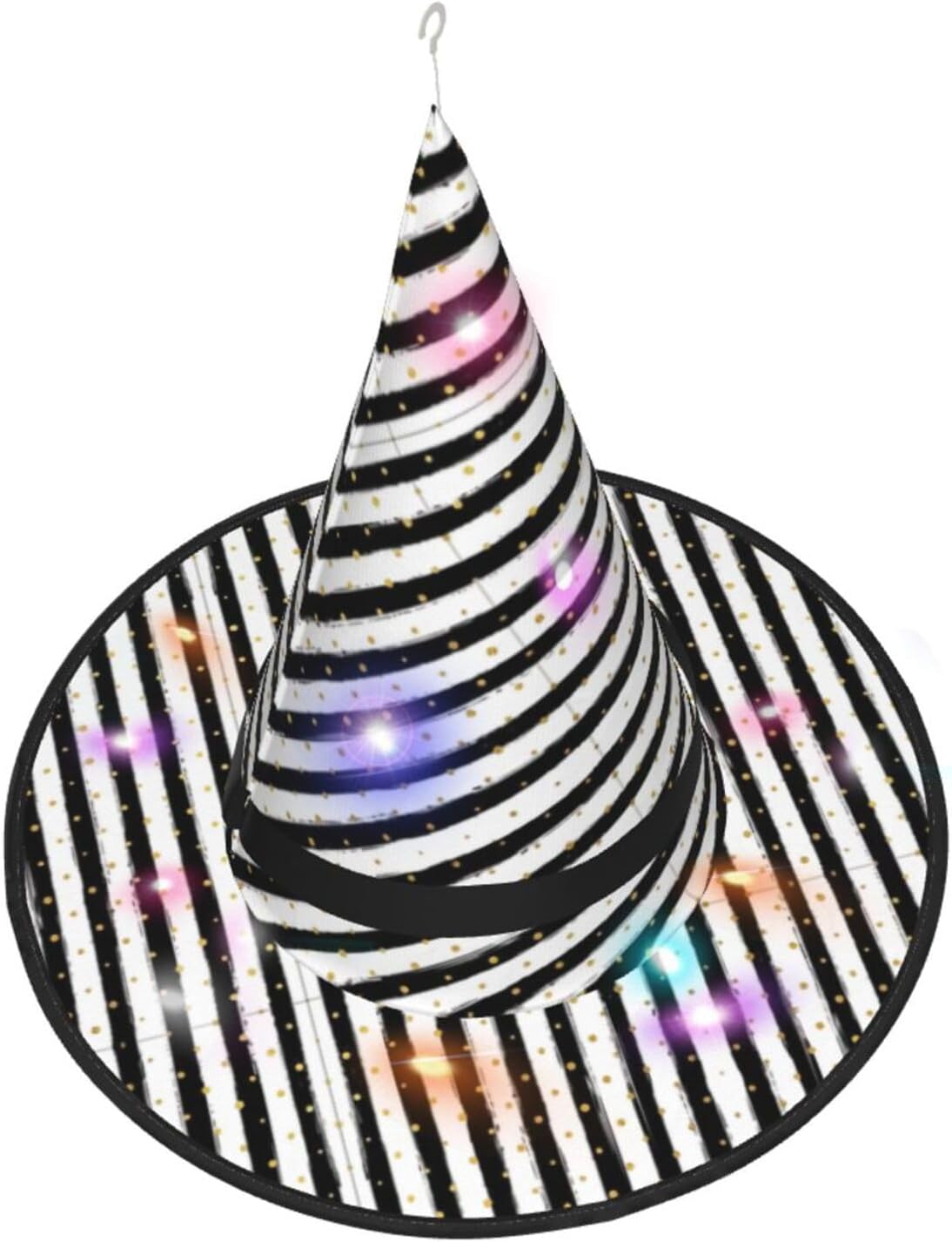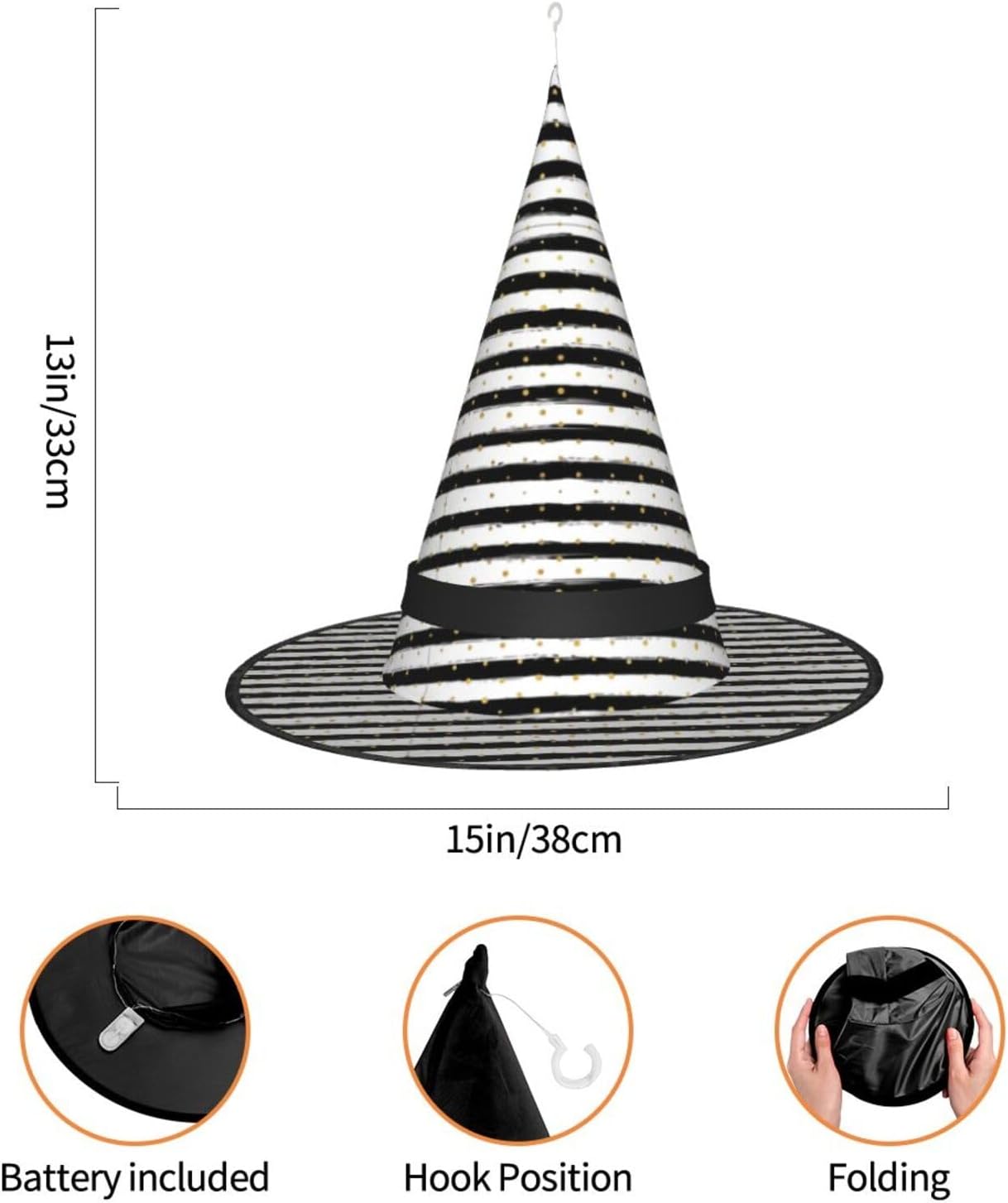 Inchiostro e strisce a pois dorati Aggiungi un tocco stravagante al tuo costume con il nostro incantevole cappello da strega, l'accessorio perfetto per una varietà di eventi festivi e divertenti. Presenta un accattivante design a stampa completa ed è realizzata in morbido tessuto Oxford resistente. Design intelligente, la parte superiore del cappello può essere ridotta e la tesa attorcigliata e piegata per risparmiare spazio, rendendolo portatile e facile da trasportare. Una delle sue caratteristiche distintive è la stringa luminosa interna a LED che si illumina per creare un'atmosfera magica. Comodamente, il cappello può anche essere appeso come decorazione utilizzando il gancio sulla parte superiore. Indossa questo affascinante cappello da strega alla tua prossima festa, carnevale o evento di Halloween e diventa il centro di attrazione. Nonostante le sue grandi dimensioni, è leggero, il che lo rende comodo da indossare o trasportare senza sentirsi appesantito. Rendi le tue occasioni speciali con il nostro incantevole cappello da strega!