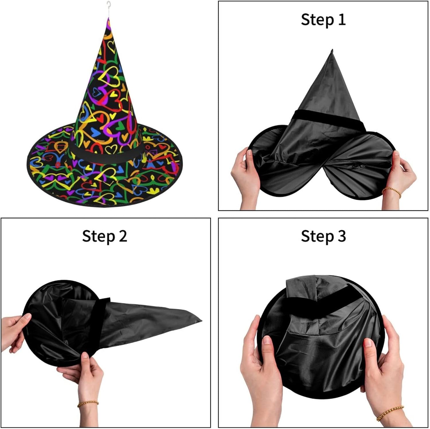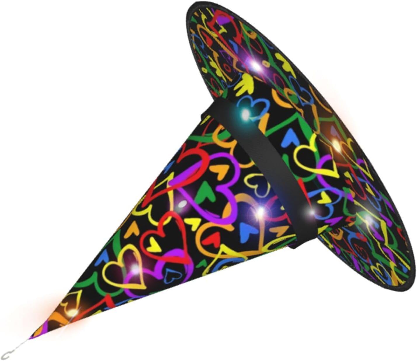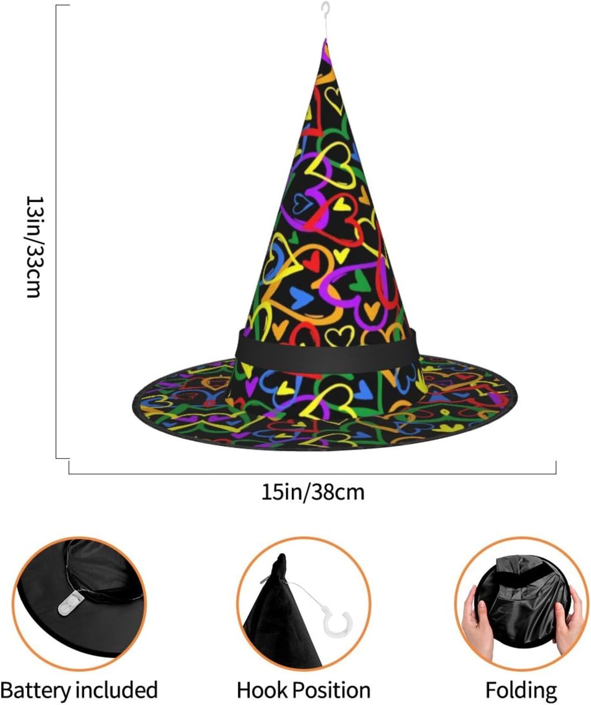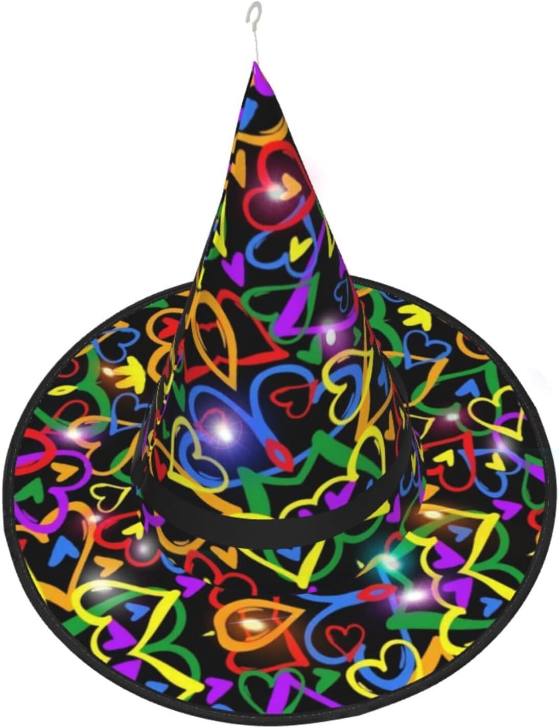 Gay Pride Rainbow Aggiungi un tocco stravagante al tuo costume con il nostro incantevole cappello da strega, l'accessorio perfetto per una varietà di eventi festivi e divertenti. Presenta un accattivante design a stampa completa ed è realizzata in morbido tessuto Oxford resistente. Design intelligente, la parte superiore del cappello può essere ridotta e la tesa attorcigliata e piegata per risparmiare spazio, rendendolo portatile e facile da trasportare. Una delle sue caratteristiche distintive è la stringa luminosa interna a LED che si illumina per creare un'atmosfera magica. Comodamente, il cappello può anche essere appeso come decorazione utilizzando il gancio sulla parte superiore. Indossa questo affascinante cappello da strega alla tua prossima festa, carnevale o evento di Halloween e diventa il centro di attrazione. Nonostante le sue grandi dimensioni, è leggero, il che lo rende comodo da indossare o trasportare senza sentirsi appesantito. Rendi le tue occasioni speciali con il nostro incantevole cappello da strega!