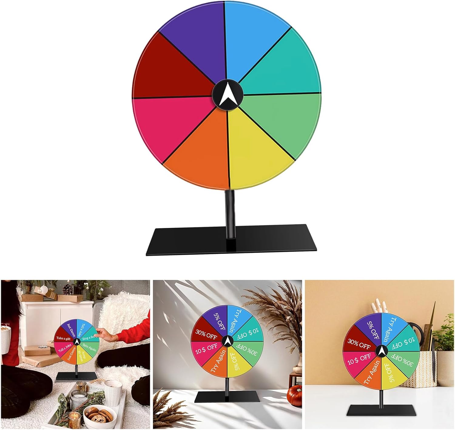 Per varie occasioni come spettacoli, carnevale, feste di compleanno, serate di gioco in famiglia e persino promozione del supermercato, aggiungendo eccitazione a qualsiasi evento Realizzata con materiali, questa ruota per roulette vanta una rotazione fluida grazie al suo rotolamento e al cuscinetto piano, garantendo giri ogni volta Per gli appassionati di feste, educatori e organizzatori di eventi cercano un modo coinvolgente per distribuire premi o ricompense durante le riunioni Personalizza il tuo con le divisioni modificabili a forma di ventaglio arcobaleno, permettendoti di personalizzare premi o premi per adattarsi a diversi stili di gioco Divertiti con i nostri giradischi da tavolo, dispone di una base robusta per stabilità e un uso prolungato per l'apprendimento e il gioco delle feste
