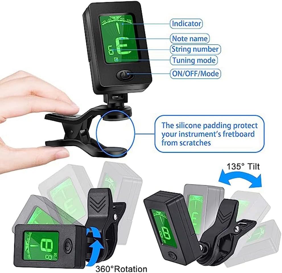 Mantieni accordati i tuoi strumenti: accordatura in pochi secondi! È possibile scegliere diverse modalità: C: cromatico, G: chitarra, B: basso, V: violino e U: ukulele, che è facile cambiare modalità tra diversi strumenti a corda, questo accurato accordatore per chitarra sarà il tuo grande aiuto e otterrà il tuo amato strumenti accordati in pochi secondi. Nessun ronzio per la massima tranquillità: molla in acciaio con memoria interna, può regolare e controllare con precisione la tensione sul per garantire che la adeguata venga al manico della chitarra per un'intonazione ronzii prestazioni a qualsiasi tasto. Morbido cuscinetto in silicone per fornire e alla fatica, protegge la tua preziosa chitarra da graffi o danni. Un accessorio per chitarra indispensabile per i chitarristi: il regalo per insegnanti di musica per chitarra, musicisti professionisti e principianti. Include 1 accordatore a clip, 1 , 6 plettri per chitarra di diversi colori, 1 porta plettro per chitarra. Funzionamento facile e sgancio rapido: questo per chitarra è progettato con un design leggero, portatile ed ergonomico, che consente di agganciare la chitarra sforzo. Nel frattempo, il design a molla del consente ai chitarristi di rilasciare in pochi secondi e riposizionarsi a una velocità molto elevata. Compatibile con chitarre con stile u, stile v o stile c, è progettato per chitarra elettrica, chitarra acustica, basso. da usare: il sintonizzatore con ampio display a colori LCD leggibile ti consente di leggere in pochi secondi sforzo, l'operazione con un ti risparmiare un sacco di tempo per più pratica. Design della clip rotazionale con vista multi-angolo a 360 gradi per la migliore visibilità.