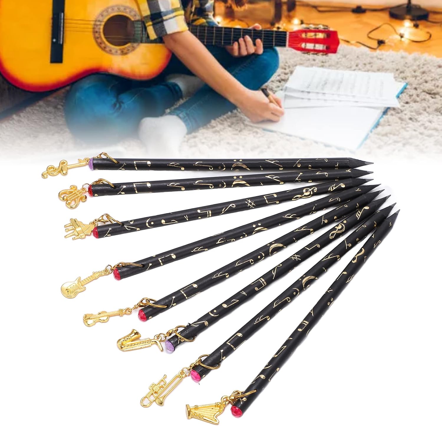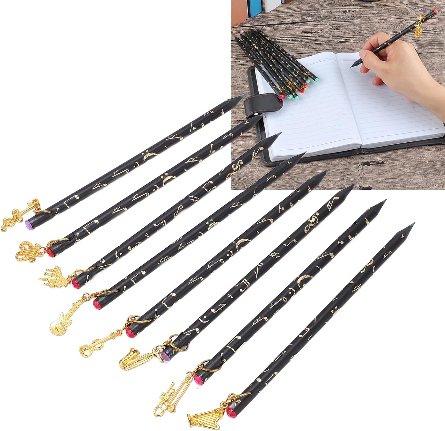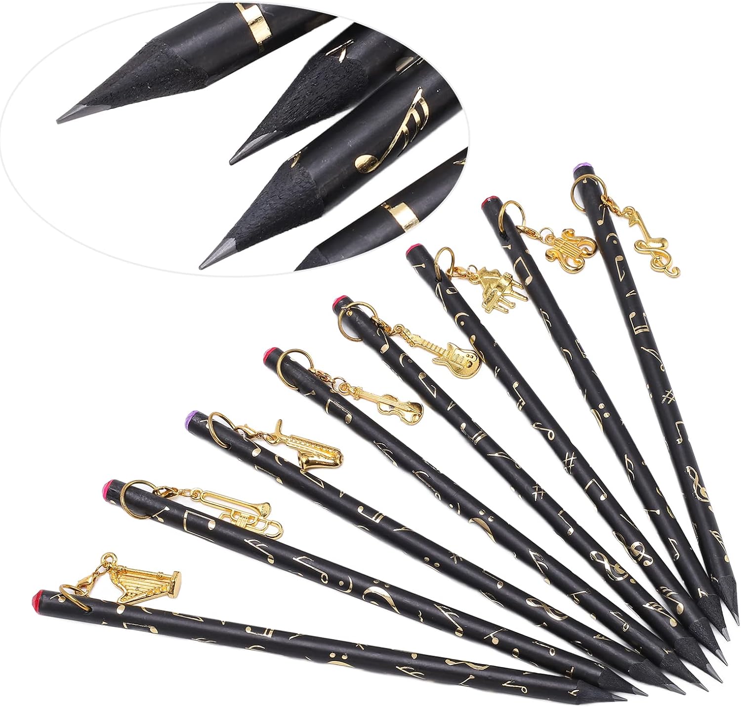[Ampia quantità] - Con 8 matite in totale, questo set offre un'offerta abbondante per tutte le tue esigenze di scrittura, assicurandoti di non esaurire mai. [Manipolazione senza sforzo] - Il design leggero e sottile di queste matite offre una maniglia confortevole, consentendo una scrittura facile e ininterrotta. [Affascinante ciondolo] - Ogni matita è decorata con un ciondolo unico, che presenta una bellissima finitura in metallo che aggiunge un tocco di eleganza alla tua collezione di articoli di cartoleria. [Portabilità pratica] - Fatte con materiali premium, queste matite compatte occupano un minimo di spazio, il che li rende senza sforzo per il trasporto nella borsa o nella tasca. [Universal ] - Adatto a bambini e adulti, questi pastelli ispirati alla musica fanno un per amanti della musica, artisti, studenti o chiunque apprezzi l'arte della scrittura.