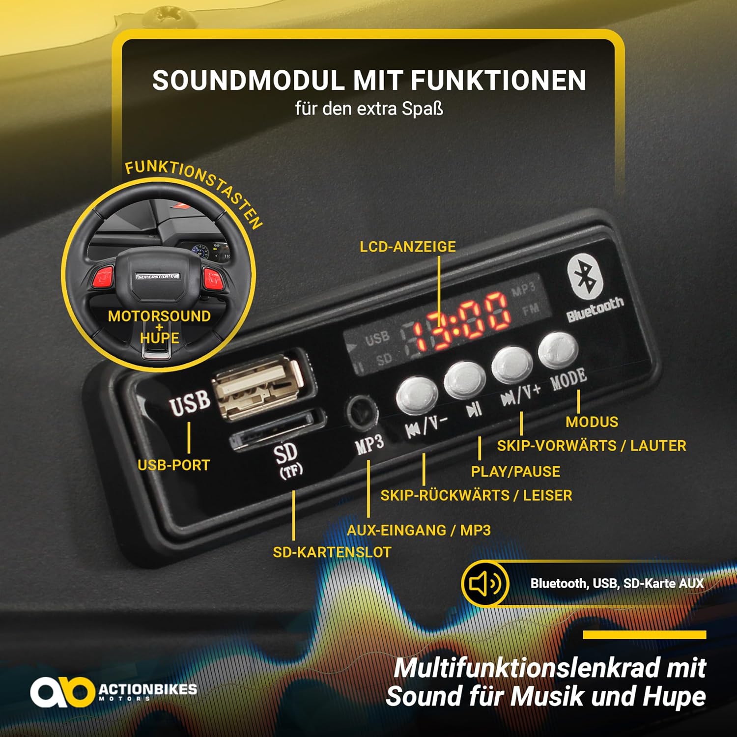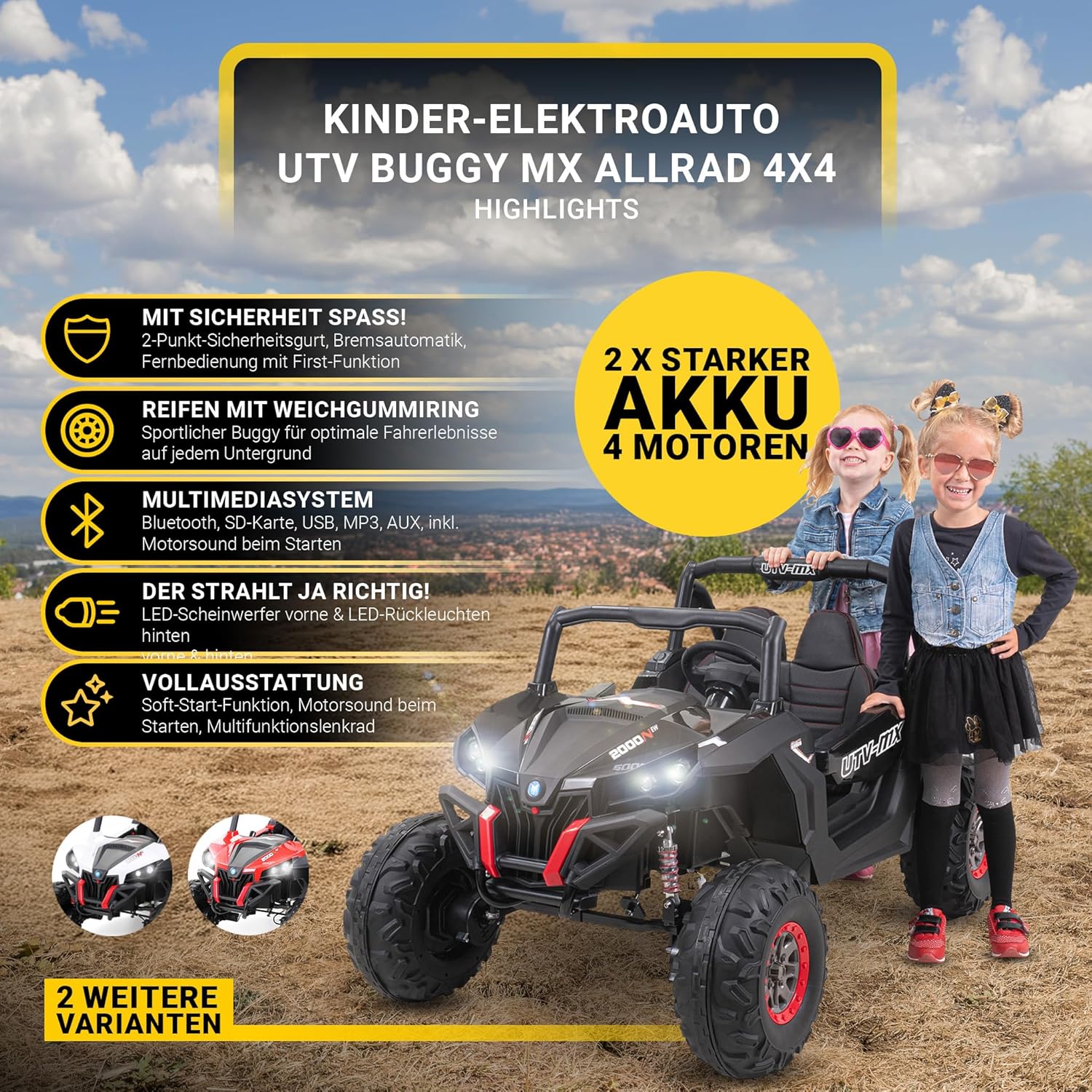 Comodo biposto con sedili in ecopelle per i più piccoli Avventurieri - ideale per bambini dai 3 ai 7 anni, perfetto per viaggi condivisi su qualsiasi terreno! 𝐒𝐢𝐜𝐡𝐞𝐫 𝐮𝐧𝐭𝐞𝐫𝐰𝐞𝐠𝐬 👨👩👧 Con cintura di sicurezza, frenata automatica e avviamento dolce grazie all'avviamento morbido, il passeggino offre il massimo livello di sicurezza in ogni viaggio - ideale per i bambini. Mantieni la prima funzione con il telecomando da 2,4 GHz che include la prima funzione. Genitori sempre in controllo: ideale per guidatori più giovani o situazioni pericolose. 🔋 Due batterie da 12 V, quattro motori da 12 V con 35 watt ciascuno forniscono una vera potenza fuoristrada: la trazione integrale commutabile domina le pendenze e i terreni irregolari senza sforzo! 🎶Bluetooth, MP3, USB, AUX e SD: con molte funzioni audio, i bambini possono ascoltare la loro musica preferita direttamente durante la guida, controllata tramite il fantastico volante multifunzione.