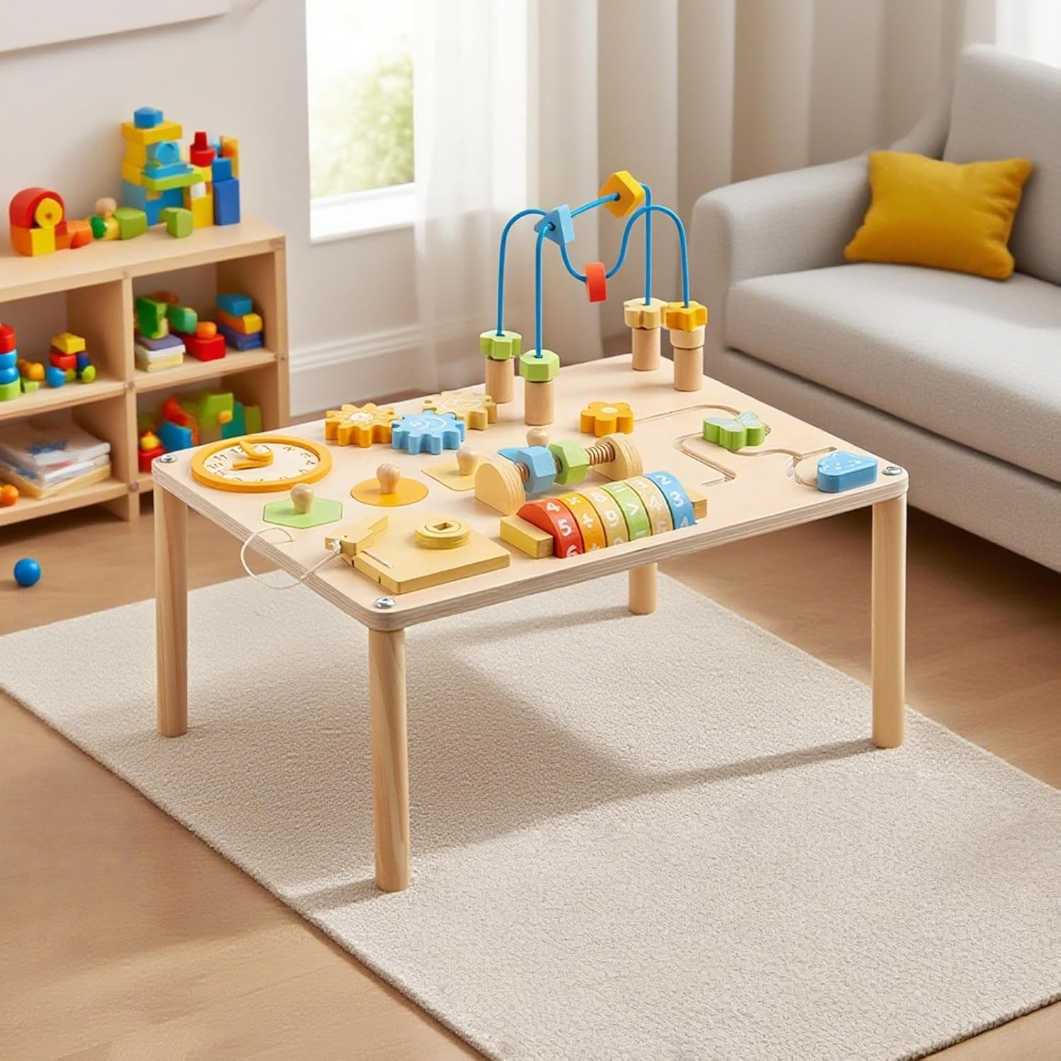 Multi-Activity Table: Combines shape sorting, bead maze, and other hands-on features to encourage interactive learning through movement and touch, enhancing hand-eye coordination, fine motor development, and critical thinking in preschoolers Educational Toy Design: Crafted with early learning in mind to teach colors, shapes, and patterns while promoting logical reasoning and spatial awareness, ideal for use in classrooms, home playrooms, or daycare environments for curious learners -Inspired Learning: Encourages self-directed play with engaging, natural materials and open-ended activities that with principles, allowing kids to explore, build focus, and strengthen independence through sensory play Sturdy Wooden Build: Made from high-quality, wood with smooth edges for safety, this table durability for daily use in busy daycare centers or homes, while maintaining a visually appealing and classic aesthetic parents love Ideal Group Play: Designed for shared play among multiple children to foster social interaction, cooperative play, and communication skills, making it a valuable addition to preschool classrooms, sibling play areas, and early childhood centers Ask ChatGPT