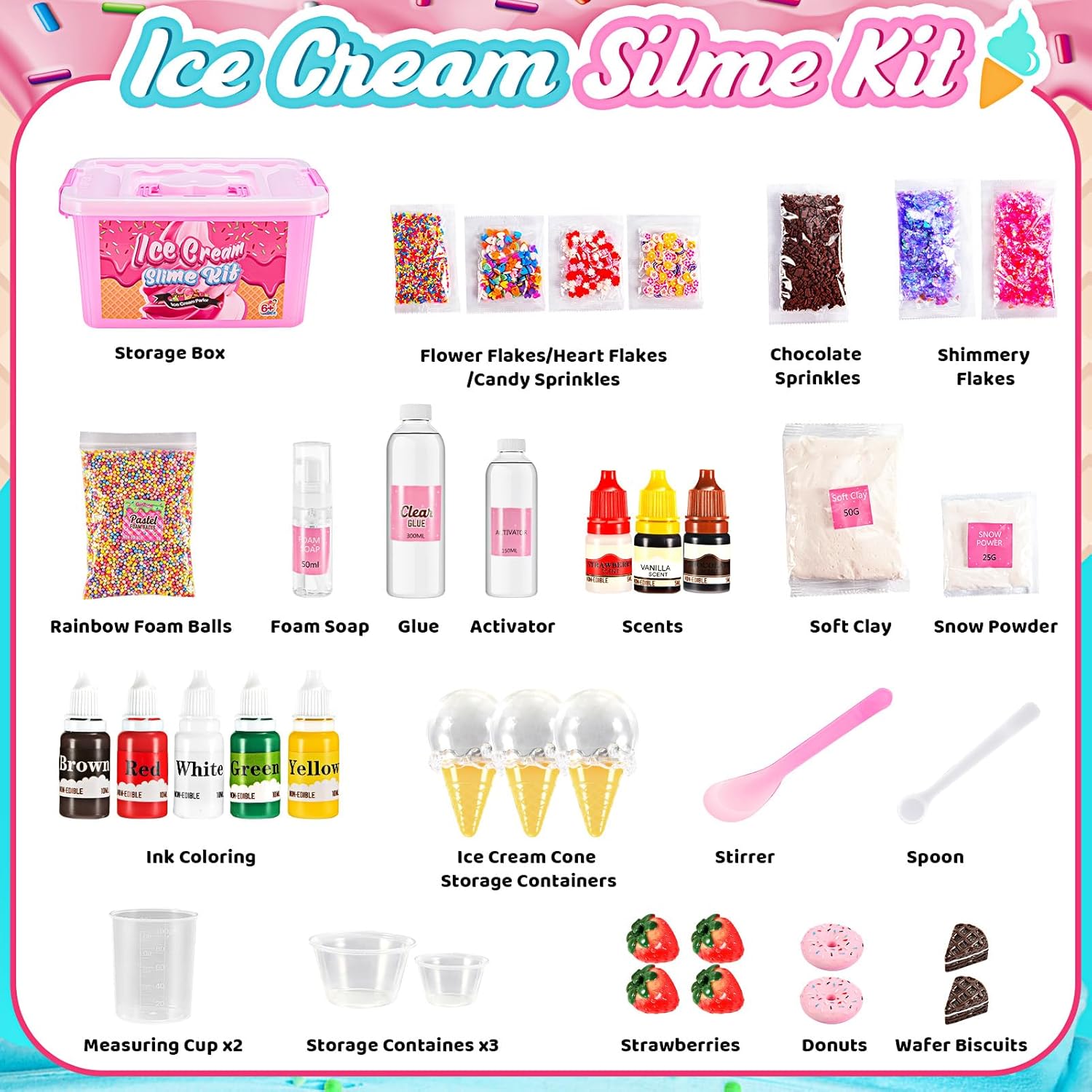 【Kit Slime Fai da te】Il Kit Slime Gelato (44 pezzi) è stato progettato appositamente per creare slime soffici e morbidi, con 5 colori, 3 esaltatori di sapidità, polvere di neve, slime, palline di schiuma, pezzi colorati e caramelle da scegliere. I bambini possono creare centinaia di tipi diversi di slime e realizzare il sogno di creare il proprio gelato! 【Miglioramento del Rapporto Genitori-Figli】La creazione di slime può soddisfare le esigenze di arte fai-da-te di adulti e bambini. Aumenta il tempo di interazione genitori-figli e coltiva le emozioni genitori-figli. I set di melma sono l'attività perfetta per trascorrere il tempo creativo fai-da-te a casa e un giocattolo per alleviare lo stress. 【Fantasia e Gioco Sensoriale】Il gioco sensoriale con la nostra melma Fluffy permette ai bambini di imparare attraverso il gioco immaginativo, liberare la loro creatività e sviluppare la coordinazione occhio-mano. 【Sicuro e Non Tossico】Tutti gli slime e gli accessori sono realizzati con materiali atossici e di alta qualità, sicuri sia per i bambini che per gli adulti. Abbiamo anche 6 contenitori ermetici per conservare lo slime e impedire che si secchi. I contenitori sono lavabili e riutilizzabili. Consigliato per bambini dai 6 anni in su! 【Perfetto Regalo Fatto a Mano】Un grande kit di slime per ragazze e ragazzi di 6 7 8 9 10 11 12 anni e un regalo perfetto per qualsiasi bambino che ama i kit di slime e vuole esplorare la propria creatività. È un ottimo regalo per compleanni, Halloween, Natale, Pasqua, ricompense scolastiche, bomboniere per feste e qualsiasi occasione che offra ore di divertimento e intrattenimento.