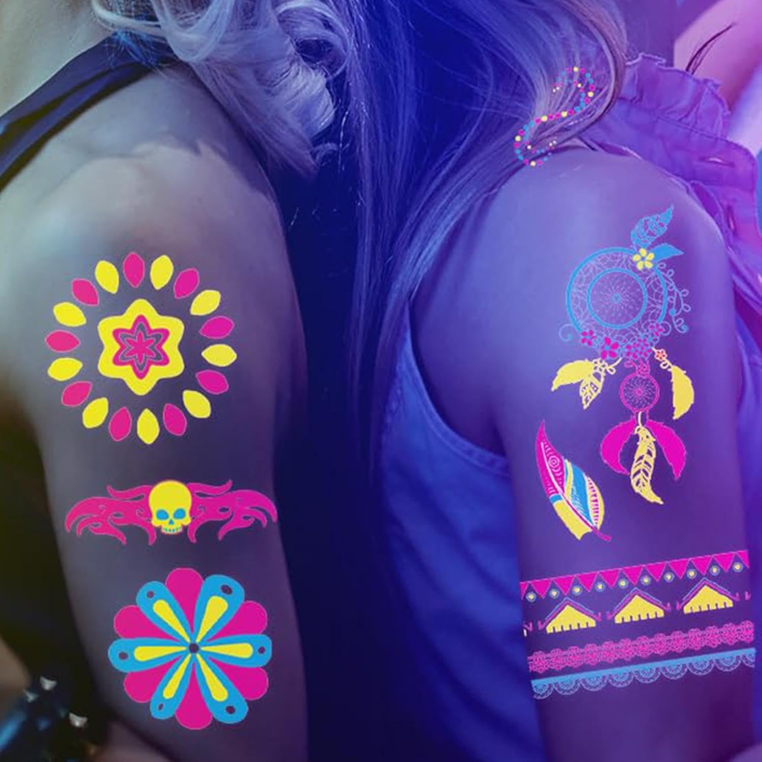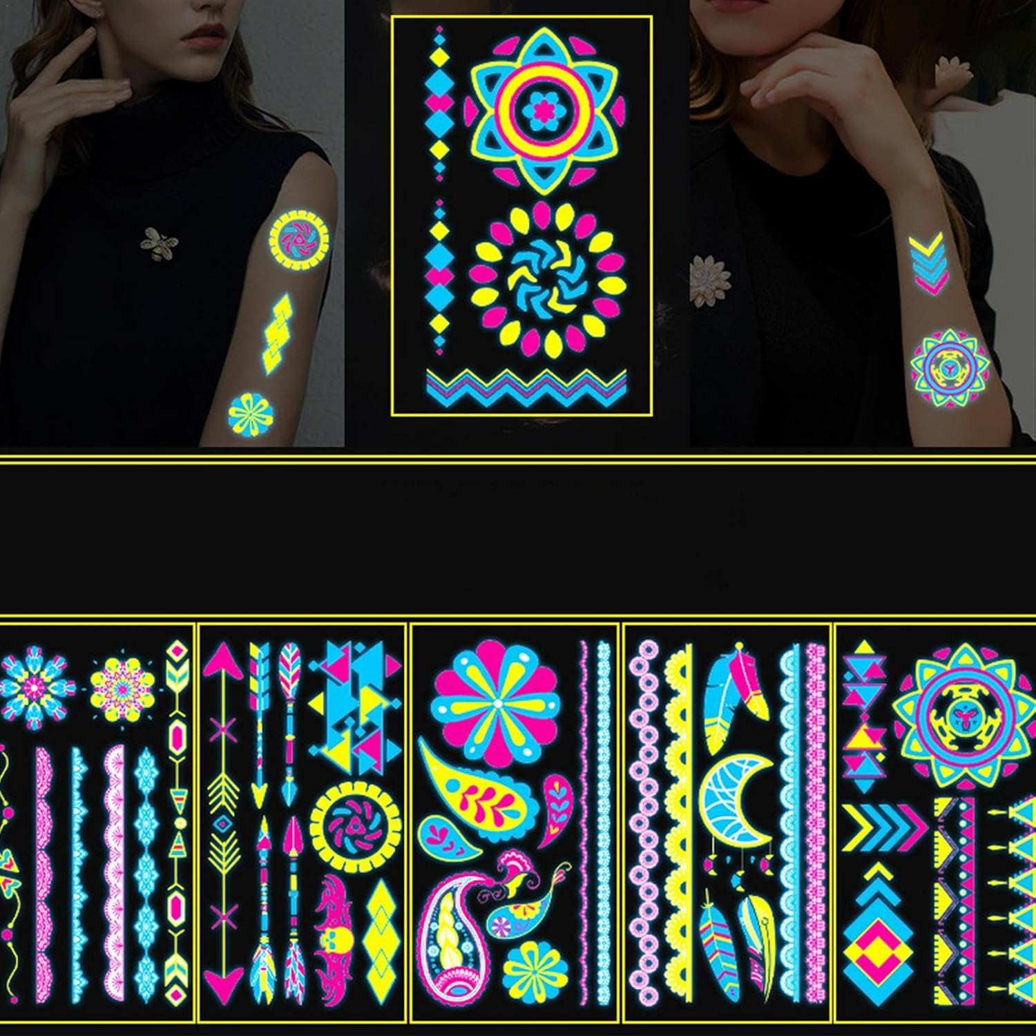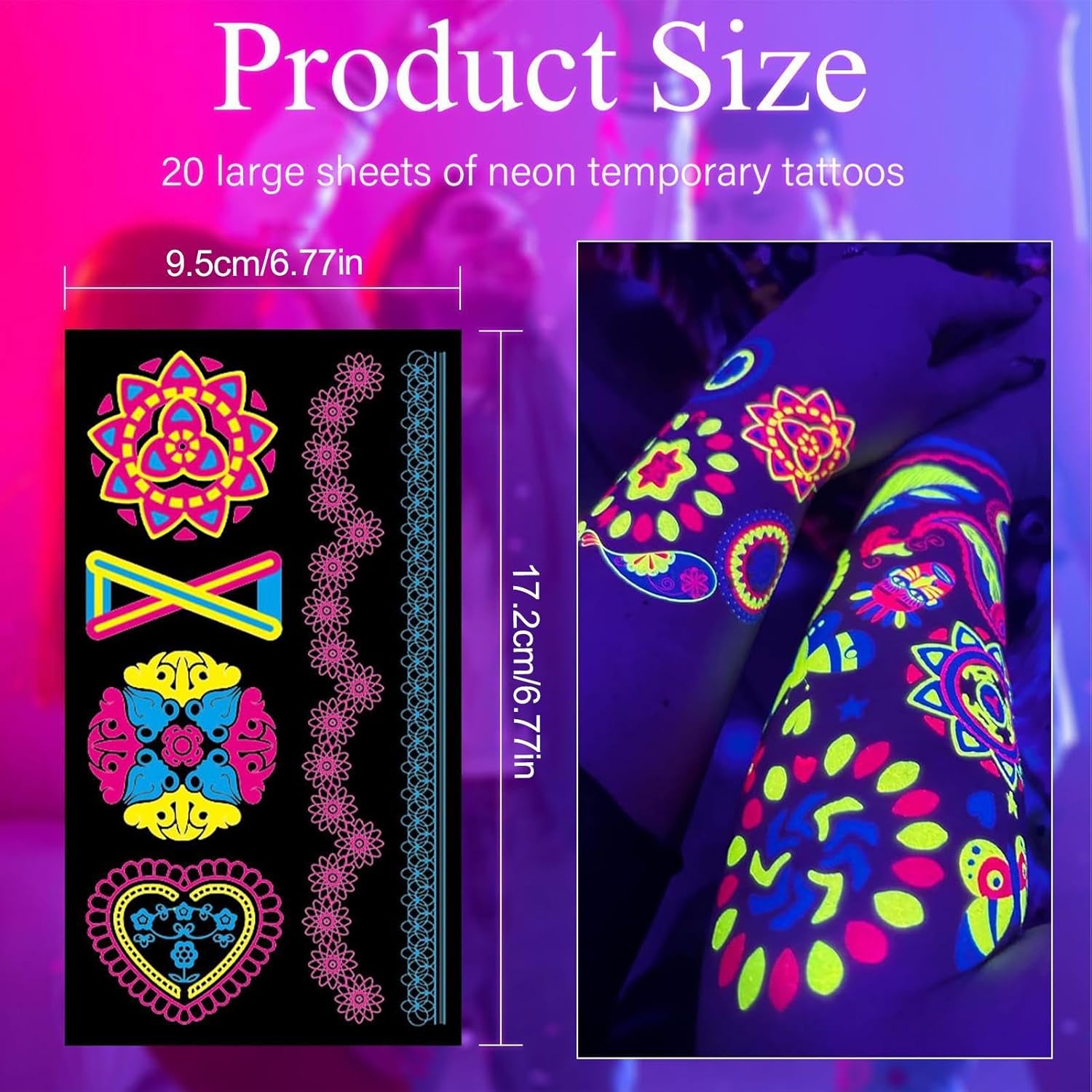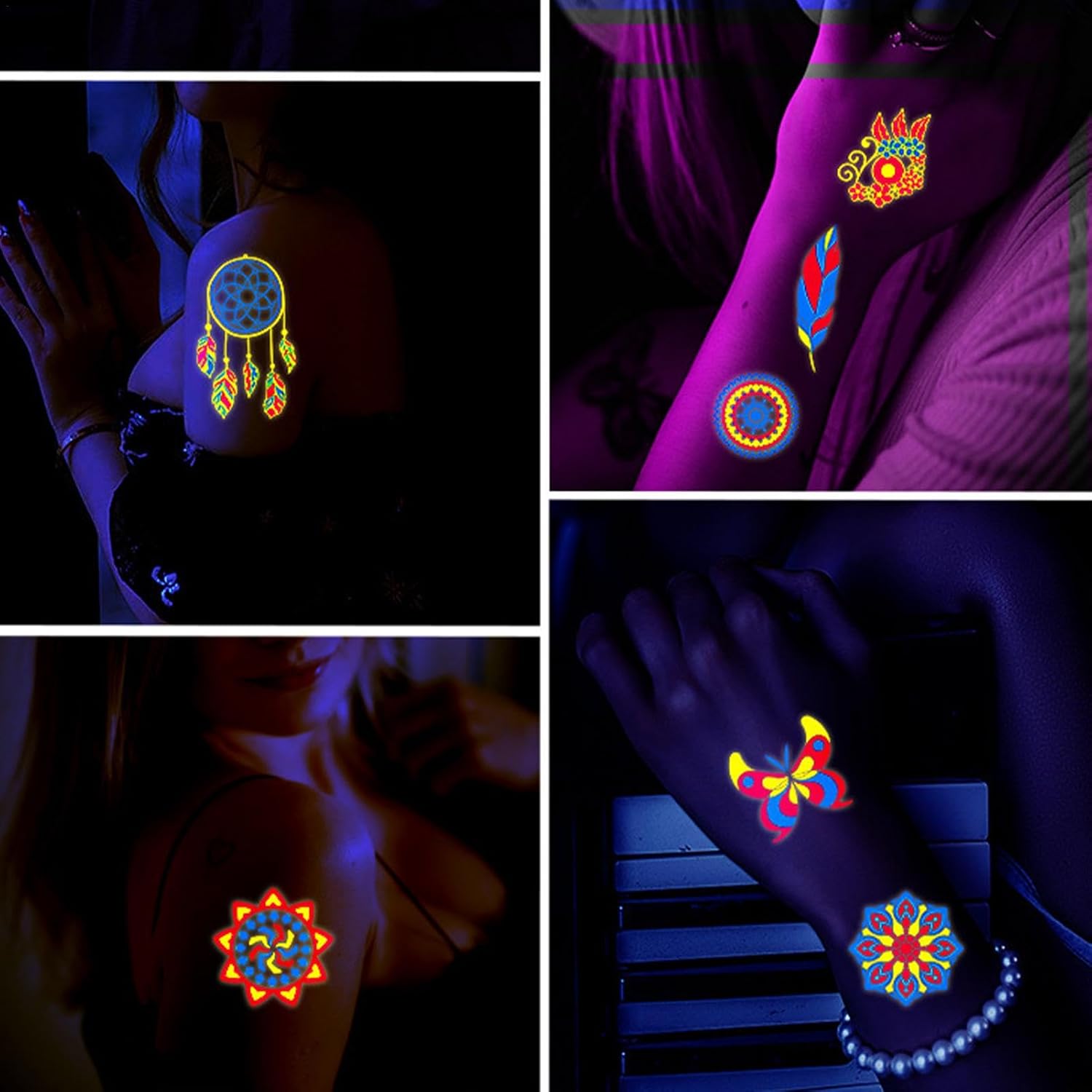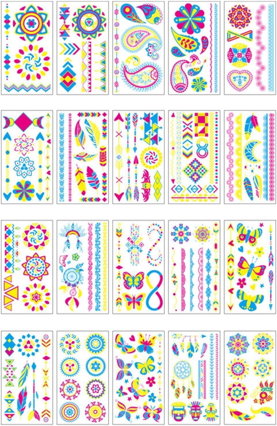 Ricche scelte: abbellisci la tua creatività con il nostro pacchetto ideale di adesivi luminosi. Con 20 fogli e 170 stili unici, questi adesivi sono ricchi di varietà e vivacità e brillano brillantemente sotto luci nere, blu, neon, UV e altre. Ottieni una trasformazione temporanea ma abbagliante. Abbagliamento vibrante: dai vita a qualsiasi spazio con i nostri adesivi luminosi che creano un'atmosfera accattivante con i loro vivaci colori al neon. Questi adesivi interattivi si illuminano al buio, rendendoli perfetti per feste ed eventi per abbellire la tua stanza con uno straordinario effetto visivo che sicuramente impressionerà! Comodo da usare: ottieni un bagliore affascinante con i nostri adesivi luminosi fustellati. Non c'è bisogno di colori noiosi, vernici per il trucco. Bagnalo semplicemente con acqua, strappa la pellicola protettiva, attaccalo alla pelle e attendi 10. Ampia gamma di applicazioni: crea un bagliore mistico con questi adesivi fluorescenti, perfetti per una miriade di occasioni come feste a luci nere nel parco con trampolino, festival musicali, corse notturne popolari, balli scolastici, feste di compleanno, eventi annuali ed eventi di danza a luci nere. Un must per le feste: trasforma le tue feste in piscina e in spiaggia con i nostri adesivi luminosi. Prova gli adesivi delicati sulla pelle, impermeabili e resistenti al sudore che utilizzano pigmenti di inchiostro vegetale per una brillantezza duratura di 2-5 giorni.