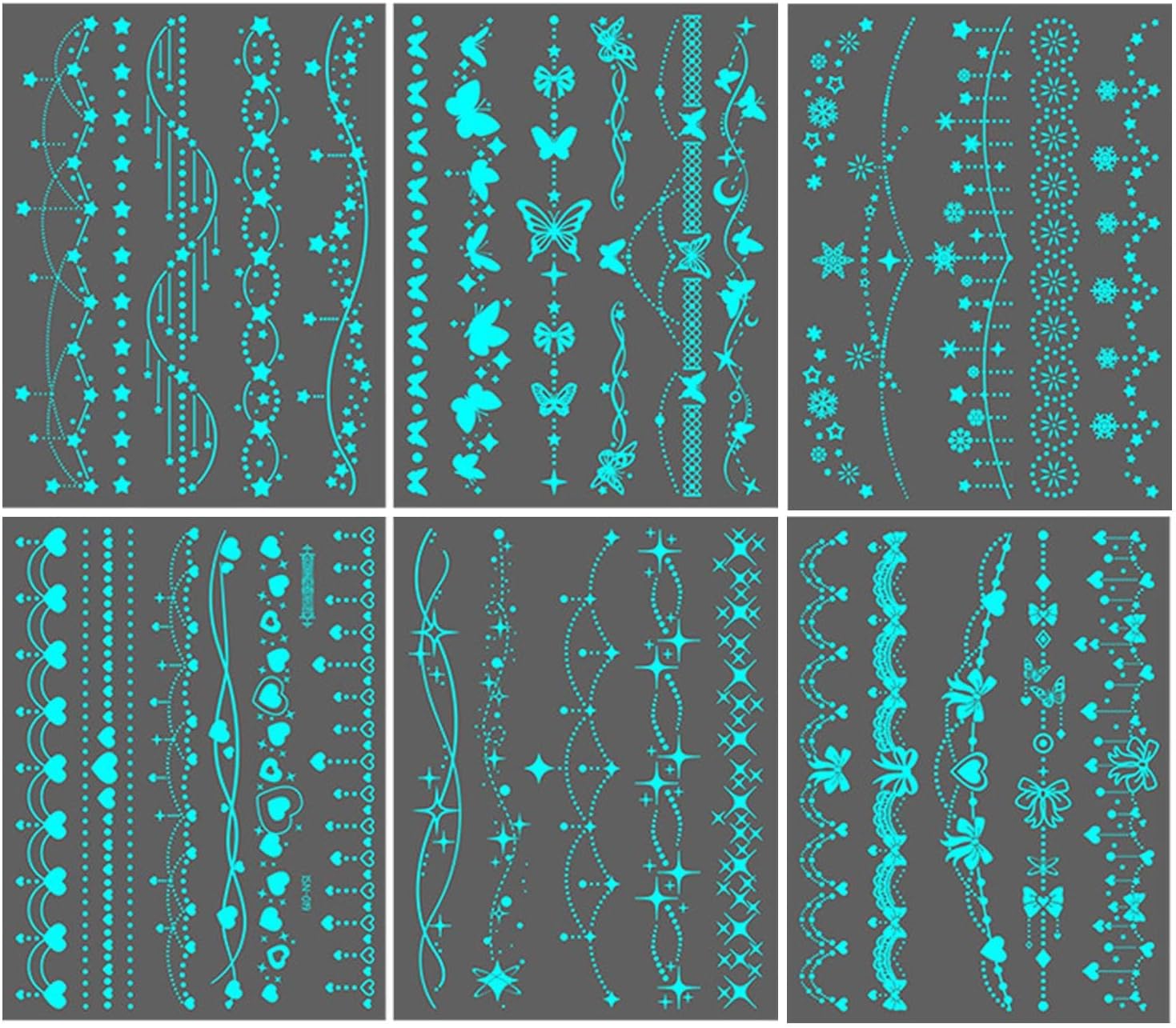 Accessori divertenti di gruppo: ravviva gli eventi sociali con accessori per feste luminose, adesivi impermeabili per attività di gruppo e design personalizzati, ideali per esperienze indimenticabili in ogni celebrazione Progetti che attivano la luce: incentivate la creatività con gli adesivi che attivano la luce. Ideale per il corpo luminoso e accessori per feste in decorazioni artistiche fluorescenti. Effetto luminoso al buio. Motivi della pelle ispirati alla natura: una miscela di design temporanei naturali ed eleganti, perfetto per una body art espressiva che serve diversi gusti e arricchisce artisticamente gli abiti di tutti i giorni Multiuso: ideale come decorazione luminosa per festival e decorazione per strumenti. Questi adesivi luminosi consentono un design creativo, aderiscono in modo affidabile a diverse superfici e sono perfetti per feste come l'uso quotidiano. Arte della pelle durevole: la tecnologia acquosa permette una presa affidabile senza lasciare residui. Queste decalcomanie temporanee semplificano l'applicazione e la rimozione per motivi del corpo di lunga durata con un effetto di colore uniforme. Ideale per creare gioielli flessibili.