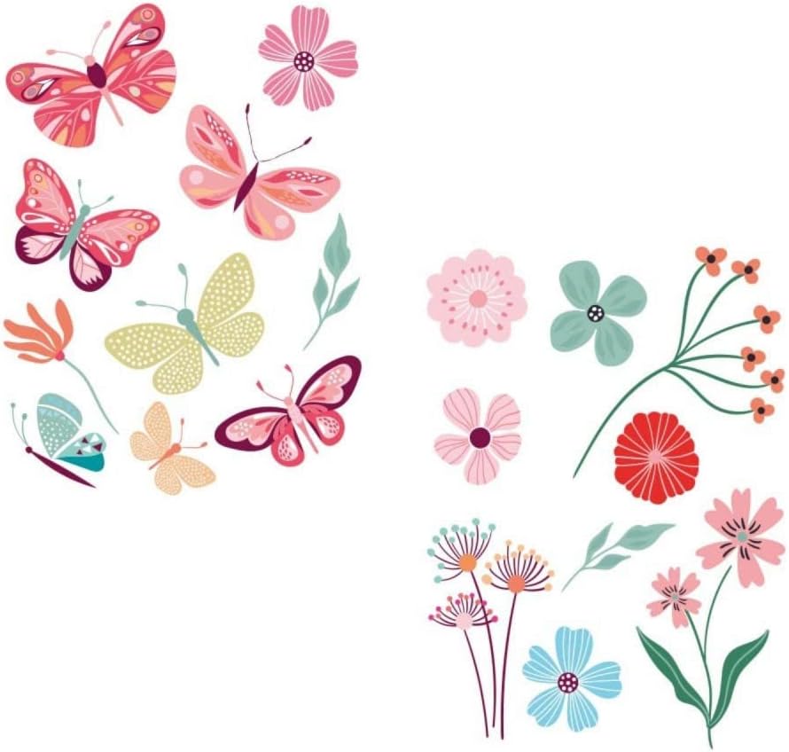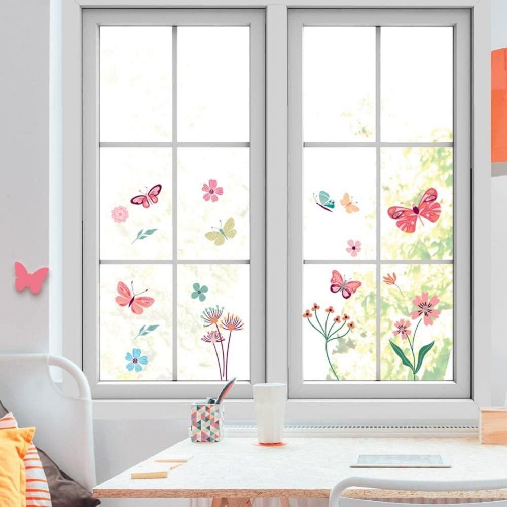 Adesivi elettrostatici, pretagliati, per vetri puliti e asciutti. Include 2 tavole. Dimensioni: 40 x 30 cm. Illustrazione originale con farfalle colorate