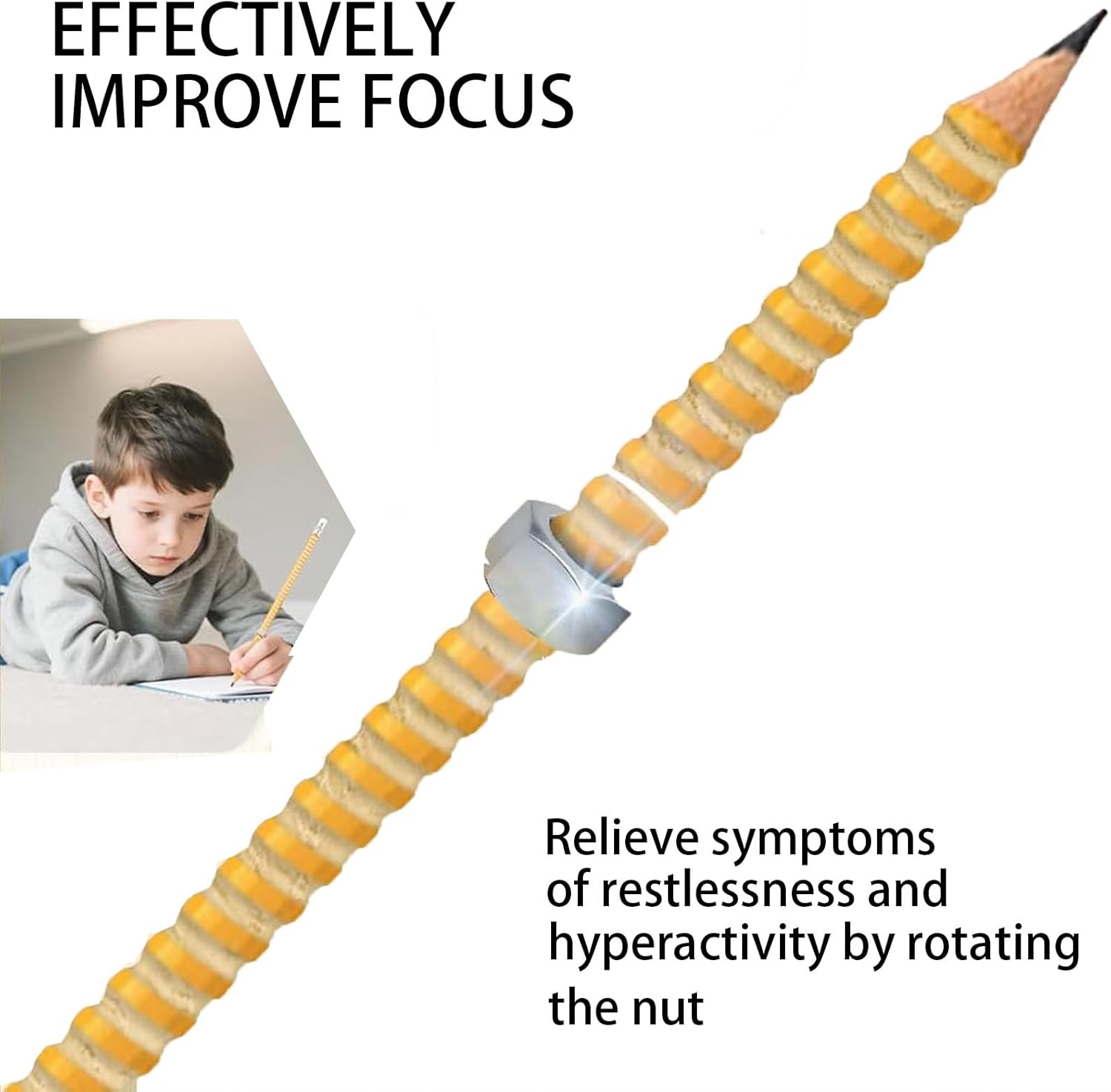 Focus Aid: progettata per migliorare la concentrazione, la matita filettata presenta una struttura a dado scorrevole integrata. Questo feedback tattile aiuta a ridurre l'ansia e l'irrequietezza del corpo, promuovendo la concentrazione durante le attività. Struttura durevole ed ergonomica: realizzata con materiali di alta qualità, questa matita offre durata e comfort eccezionali. Il nucleo liscio in grafite garantisce una piacevole esperienza di scrittura, ideale per l'uso quotidiano. Aumenta l'efficienza: il dado rotante mantiene le mani impegnate, rilasciando energia in eccesso migliorando la concentrazione durante la scrittura, la lettura o gli esami. È uno strumento silenzioso per alleviare lo stress e la produttività delle attività. Classroom Ready: con bordi arrotondati e un design silenzioso, questa matita è perfetta per ambienti didattici. Permette una scrittura fluida senza distrazioni, aiutando a mantenere la concentrazione durante le lezioni. Compatta e portatile: le dimensioni compatte della matita si adattano facilmente a qualsiasi astuccio, rendendola perfetta per l'uso in movimento. Rimani concentrato a casa, in ufficio o ovunque tu abbia bisogno di essere produttivo.