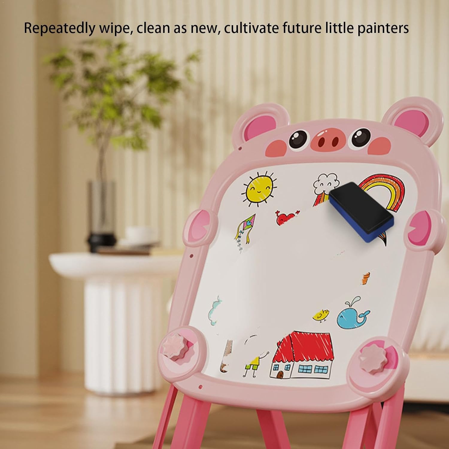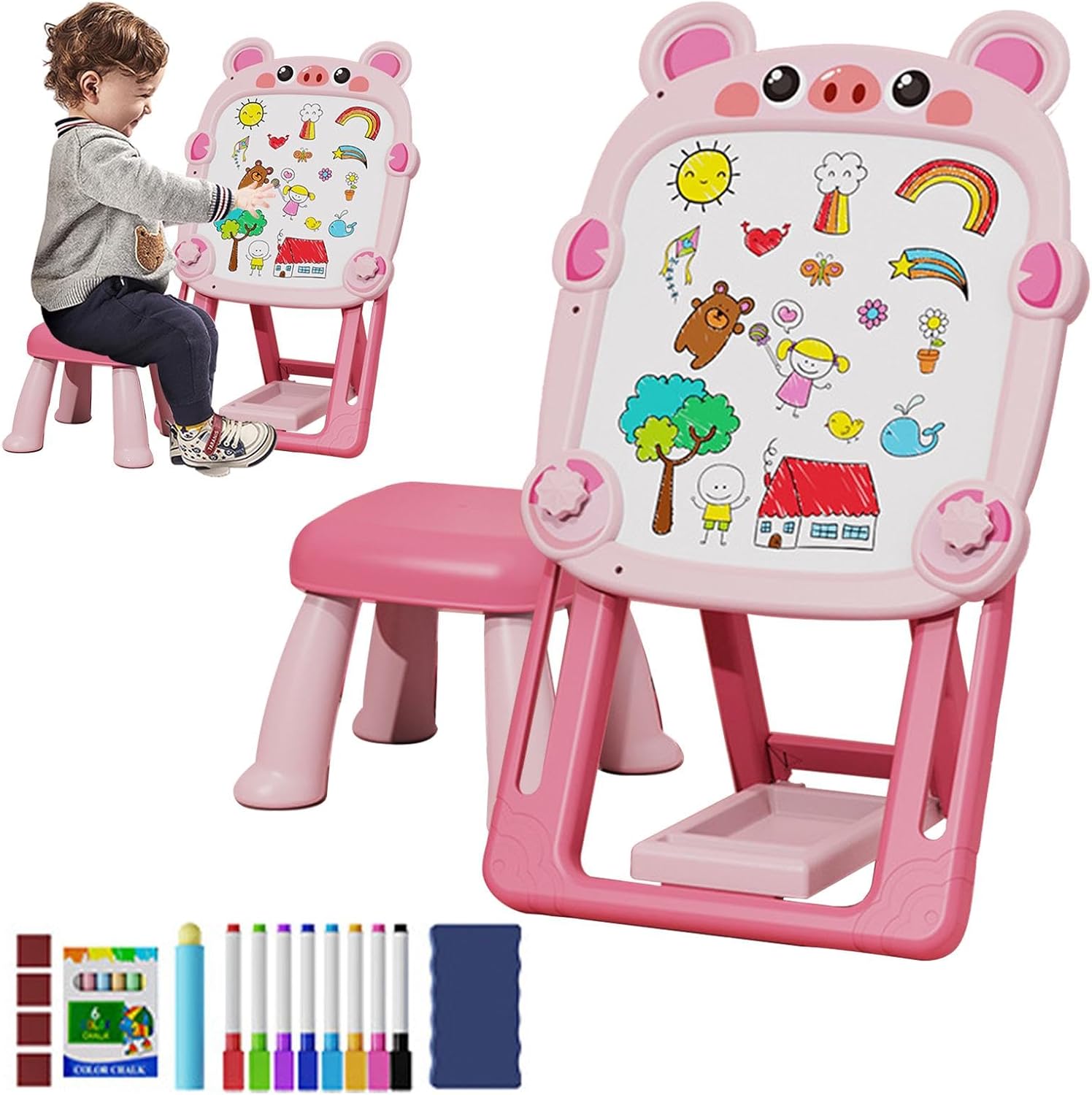 Double-Sided Fun for Endless Creativity: This versatile drawing board two surfaces, as a whiteboard and the other as a chalkboard, giving kids multiple options for creative expression Whether they’re drawing with markers or chalk, it’s perfect for various projects Adjustable & Easy to Use: Designed with an adjustable height feature, this drawing board can grow with your child, providing the perfect height for and older kids alike The foldable stand makes it easy to store and move around Magnetic Chalkboard for Learning & Play: The magnetic is perfect for interactive play, allowing children to use magnetic letters, numbers, and shapes It enhances both creative and educational activities, making learning fun Portable & Space-Saving Design: The foldable design allows easy storage and portability, making it perfect for playrooms, classrooms, and travel It’s a practical and fun addition to any child’s environment Perfect for Kids’ Creativity & Development: Ideal for kids aged 3+, this drawing board encourages fine motor skills, creativity, and early learning It provides a great outlet for artistic expression while improving hand-eye coordination