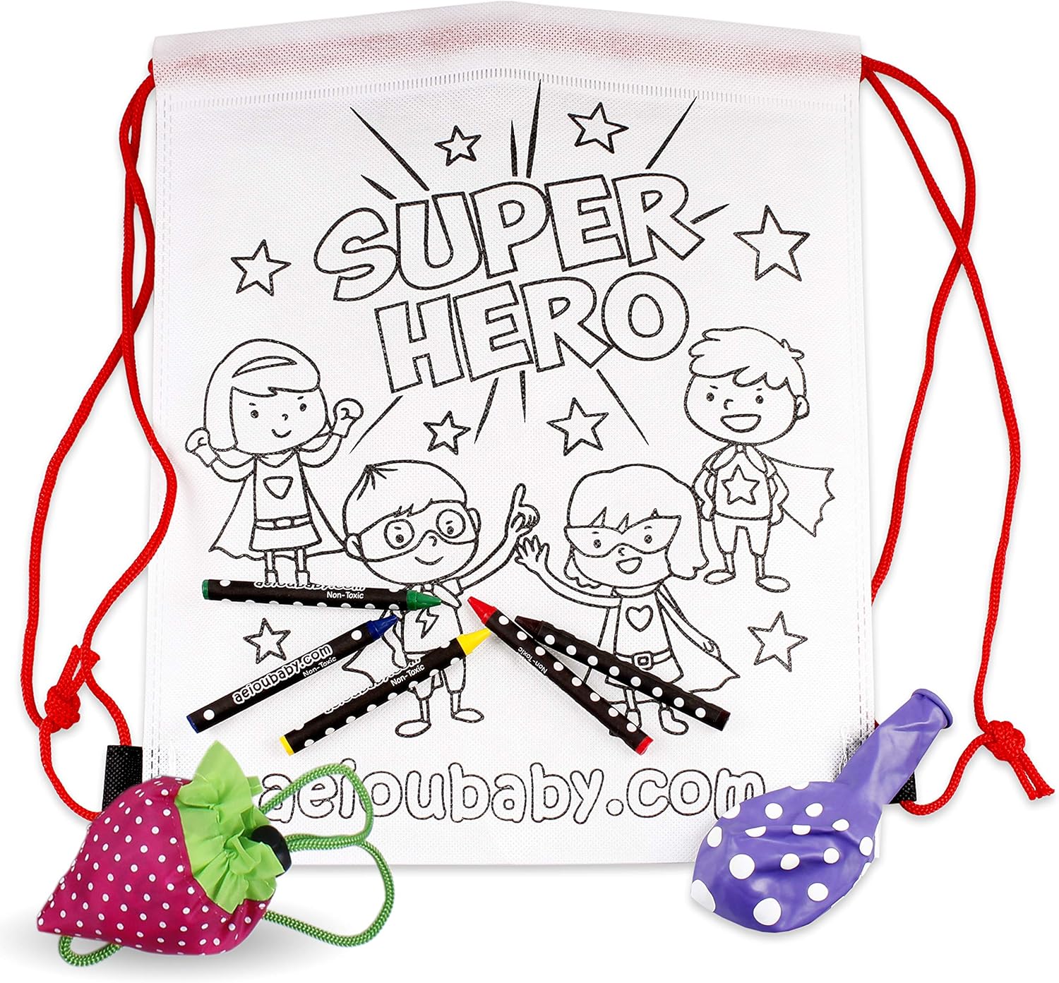 aeioubaby.com 25 Zainetti da Colorare + Borsa Riutilizzabile | 25 Bustine singole con 5 Colori a Cera e un Palloncino | Regalo per bambini per le feste e i compleanni (Eroi)