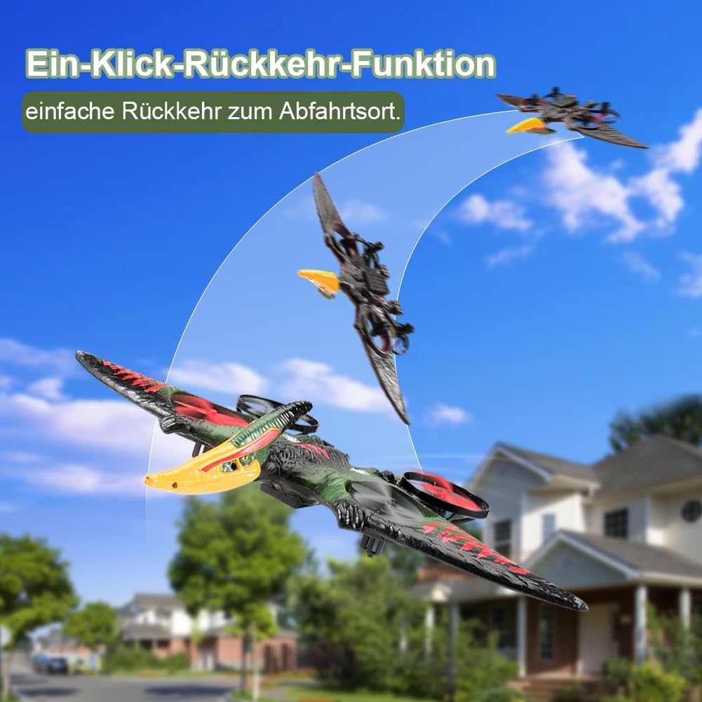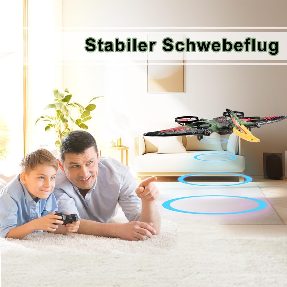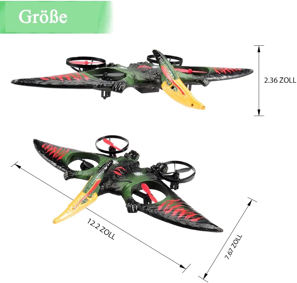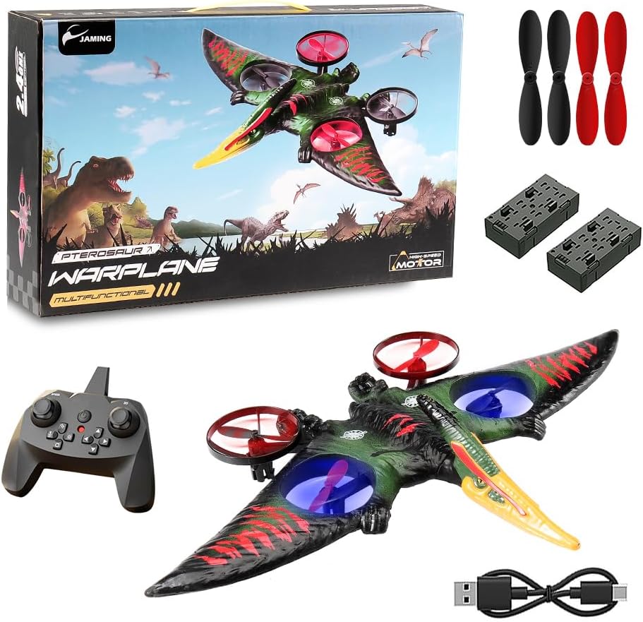 Facile da pilotare: giroscopio a sei assi, sistema autostabilizzante, facile da controllare; dotato di una varietà di esperienze di controllo con un solo pulsante, un tasto per decollare, atterrare, ritornare, senza bisogno di un controllo ingombrante, per sperimentare sempre e ovunque un funzionamento intelligente, facile da volare, molto adatto a principianti e bambini Abilità uniche: 2,4 Ghz, può essere giocato da molte persone contemporaneamente e non si disturberà a vicenda durante il volo; Altitudine fissa della pressione atmosferica, in modo che l'aereo possa librarsi stabilmente; una chiave per girare in 3D; una chiave per circondare il volo; queste caratteristiche rendono questa simulazione del vero giocattolo da combattimento più perfetta, più per realizzare il sogno dei bambini di volare Aspetto fantastico: questo aereo ha la forma di uno pterodattilo e un design nuovo e unico, questo aereo RC è aggiornato con 4 motori, che non solo rendono il volo più sicuro e stabile, ma hanno anche un aspetto più bello; Questo aereo è inoltre dotato di luci LED colorate per rendere il volo notturno più mozzafiato e, grazie al corpo delicato e ai sensori sensibili, può essere volato in sicurezza sia all'interno che all'esterno RTF: questo prodotto include 1 aereo RC, 1 telecomando, 2 cavi di ricarica, 2 set di eliche, 2 batterie, devi solo installare le batterie per il telecomando e poi potrai lasciare che tuo figlio si diverta a volare. In regalo: questo aereo RC è sia per bambini che per bambini Facile da usare anche per i principianti. Può allenare la coordinazione occhio-mano dei bambini, promuovere l'interazione genitore-figlio, soddisfare i desideri di volo delle persone ed è un regalo eccellente