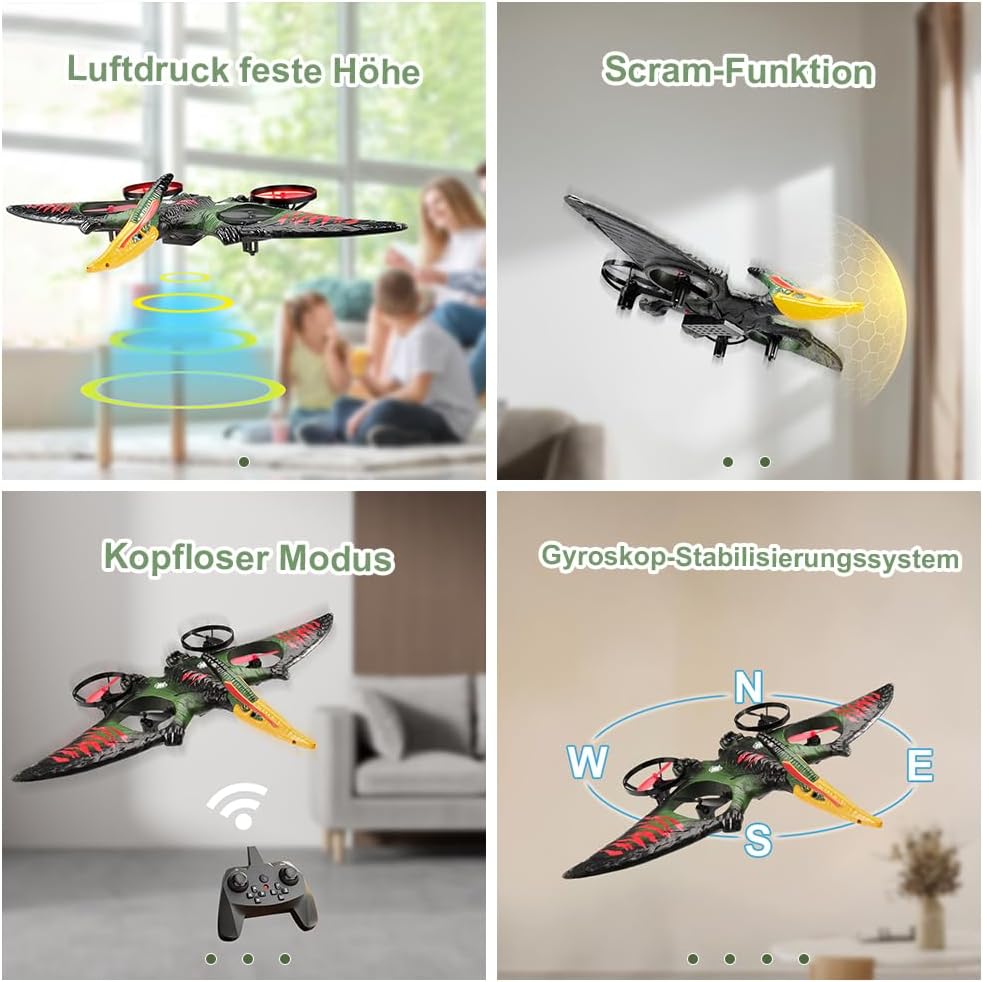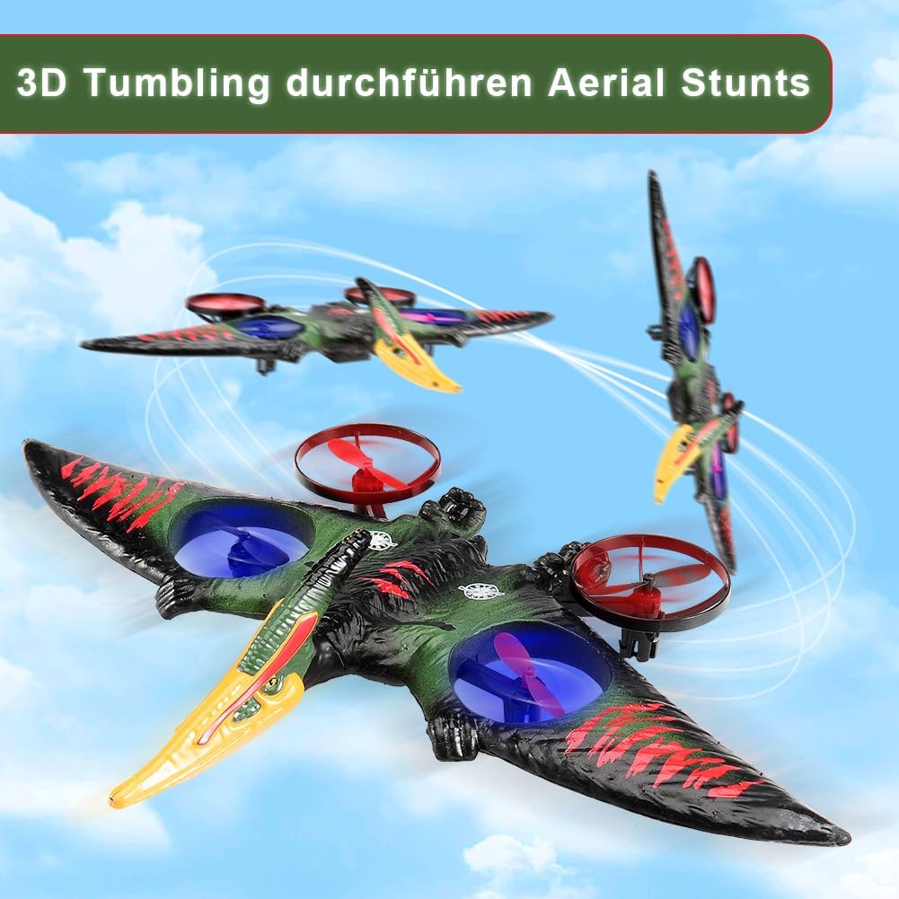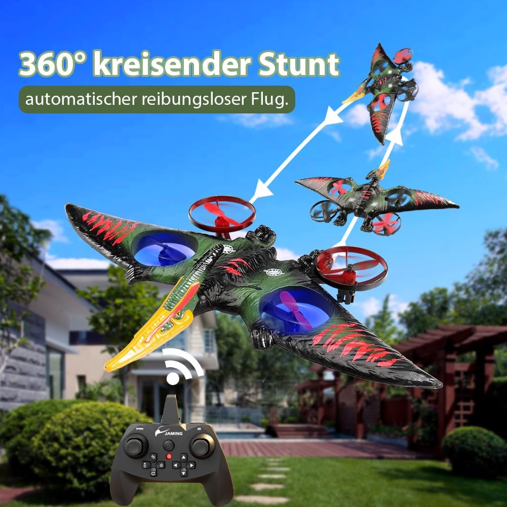 Facile da pilotare: giroscopio a sei assi, sistema autostabilizzante, facile da controllare; dotato di una varietà di esperienze di controllo con un solo pulsante, un tasto per decollare, atterrare, ritornare, senza bisogno di un controllo ingombrante, per sperimentare sempre e ovunque un funzionamento intelligente, facile da volare, molto adatto a principianti e bambini Abilità uniche: 2,4 Ghz, può essere giocato da molte persone contemporaneamente e non si disturberà a vicenda durante il volo; Altitudine fissa della pressione atmosferica, in modo che l'aereo possa librarsi stabilmente; una chiave per girare in 3D; una chiave per circondare il volo; queste caratteristiche rendono questa simulazione del vero giocattolo da combattimento più perfetta, più per realizzare il sogno dei bambini di volare Aspetto fantastico: questo aereo ha la forma di uno pterodattilo e un design nuovo e unico, questo aereo RC è aggiornato con 4 motori, che non solo rendono il volo più sicuro e stabile, ma hanno anche un aspetto più bello; Questo aereo è inoltre dotato di luci LED colorate per rendere il volo notturno più mozzafiato e, grazie al corpo delicato e ai sensori sensibili, può essere volato in sicurezza sia all'interno che all'esterno RTF: questo prodotto include 1 aereo RC, 1 telecomando, 2 cavi di ricarica, 2 set di eliche, 2 batterie, devi solo installare le batterie per il telecomando e poi potrai lasciare che tuo figlio si diverta a volare. In regalo: questo aereo RC è sia per bambini che per bambini Facile da usare anche per i principianti. Può allenare la coordinazione occhio-mano dei bambini, promuovere l'interazione genitore-figlio, soddisfare i desideri di volo delle persone ed è un regalo eccellente