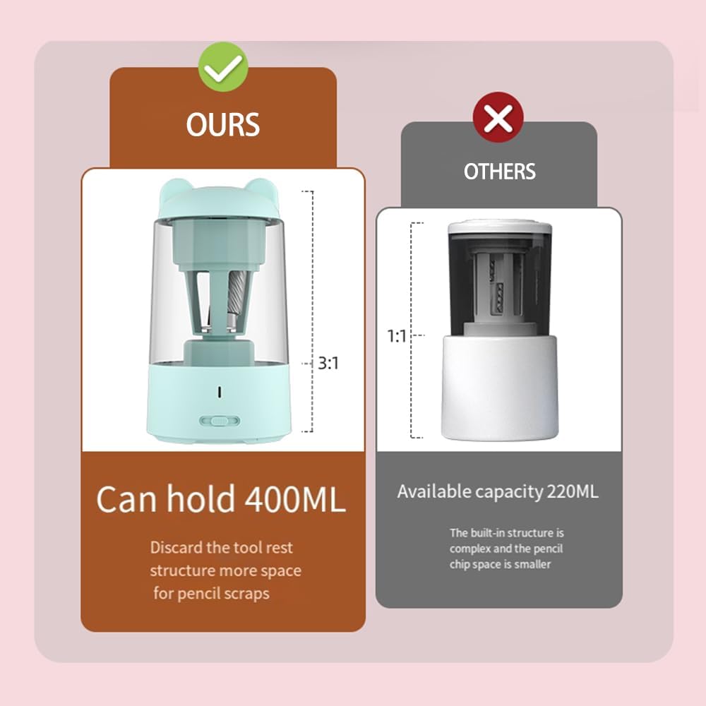 [Automatico e versatile]: questo affiliatore elettrico si rivolge a varie forme di matita tra 6,5 mm-8 mm di diametro, comprese le matite colorate, rendendolo ideale per artisti e studenti. Basta inserire la matita e lasciare che la temperamazione faccia il lavoro. [Numpità regolabile]: scegli tra punte affilate, medie o contundenti con i 3 tipi unici di regolazione della nitidezza. Per diverse esigenze di scrittura e disegno, tra cui affinare le matite di lunghezza 7 cm con facilità. [CARATTERISTICHE DI SICUREZZA]: Prevenire l'eccessiva affilatura con la funzione di arresto automatico che interrompe l'affilatura quando la matita è pronta. Goditi protezioni di sicurezza aggiuntive come lo spegnimento automatico quando il coperchio è aperto e la protezione intelligente dal surriscaldamento. [Alta capacità e pulizia]: mantieni il tuo spazio di lavoro in ordine con il grande contenitore di rifiuti da 400 ml per trucioli a matita e di espulsione automatica di piombo. Ridurre la frequenza di svuotamento del contenitore per una maggiore efficienza. [Lunga durata della batteria]: con una batteria integrata da 1800 mAh, questo affiliatore a matita elettrica offre fino a 1000 usi su un singolo. Sia per uso di classe o lavoro in studio d'arte, goditi l'affilatura ininterrotta per periodi più lunghi.