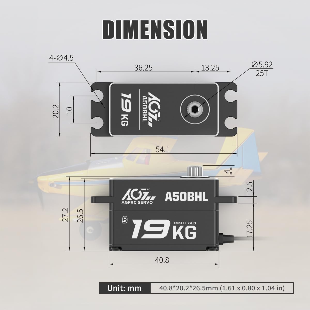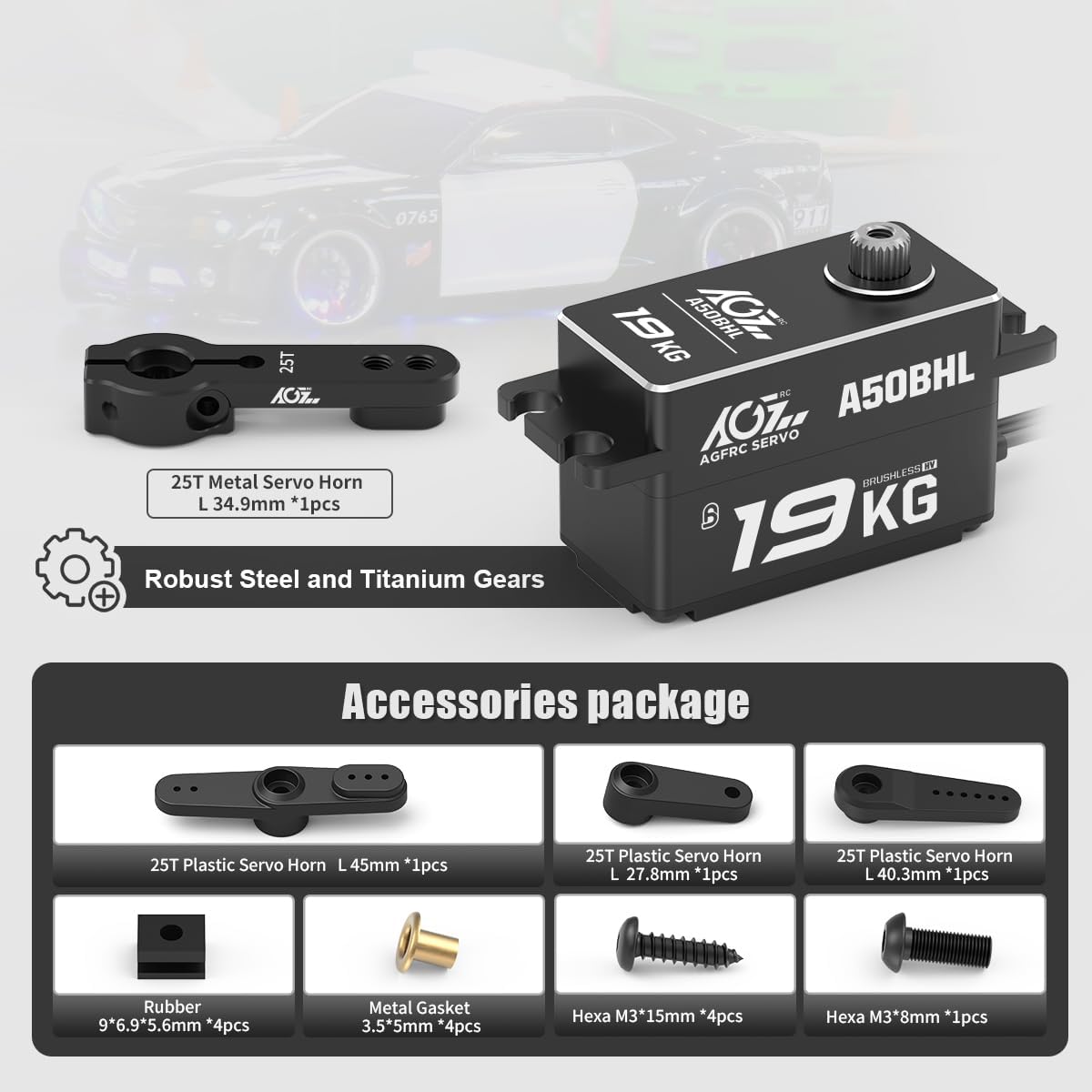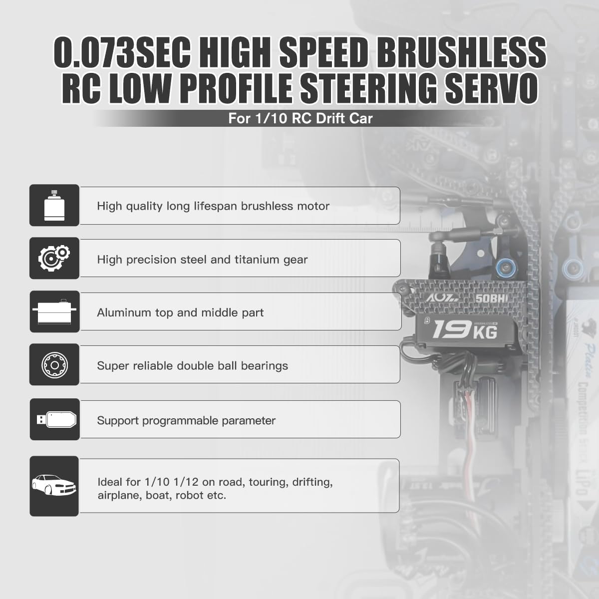 Aggiornamento e programmabile: il servo ad alta velocità di aggiornamento è programmabile dal servo programmatore AGF-SPV3 (non incluso) per cambiare coppia, velocità, angolo, inversione, posizione neutra, ecc. Alte prestazioni: dotato di ingranaggi in acciaio inossidabile, alloggiamento superiore e centrale in alluminio può migliorare la dissipazione del calore, che è a basso consumo energetico, la durata è stata notevolmente aumentata Grande coppia - AGFRC 19KG alta coppia motore brushless servo digitale. La coppia massima è fino a 19 kg-cm (270 once) @ 8,4 V. Tensione di funzionamento: 4,8 V ~ 8,4 V Alta precisione: linearità e precisione avanzate con potenziometro di precisione con nuovo design, stabile, a basso rumore, impermeabile IP65, a prova di polvere. Doppio cuscinetto a sfera, velocità di funzionamento: 0,073 sec/60° @ 8,4 V. Dimensioni: 40,8 x 20,2 x 26,5 mm Applicazione: ideale per scala 1/10 1/12 su strada, auto alla deriva RC, auto da corsa, auto da turismo, su strada, camion, piccoli aerei, elicottero, ecc.