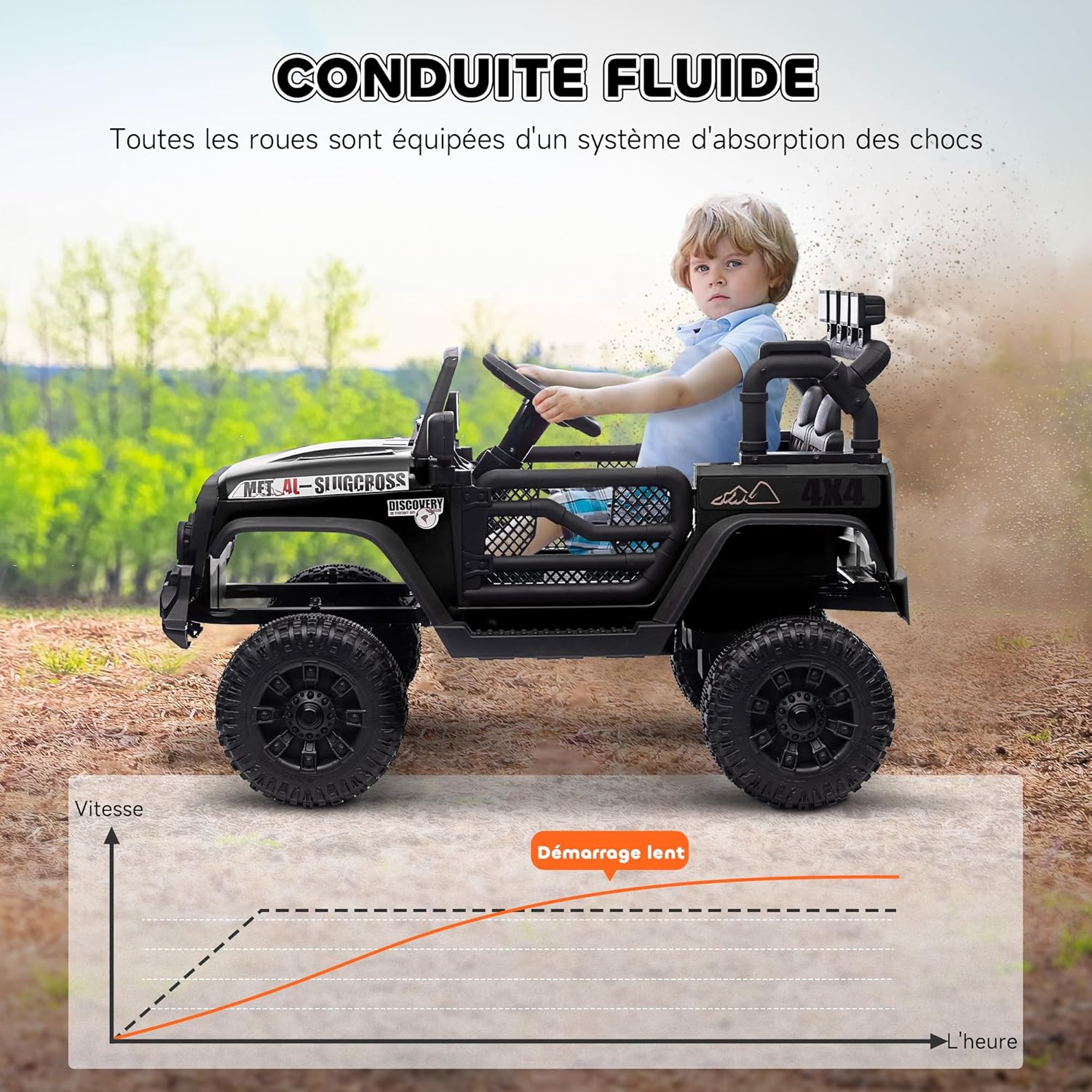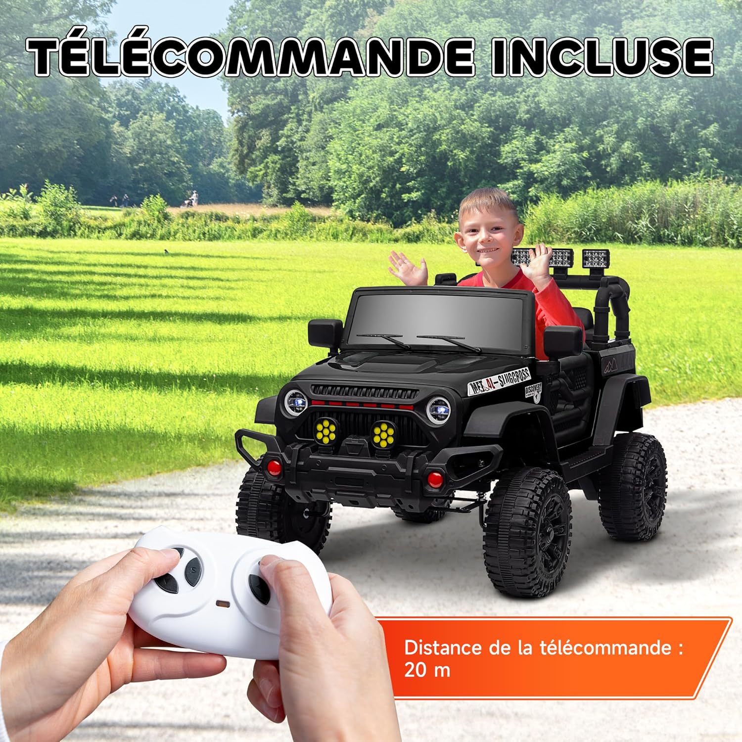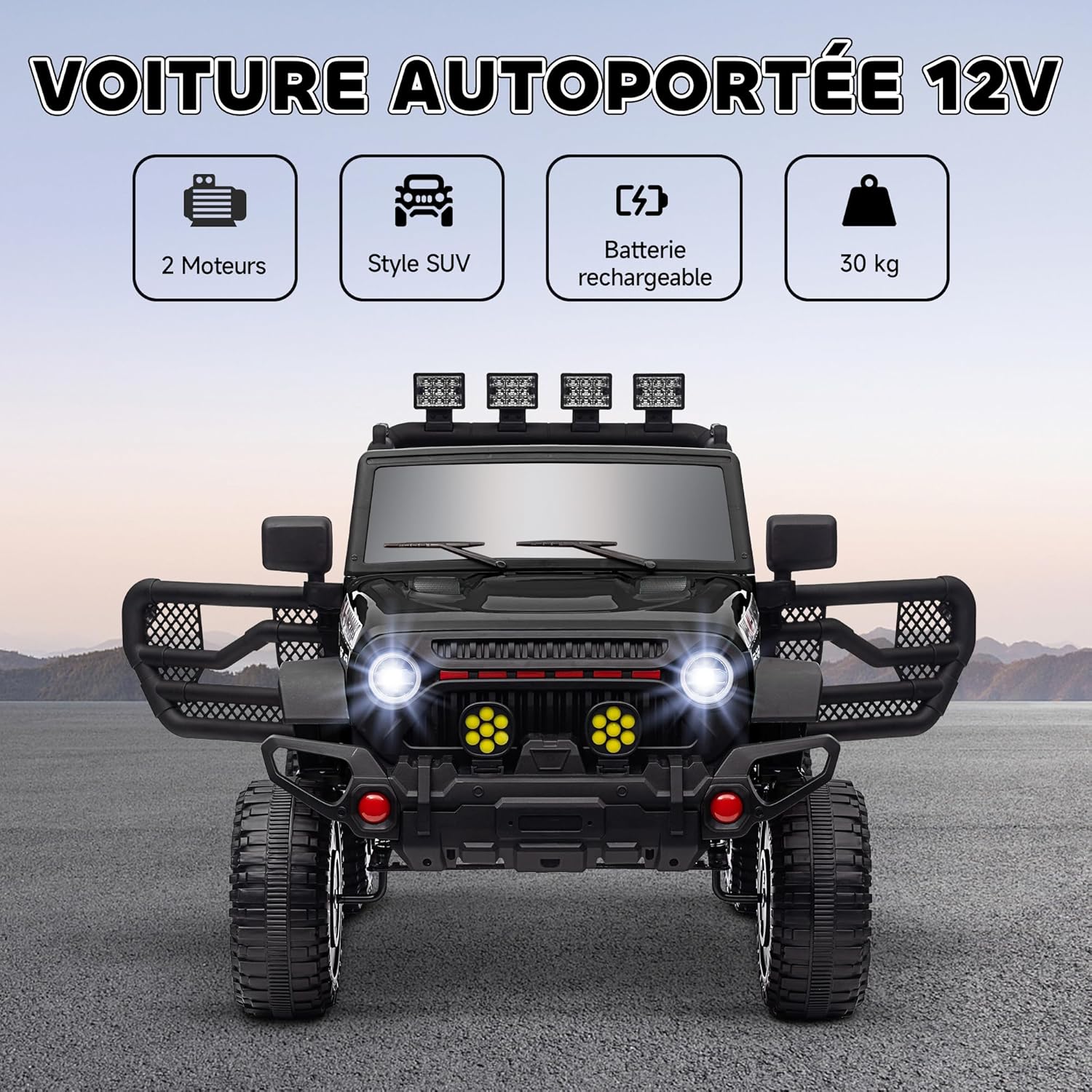 L'AVENTURE COMMENCE : Avec ses 2 moteurs puissants et son design SUV moderne, cette voiture électrique 12V offre à votre enfant des moments de conduite passionnants et sécurisés. Parfaite pour les petits explorateurs en quête de fun. TRAJET DOUX ET PROTÉGÉ : Doté de 4 roues amortissantes et d'un démarrage progressif, ce buggy électrique assure une conduite fluide et sécurisée, pour que chaque balade soit confortable et protégée. CHOIX DE VITESSES ADAPTATIVES : Avec 3 vitesses (2,5, 3 et 3,5 km/h) réglables via télécommande, cette voiture électrique pour enfants permet à votre enfant de piloter en toute autonomie et sécurité, pour une expérience de conduite adaptée à son âge et son niveau. INTERACTIONS AMUSANTES : Cette voiture électrique 12V séduit avec ses musiques, klaxon et phares lumineux. Un vrai bonheur pour les enfants qui s'amusent tout en développant leur imagination au volant de leur véhicule. SPÉCIFICATIONS DU BUGGY : Dim. totales 100L x 63l x 65H cm. Dim. assise : 35l x 18,5P x 30H cm. Vitesse 2,5/3/3,5 km/h. Autonomie 45 min. Pour enfants de 37 à 60 mois. Charge max. 30 kg. Montage requis.