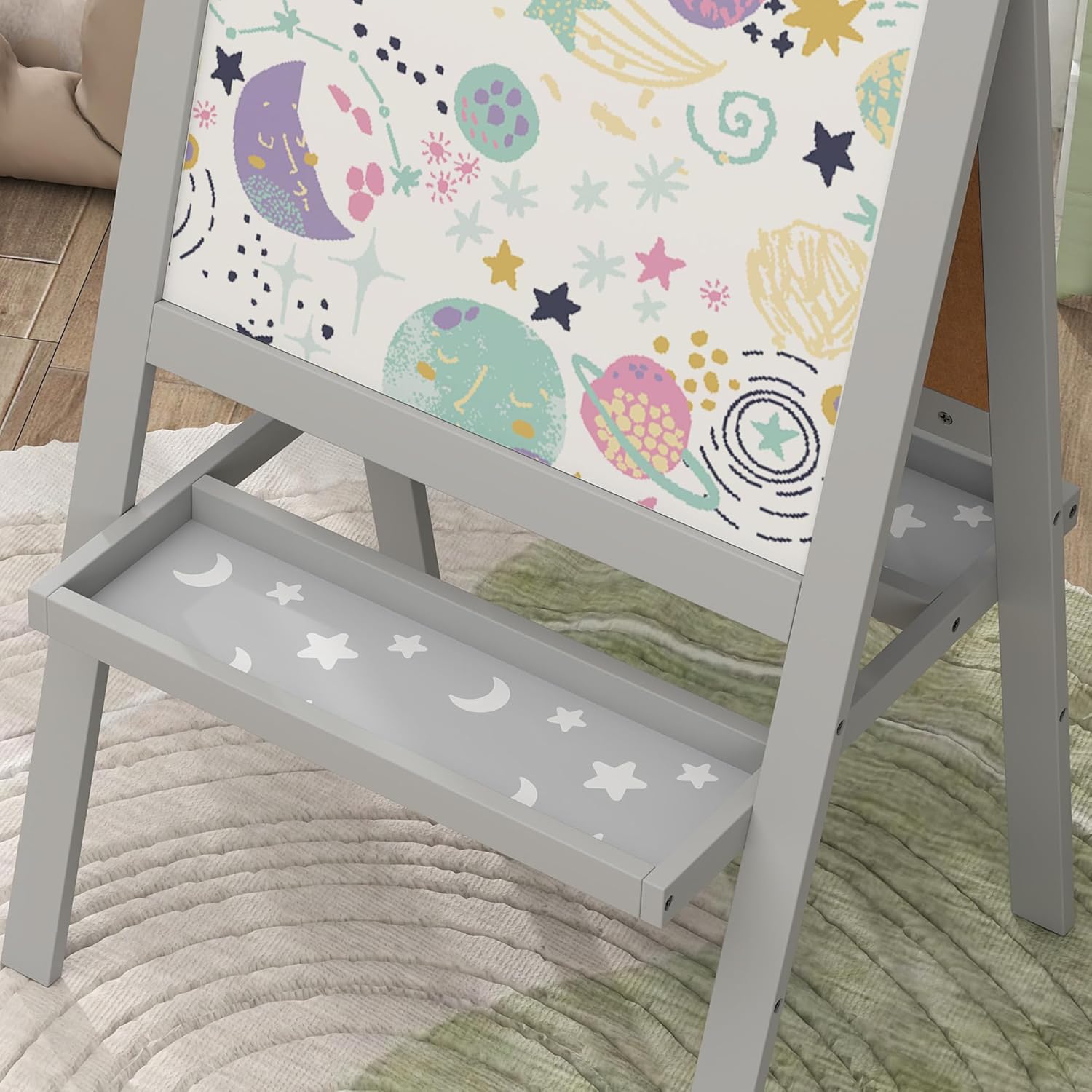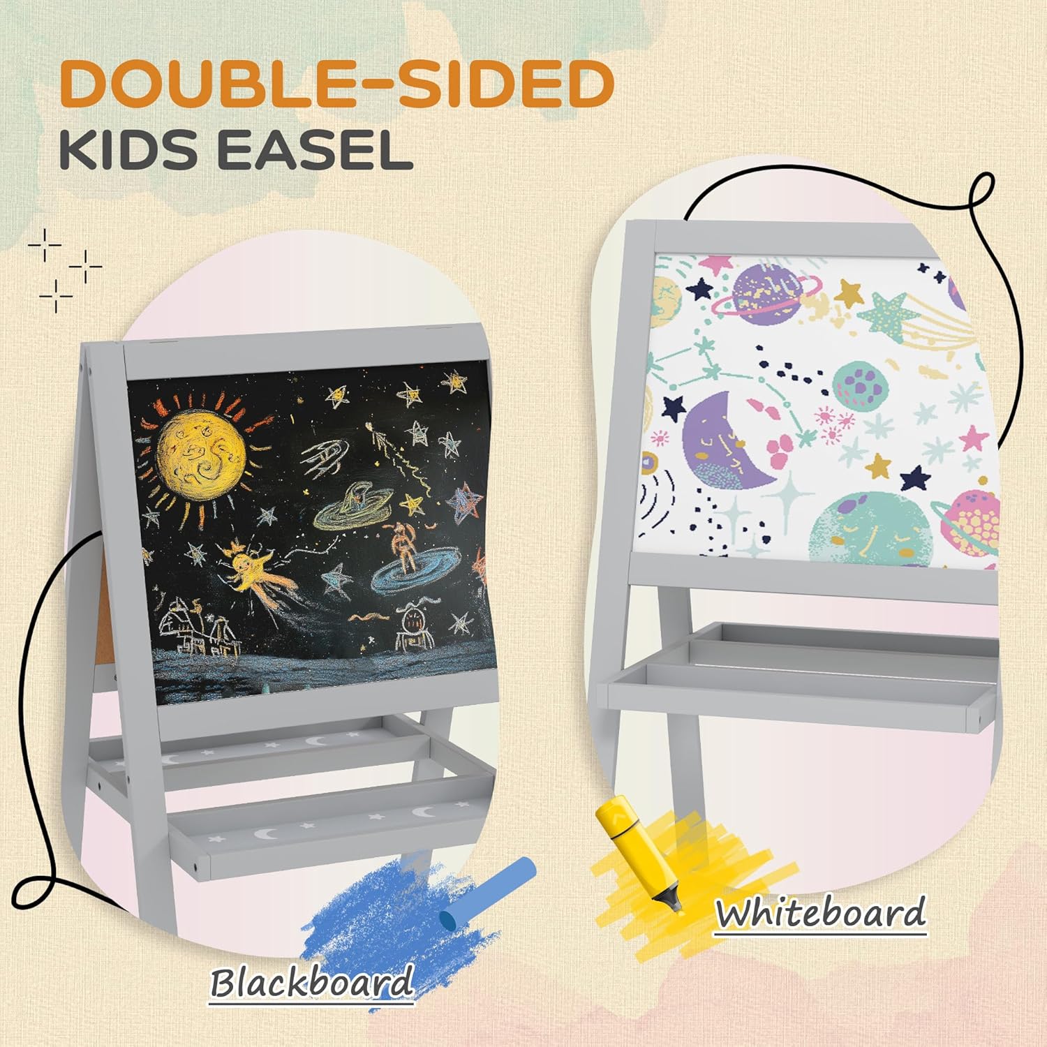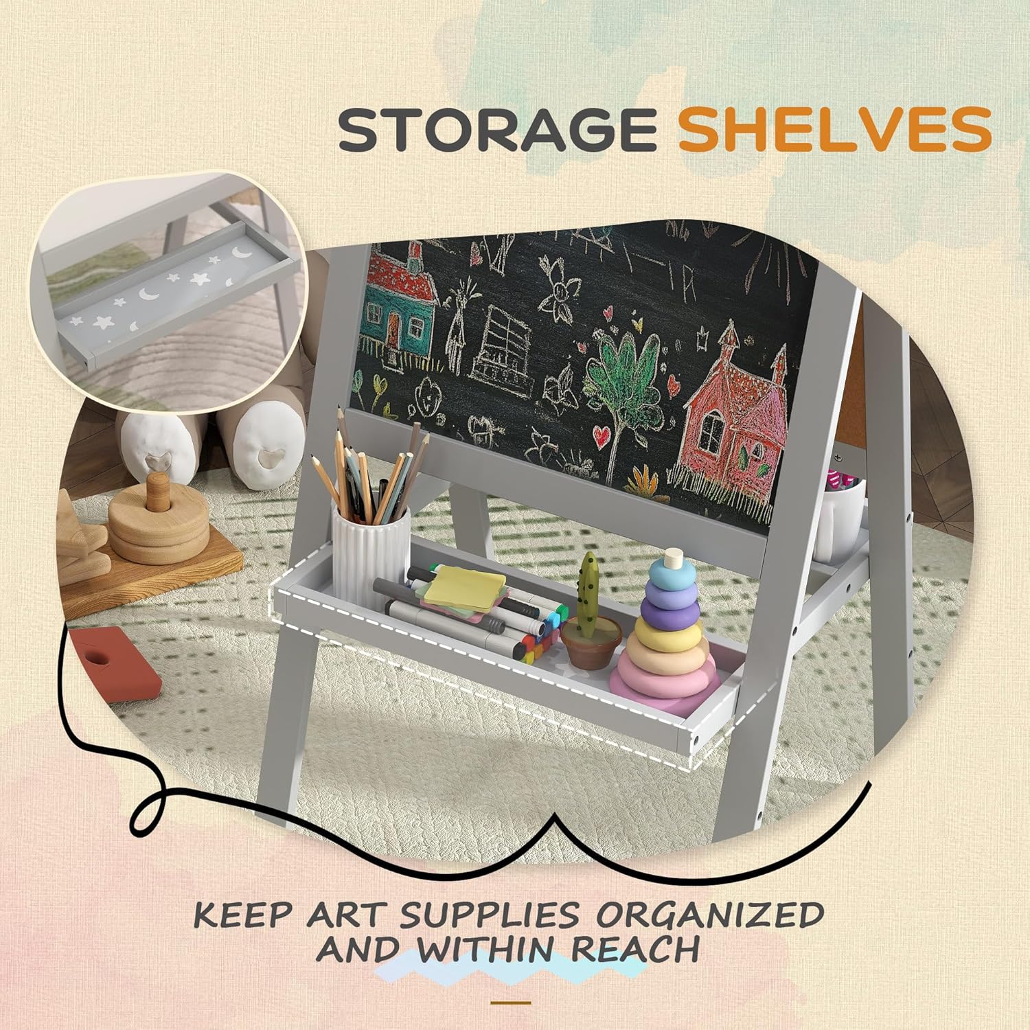 Design double face. Offre una lavagna e una lavagna, questo cavalletto per bambini stimola la diversità delle espressioni creative per i giovani artisti. Pratico stoccaggio: dotato di una mensola sotto ogni quadro, questo strumento mantiene le forniture artistiche ben organizzate e facilmente accessibili per i bambini. Costruzione robusta: realizzata in MDF con una struttura a A stabile, questa tavola con doppio lato per bambini è progettata per durare a lungo con l'energia dei giovani creatori. VANTAGGI EDUCATIVI: Promuove la creatività, lo sviluppo di abilità motorie fini e l'apprendimento della scrittura nei bambini dai 18 ai 48 mesi, arricchendo la loro esperienza giocosa. INFO PRODOTTO: Dimensioni: 54 x 48 x 88 cm. Età approvata: più di 18 mesi. Età consigliata: da 18 a 48 mesi. Conforme agli standard di sicurezza EM71-1-2-3. Montaggio richiesto.