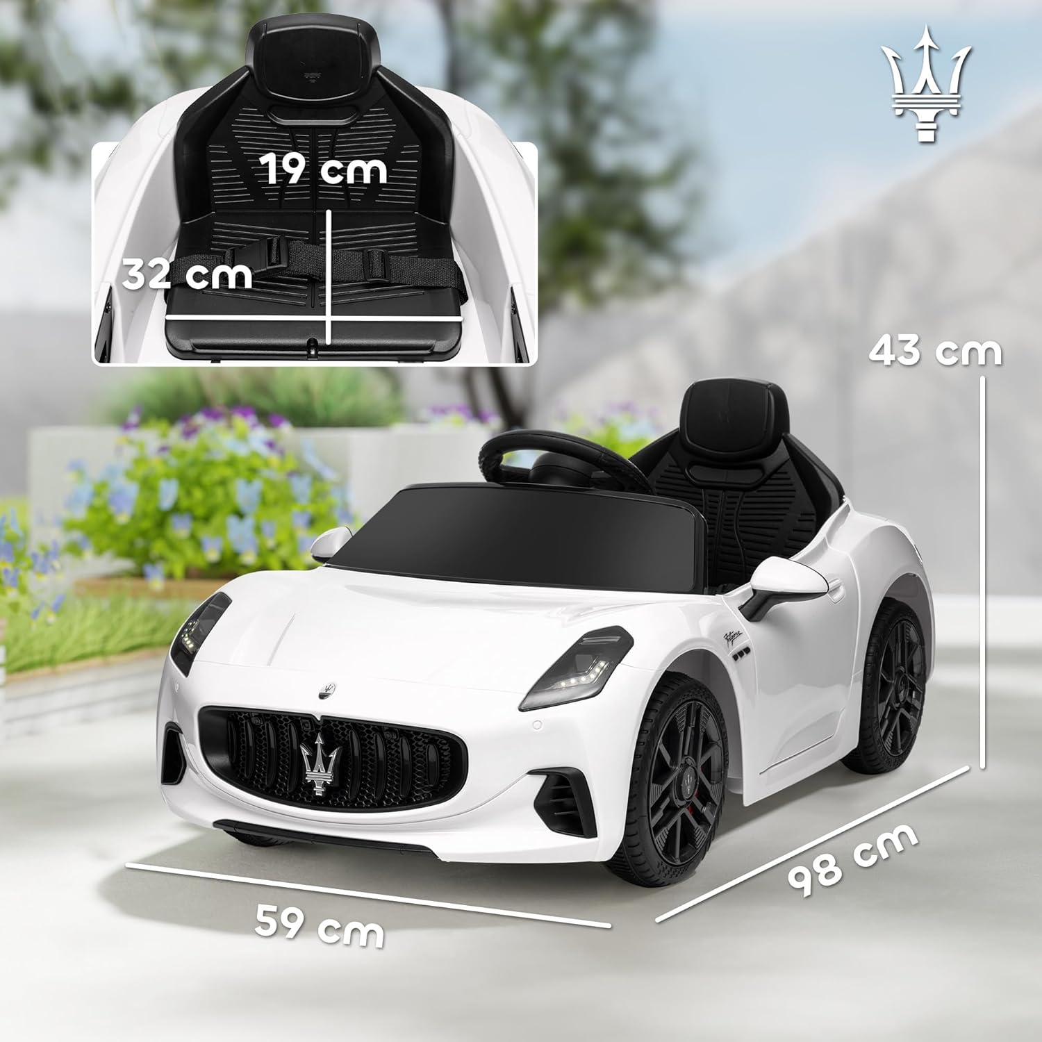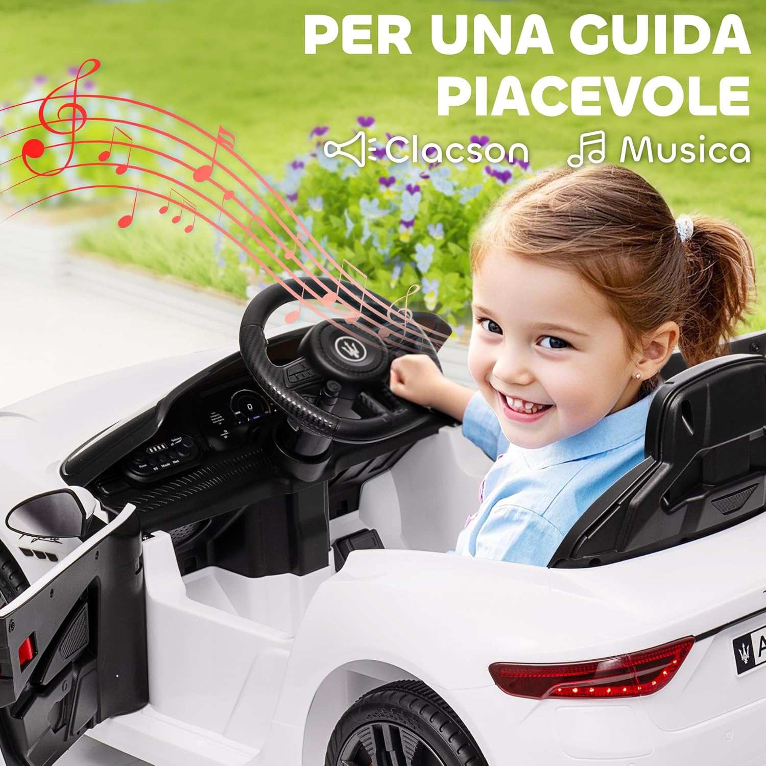 LICENZA UFFICIALE: Questa auto elettrica per bambini con licenza Maserati Gran Turismo Folgore è dotata di un doppio motore a 12 V e un dispositivo di alimentazione standard che garantisce fino a 50 minuti di gioco nonstop OPZIONI DI CONTROLLO FLESSIBILI: La nostra macchinina elettrica è dotata di telecomando per il controllo a distanza da parte dei genitori per controllarla entro 15 metri. La guida manuale consente ai bambini di girare a una velocità sicura di 3-5 km/h COMFORT E SICUREZZA: La cintura di sicurezza inclusa in questa macchina per bambini elettrica garantisce la sicurezza del bambino, mentre l'avviamento lento garantisce una guida fluida e sicura su ogni terreno ACCESSORI: La nostra macchina elettrica per bambini è dotata di rotelle che consentono ai genitori di portarla facilmente a casa se la batteria si esaurisce. Effetti sonori, luci, clacson sono inclusi per regalare un'esperienza di guida realistica DIMENSIONI: Dimensioni complessive: 98L x 59P x 43A cm. Capacità di peso: 25 kg. Età consigliata: 3-5 anni. Età approvata: 3-6 anni. Standard di sicurezza: EN71-1-2-3, EN62115. Montaggio richiesto