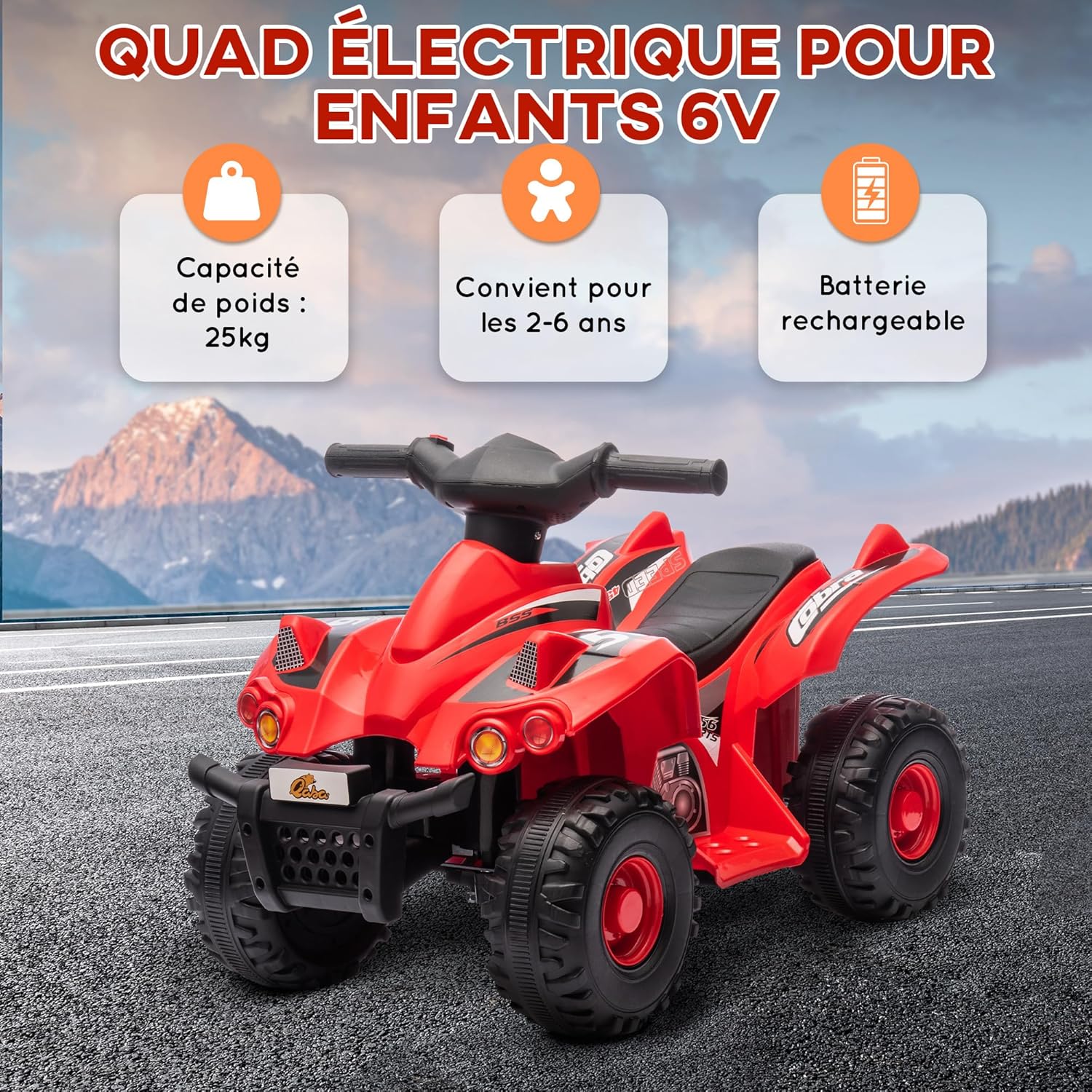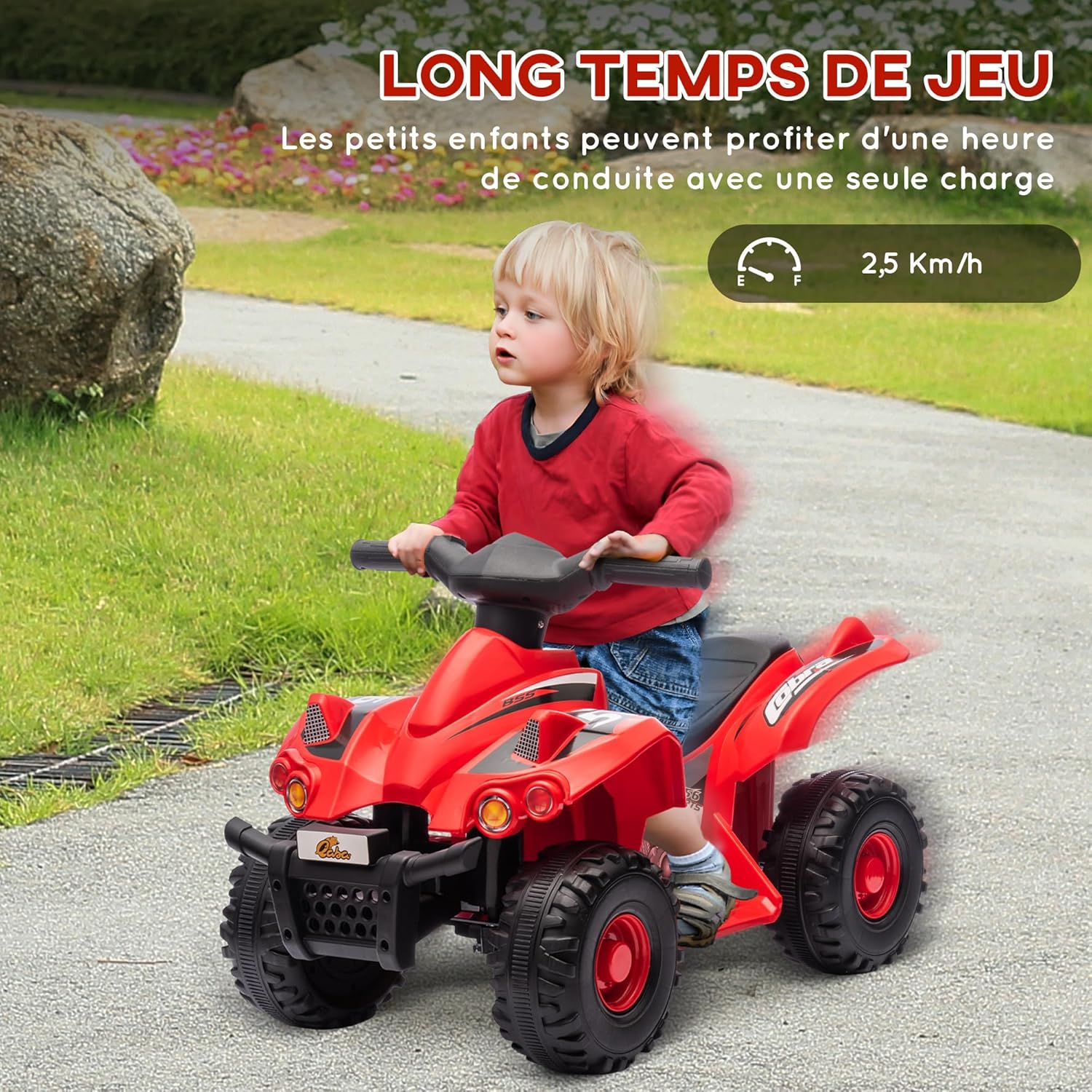 Tre canzoni incluse: ideale per piccoli amanti della musica, questo quad trasmette tre canzoni accattivanti per accompagnare le passeggiate. VELOCITÀ DI 2,5 KM/H: A un look sicuro di 2,5 km/h, questa auto elettrica è perfetta per i bambini per godersi serenamente fino a un'ora di passeggiata dopo ogni carica. Materiale robusto: costruito con plastica di alta qualità e metallo, questo quad elettrico garantisce robustezza, stabilità e affidabilità per la sicurezza dei piccoli piloti. Guida liscia: adatta a vari tipi di superfici come asfalto, mattoni e cemento, questo veicolo elettrico garantisce una guida fluida e piacevole. SPECIFICHE: Dim. 71 x 40 x 46 cm (lunghezza x larghezza x altezza). Età consigliata: 2-6 anni. Portata massima: Consigliato: 25 kg. Montaggio richiesto.