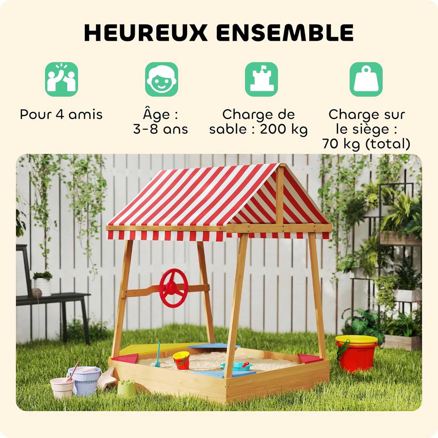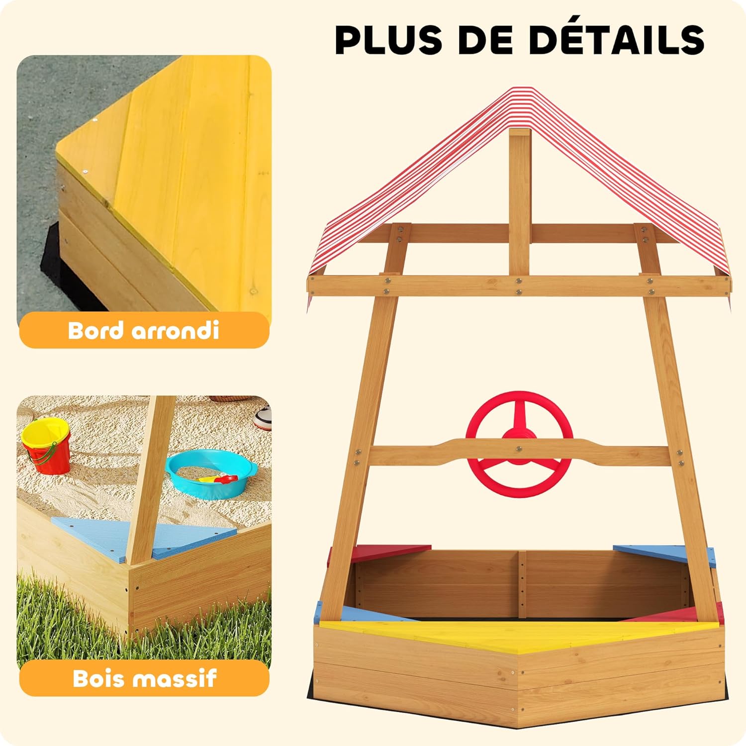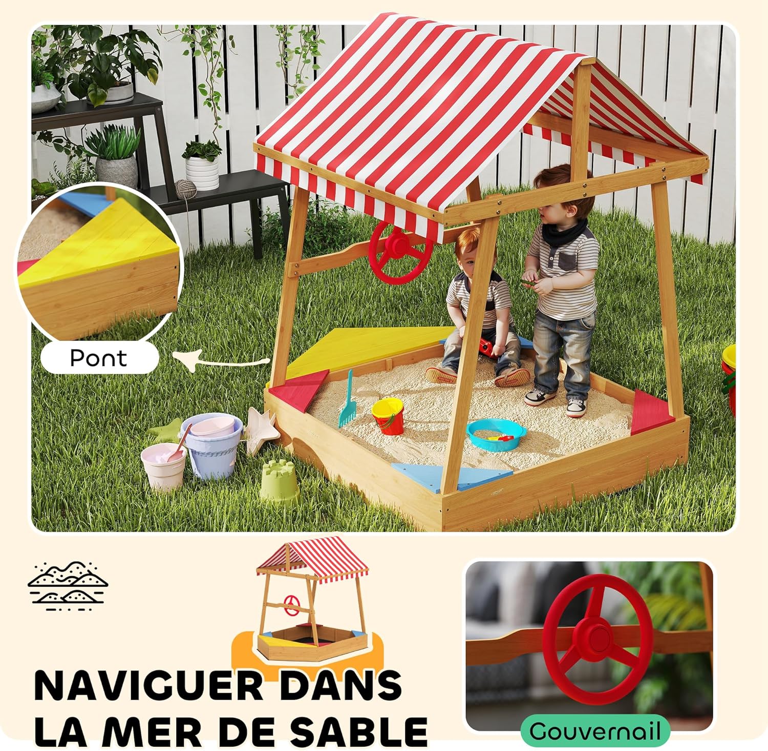BATEAU POUR AVENTURE SUR LE SABLE : Transformez votre jardin en un véritable port de plaisance avec ce bac à sable en forme de bateau, complet avec gouvernail et pont intégrés, permettant à votre petit capitaine de naviguer dans un monde de créativité et de jeux d'imagination. PLAISIR TOUT TEMPS : Équipé d'une couverture résistante et amovible, ce bac à sable pour enfants protège vos enfants contre les UV et la pluie, leur permettant de jouer confortablement et en toute sécurité. Oubliez les inquiétudes liées aux caprices de la météo et profitez simplement des joies extérieures. SANS DÉSORDRE NI TRACAS : Grâce à son fond anti-mauvaises herbes et anti-humidité, ce bac à sable maintient le sable en place et assure un espace de jeu toujours propre et net, idéal pour les parents souhaitant minimiser l'entretien. ASSEZ GRAND POUR JOUER : Avec ses quatre sièges intégrés et une capacité de 200 kg de sable, ce bac à sable en bois offre un vaste espace pour que les enfants puissent construire, creuser et imaginer avec leurs amis. ROBUSTE ET STABLE : Construit en bois de sapin résistant aux intempéries, ce bac à sable robuste promet de supporter de nombreuses sessions ludiques, tout en garantissant un confort optimal pendant les chaudes journées d'été.