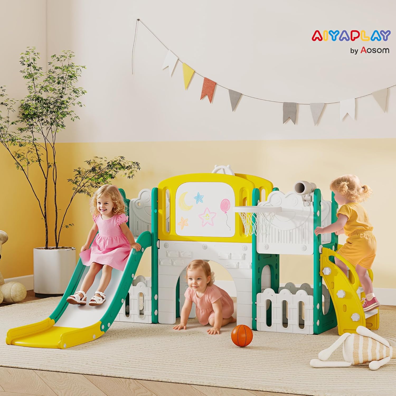 7-in-1 Kletterset: Dieses vielseitige Set im fröhlichen Frosch-Design umfasst eine Babyrutsche, einen Basketballkorb, einen Kriechtunnel, ein Teleskop, eine Kletterwand, eine Aufbewahrungsbox und eine Zeichentafel Sanftes, sicheres Rutschen: Das Kinderrutsche-Set mit Beschleunigungs-, Verzögerungs- und Pufferzonen gewährleistet eine weiche und sichere Rutschpartie. Anti-Rutsch-Stufen und vollständig umschlossene Handläufe bieten kleinen Abenteurern zusätzliche Sicherheit Kindersicher: Hergestellt aus HDPE mit sanft abgerundeten Kanten und ohne scharfe Ecken, garantiert das Gartenrutsche-Set ein sicheres Spielvergnügen Fördert Kreativität: Dieses Babyrutsche-Set lädt Kinder ein, ihre Umwelt spielerisch zu erkunden und ihre Kreativität sowie Vorstellungskraft frei zu entfalten Produktabmessungen der Kinderrutsche: Gesamtabmessung: 176L x 150B x 94H cm. Dank des modularen Designs ist die Montage unkompliziert und binnen etwa einer Stunde abgeschlossen