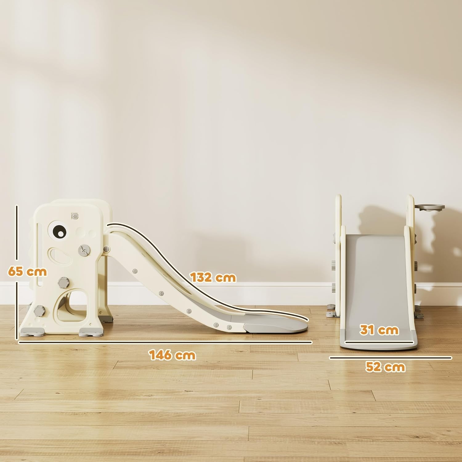 STRUTTURA PIEGHEVOLE: Questo scivolo per bimbi può essere piegato facilmente contro il muro per ottimizzare gli spazi nelle aree gioco e mantenere gli ambienti domestici sempre in ordine quando necessario DIVERTIMENTO 3 IN 1: Dotato di un'area per arrampicarsi, un canestro e una palla, il nostro scivolo per bambini stimola il gioco attivo e favorisce lo sviluppo della coordinazione nei più piccoli, garantendo ore di puro divertimento con lo stesso gioco GIOCO STABILE E SICURO: Le 4 fibbie rinforzate, i gradini antiscivolo e gli appoggi laterali integrati dello scivolo da interni garantiscono sicurezza e fiducia ai più piccoli in ogni momento ludico CON DISEGNO DI DINOSAURO: I dettagli a tema dinosauro dello scivolo in plastica rendono ogni ambiente più luminoso, stimolando la creatività e trasformando ogni momento di gioco in una fantastica avventura per i più piccoli DIMENSIONI: Dimensioni complessive: 146L x 52P x 65A cm. Età indicata: 1+ anni. Età consigliata: 2-5 anni. Capacità di peso: 30 kg. Montaggio richiesto