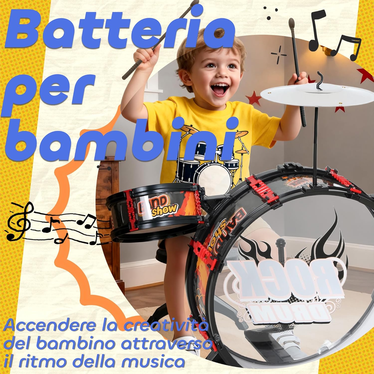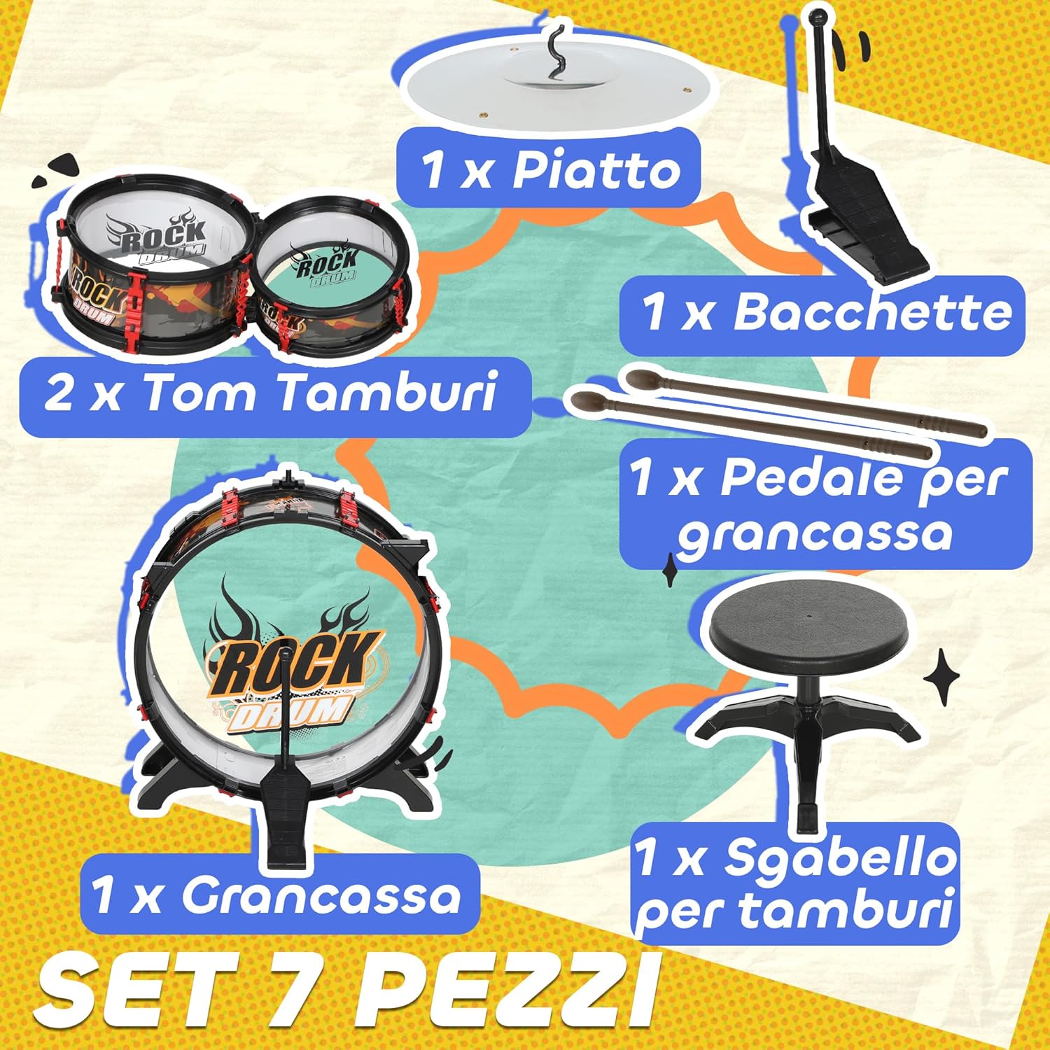 KIT DI BATTERIA 7 PEZZI: Questo set con batteria per bambini include tutto il necessario: cassa, due tom, un piatto, bacchette e uno sgabello. Perfetto per far iniziare a far suonare i tuoi piccoli artisti e scoprire il mondo della creatività SVILUPPA COMPETENZE CHIAVE: La batteria musicale per bambini è ideale per sviluppare il senso del ritmo, la coordinazione occhio-mano e la concentrazione, promuovendo un modo divertente e formativo di apprendere giocando ed esplorando la musica SICURA E ROBUSTA: Realizzata con materiali sicuri per i bambini, questa batteria giocattolo è adatta dai 3 anni in su. Lo sgabello resistente può sostenere fino a 30 kg, garantendo la massima stabilità per i tuoi giovani musicisti DIVERTIMENTO SENZA LIMITI: con suoni chiari e vibranti, la batteria per bambini garantisce ore di divertimento musicale. Un set perfetto per consentire ai piccoli musicisti di divertirsi con sessioni continue e dare libero sfogo alla loro creatività REGALO DIVERTENTE PER BAMBINI: Imballato in una coloratissima scatola regalo, questo kit di batteria è il regalo ideale per bambini da 3 a 6 anni in ogni occasione dell'anno, per incoraggiare la scoperta della musica e della manualità