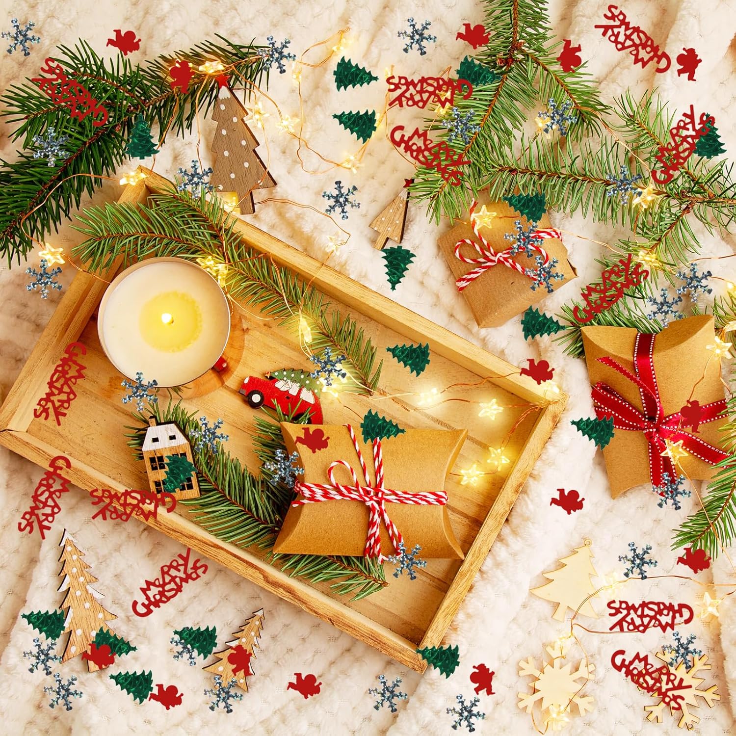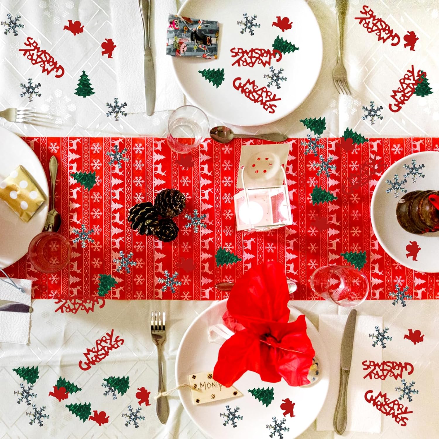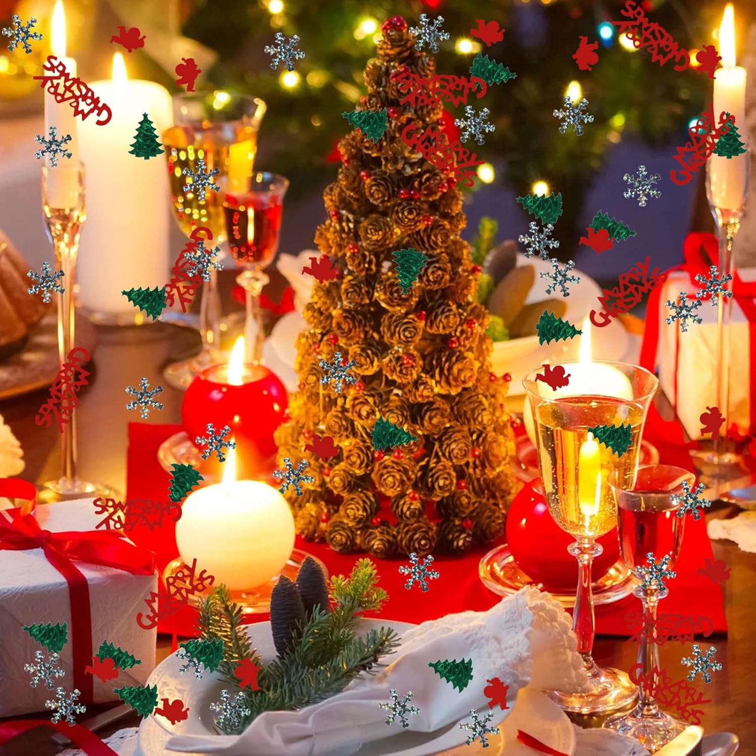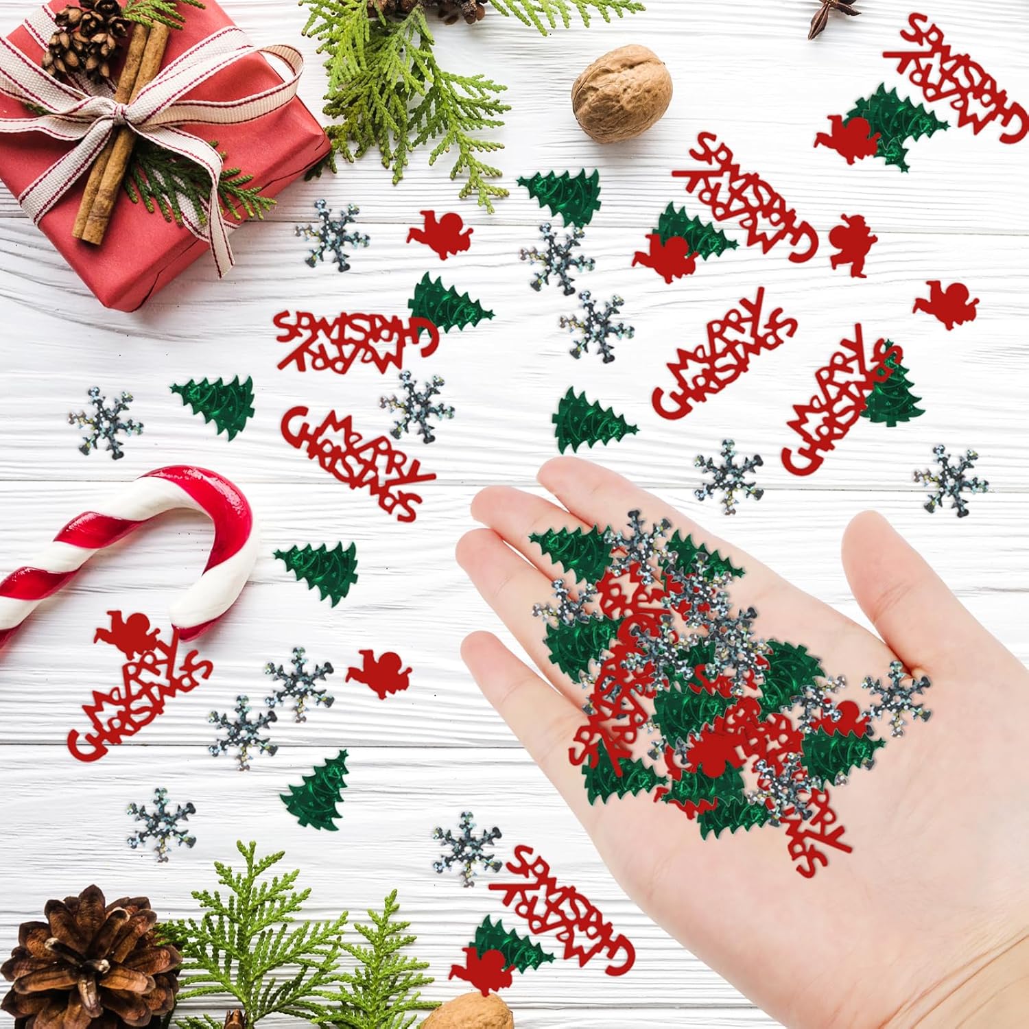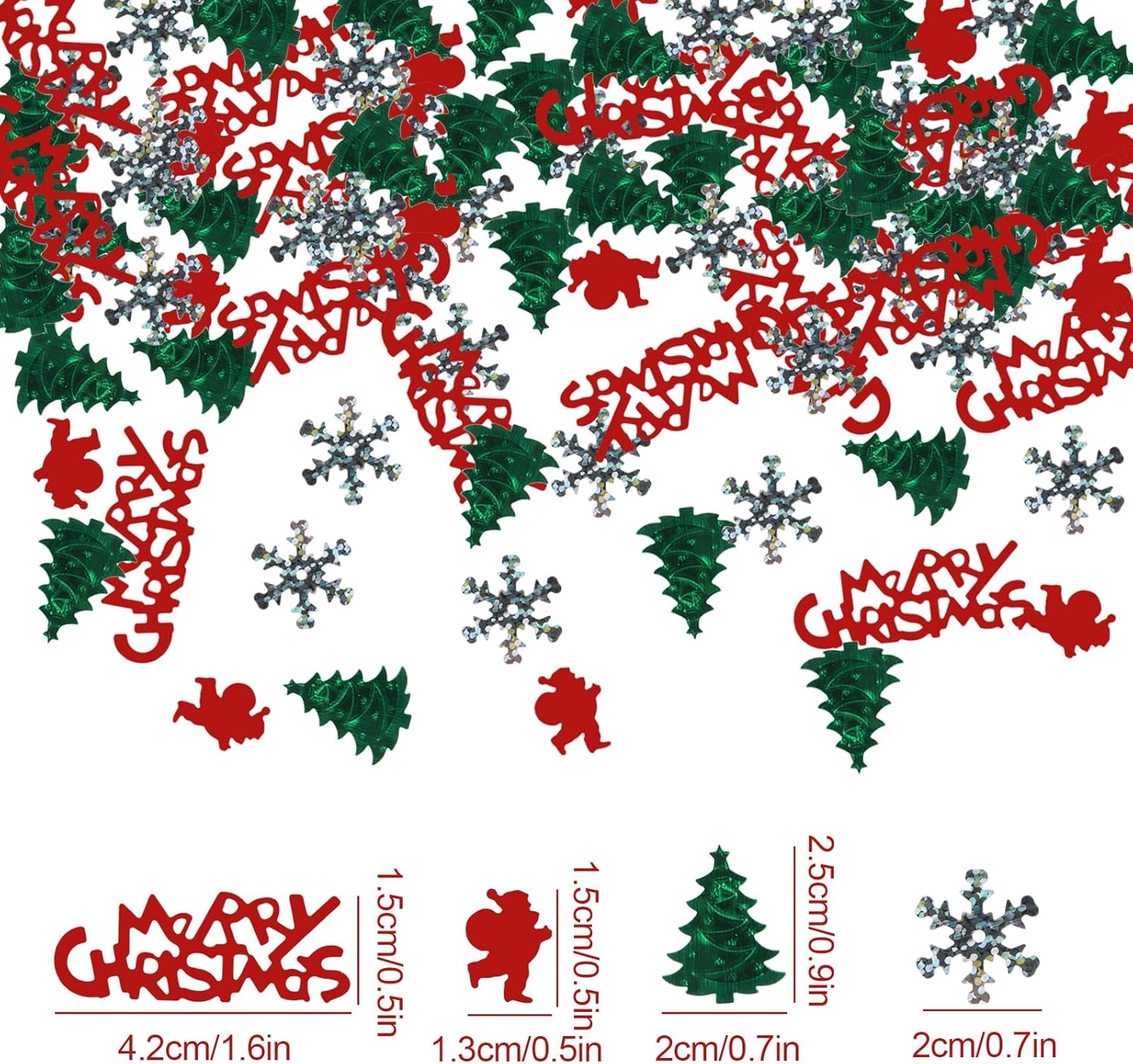 Decorazione della tavola di Natale: questi coriandoli natalizi contengono disegni di Babbo Natale, alberi di Natale, fiocchi di neve, Buon Natale e altri classici elementi natalizi. Con due classici colori natalizi come il verde e il rosso come colori principali, è molto adatto per decorare la tavola di Natale e creare un'atmosfera natalizia. Coriandoli di alta qualità: i coriandoli natalizi sono realizzati in materiale PVC di alta qualità, resistente e non facilmente deformabile; la superficie dei coriandoli ha una lucentezza metallica e i colori sono brillanti, brillano sotto le luci e aggiungono colore alla tua tavola della festa di Natale Decorazione della tavola di Natale: riceverai un totale di 2 confezioni di coriandoli natalizi con un peso totale di 30 grammi, circa 500-600 pezzi; i coriandoli sono leggeri, facili da spargere e possono essere raccolti e riutilizzati la prossima volta FACILE DA USARE: in una bella notte di Natale, lancia i nostri coriandoli in aria, cospargili sulla tavola di Natale o riempi palloncini di coriandoli per decorare la stanza Multiuso: i coriandoli di Natale possono essere usati come decorazione per la tavola, decorazioni per feste di Natale e anche per decorare cartoline di Natale, inviti, sacchetti regalo, ecc. Si prega di fare attenzione ai piccoli frammenti durante l'uso. Si prega di tenere i residui di carta lontano dalla portata dei bambini o di utilizzarli sotto la supervisione di un adulto
