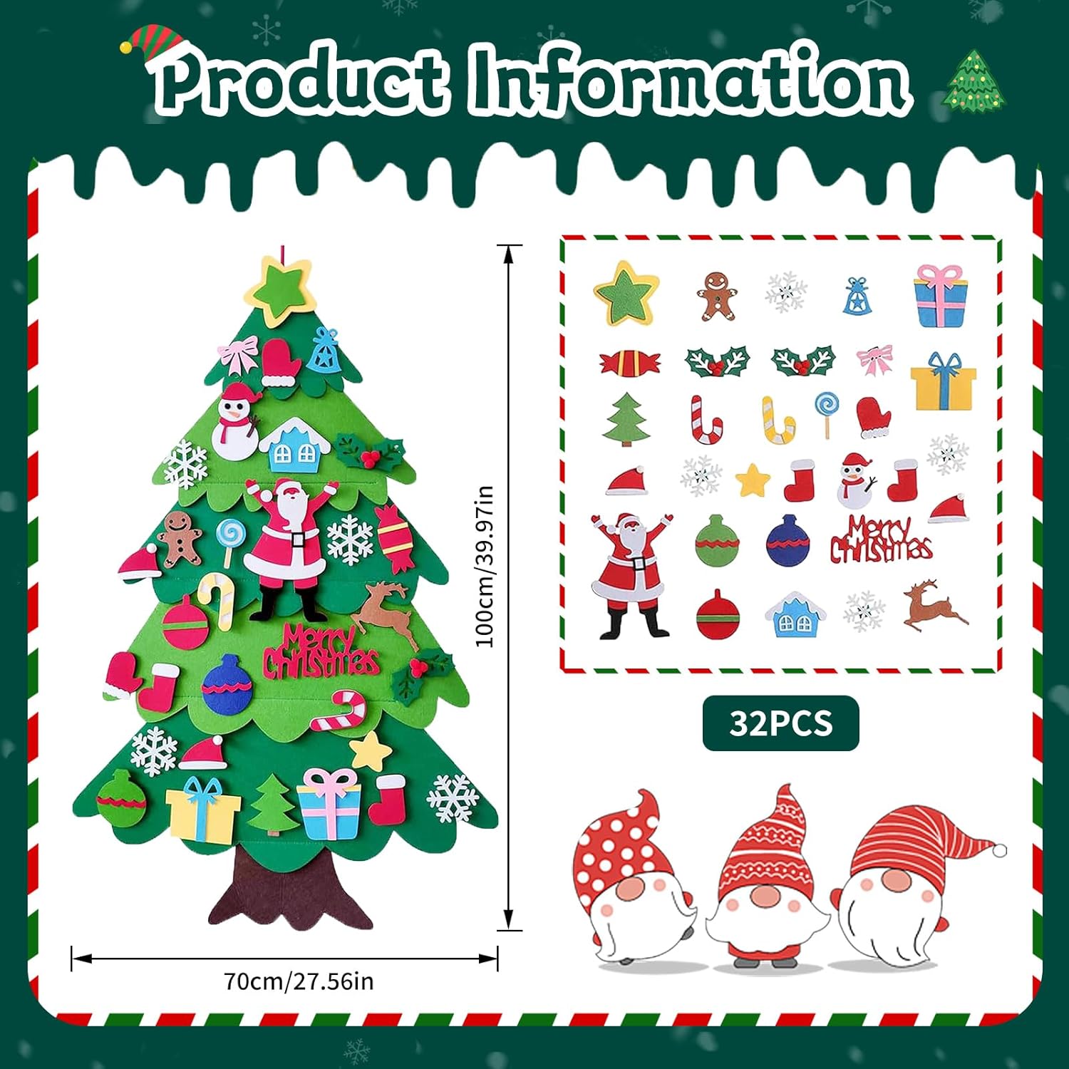 Set fai da te albero di Natale in feltro per bambini: 1 albero di Natale in feltro per bambini (100 x 70 cm), 32 decorazioni rimovibili, decorazioni incluse: omino di pan di zenzero, renna, caramelle, calze di Natale, regali, cappellino di Natale, ecc. Materiali di alta qualità: questa decorazione da parete a forma di albero di Natale è realizzata in feltro di alta qualità dello spessore di 2 mm, composto da materiali sicuri e atossici, privi di polvere e inodori, assolutamente innocui per i bambini. Questo albero di Natale compatto in feltro è riutilizzabile ed ecologico. Facile da installare: gli accessori fai da te sono forniti con un adesivo magico. Basta appendere l'albero dove si desidera e posizionare le decorazioni in velcro sull'albero. Decorate il vostro albero di Natale come preferite. Cliente eccellente: vi ringraziamo per aver scelto i nostri prodotti e apprezziamo la vostra esperienza utente. Se hai domande, non esitare a contattarci. Ti garantiamo una risposta rapida e soddisfacente. Nota: abbiamo piegato l'albero di Natale per il trasporto. Potrebbe apparire piegato o leggermente irregolare quando lo riceverai. Dopo averlo stirato o pressato, tornerà come nuovo.