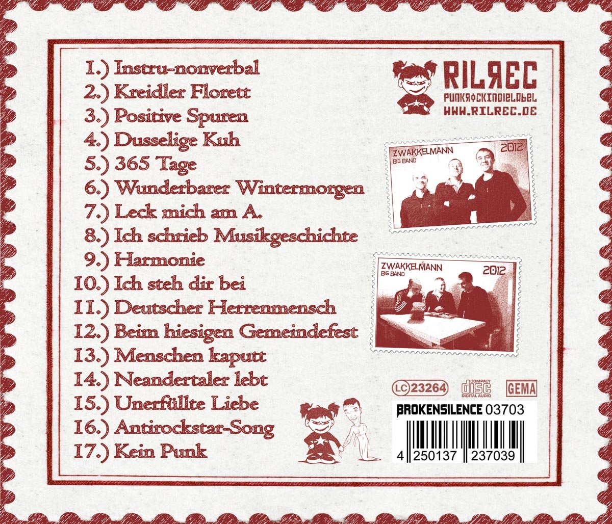 Qualitätsgarant ZWAKKELMANN meldet sich auf RILREC in Hochform mit seinem überfrankierten brandneuen Album zurück. Questi sono alcuni degli album solisti presentati dall'ex-SCHLIESSMUSKEL-Chef SCHLAFFKE WOLF nell'album Briefmark. 17 nuove canzoni, che sono stilizzate da Fahrwasser zwischen Pop-Punk, 60 s Pop, Indie e Singer-Songwriter ausloten. Natürlich lässt der Barde aus Hamminkeln keine Gelegenheit aus, wunderschöne Gesangs- und Gitarrenharmonien im Dutzend abzufeuern, gekontert durch die skurrilen, tragikomischen, alltagsbetrachtenden Texte, für die ihn seine Fans so lieben. In full Bandbesetzung agierend und mit guter Klangqualität eingespielt, lässt ZWAKKELMANN Nummern wie Neandertaler Lebt, Kreidler Florett, Dusselige Kuh, Deutscher Herrenmensch oder Unerfüllte Liebe zu Popperlen am Abgrund des allzu Menschlichen geraten, schonungslos offen, lakonisch oder einfach nur lustig. Achtung: neben wunderschönem Artwork (16 pagine 4c-Booklet) enthält das Album die original ZWAKKELMANNBreifmarke! Tempo di gioco per oltre 40 minuti. Suggerimento!