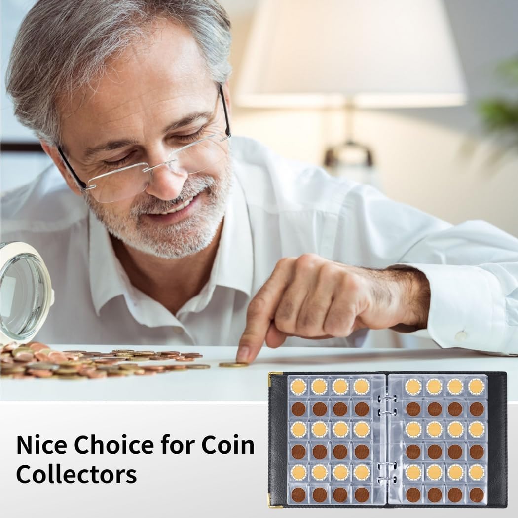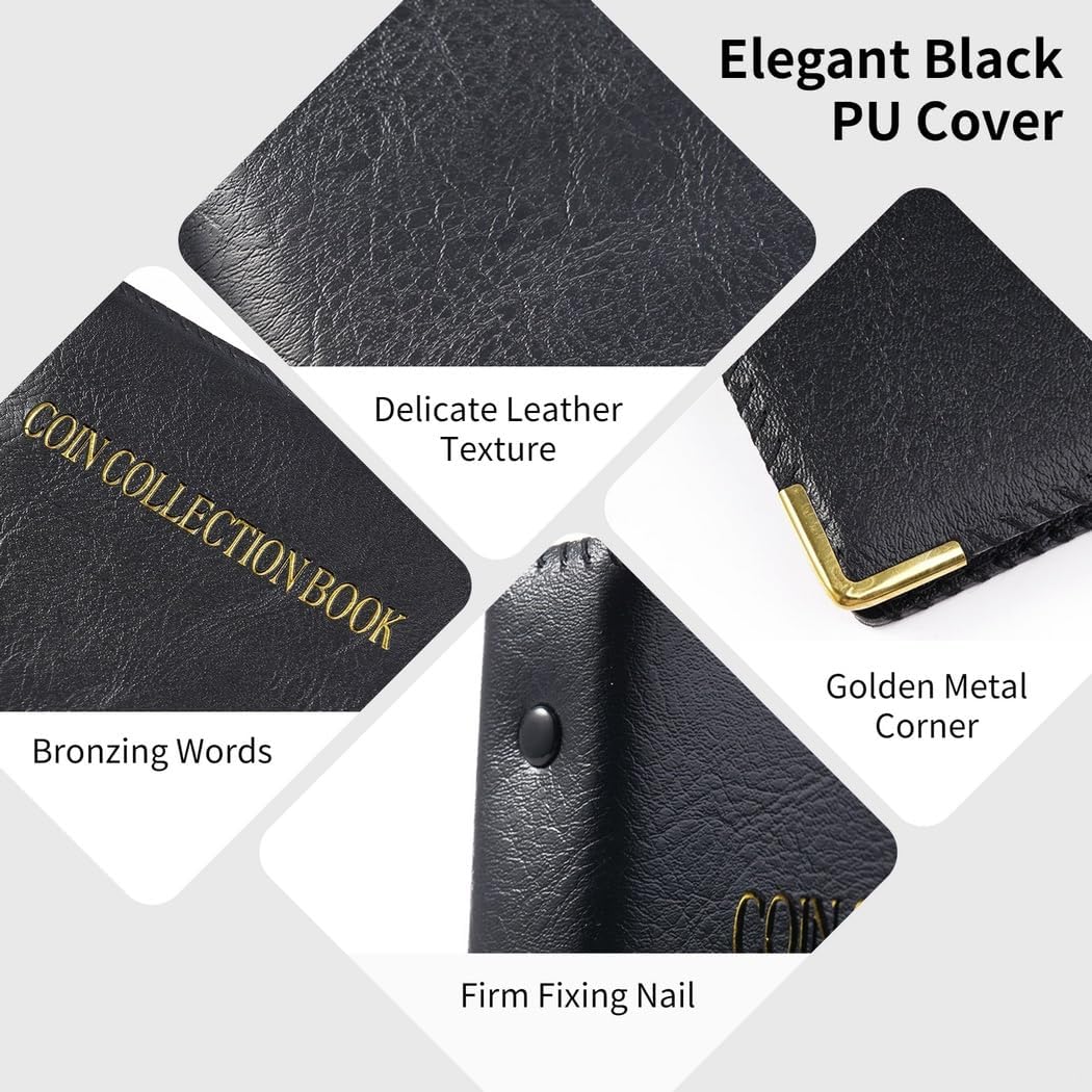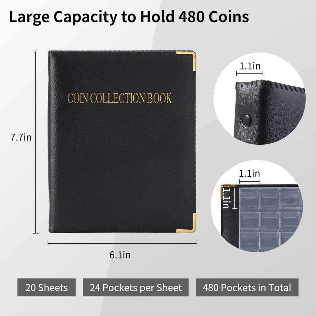 Spazio per 480: questo libro da collezione dispone di 20 pagine con 24 tasche per pagina; può ospitare di 2,5 cm o più piccolo; adatto per una vasta gamma di Display cristallino: le pagine trasparenti mostrano chiaramente; la plastica spessa protegge da umidità e polvere; le pagine sono rimovibili per comodità Tasche singole per monete: previene danni con scomparti separati; caricamento regolare; tappi sicuri per evitare fuoriuscite accidentali Elegante e copertina: pelle di alta qualità con testo bronzato e accenti in metallo; rinforzato con cartone per mantenere la forma Per collezionisti: ideale per collezionisti di monete, gettoni e distintivi; un ottimo regalo per qualsiasi appassionato