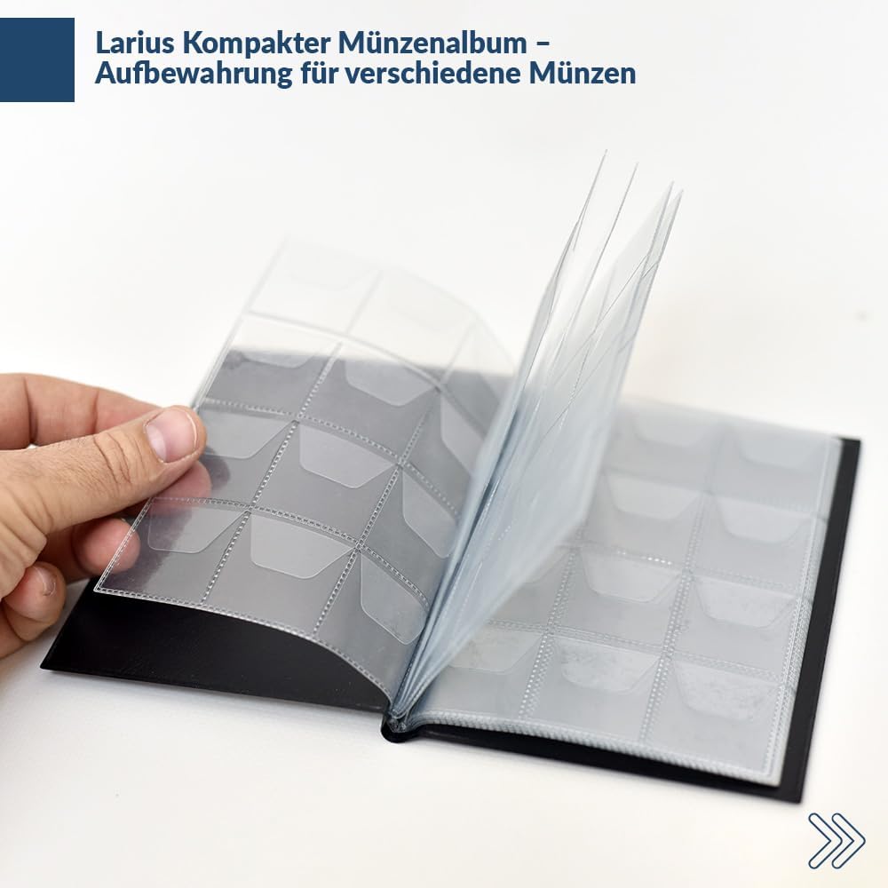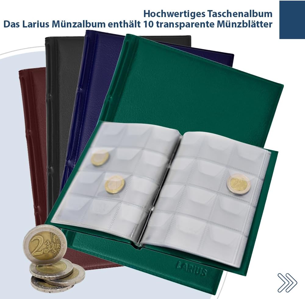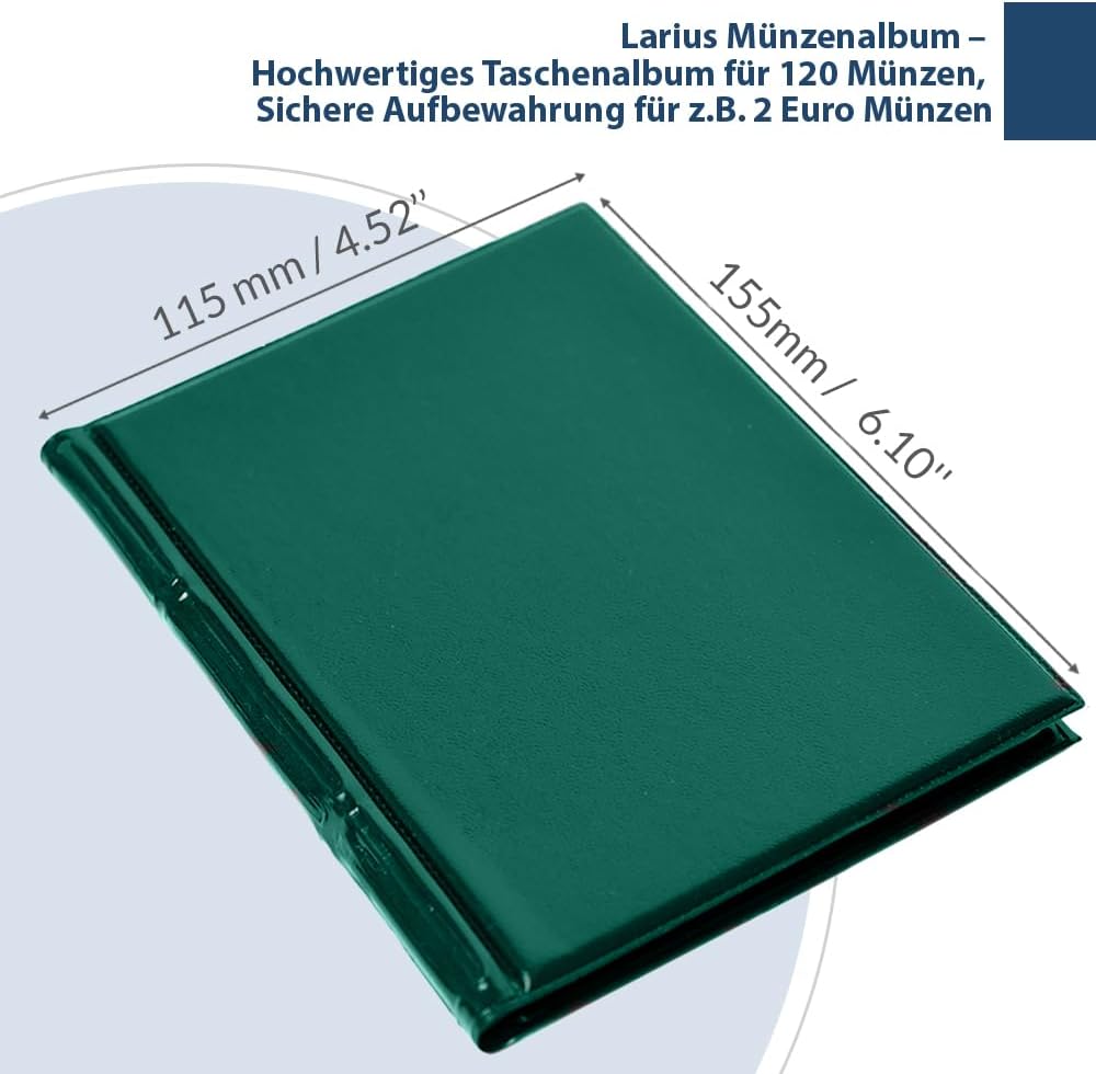 Album tascabile di alta qualità per 120 monete, ad esempio B. monete da 2 euro, monete commemorative, ecc. Capacità di stoccaggio: 10 fogli trasparenti per monete da 12 monete fino a 34 mm di diametro – 120 tasche con una patta Formato esterno: 155 mm x 115 mm / 6.10'' x 4.52'', album completo per monete, compresi fogli per la protezione delle monete Qualità della pellicola delle monete: 150/120 μm – Conservazione sicura delle monete Larius Album per monete: la protezione perfetta per le vostre monete