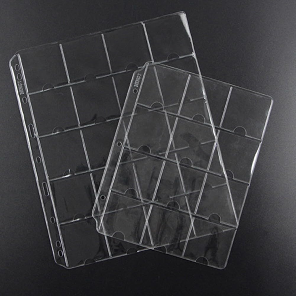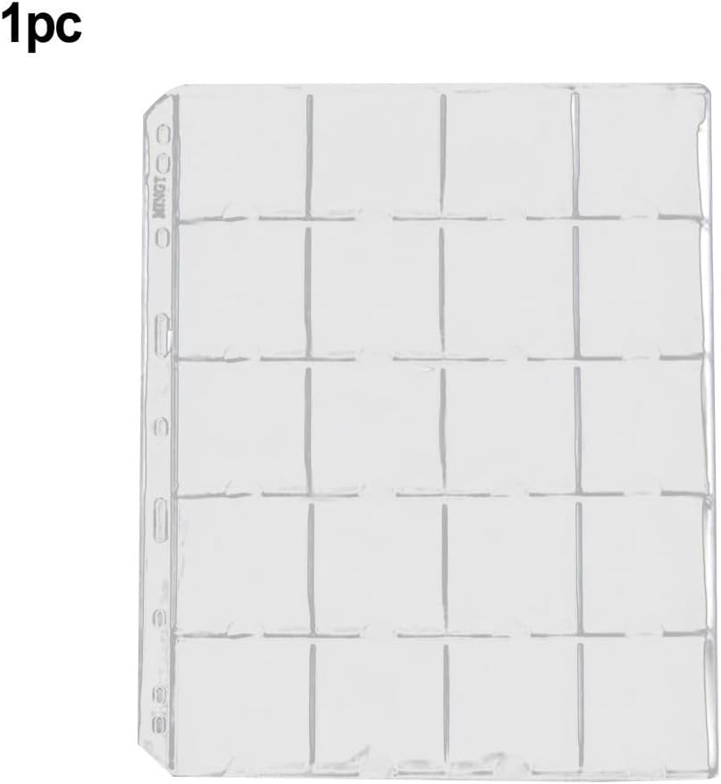 [10 fogli con 20 tasche] Questo set include 10 fogli con un totale di 20 tasche trasparenti, ognuna misura circa 52 x 52 mm, fornendo ampio spazio per le tue esigenze quotidiane. Organizzazione chiara per collezionisti: per organizzare oggetti fino a 50 mm, ogni pagina contiene in modo efficiente 20 pezzi, i tuoi oggetti da collezione sono puliti e facilmente accessibili. Materiale sicuro e PVC: realizzati in PVC trasparente, questi supporti sono ecologici e robusti, con bordi lisci per una manipolazione sicura. Sono anche antipolvere e impermeabili per un uso a lungo termine. Facile da usare con design a foglia sciolta: l'album presenta un design a foglia larga con 9 fori sul lato sinistro per una facile organizzazione. Ogni tasca include una patta antiscivolo per tenere saldamente i tuoi oggetti in posizione. Ampia applicazione per collezionisti: perfetto per riporre gettoni, medaglie, distintivi, centesimi e oggetti commemorativi, rendendolo una preziosa aggiunta per appassionati e collezionisti.