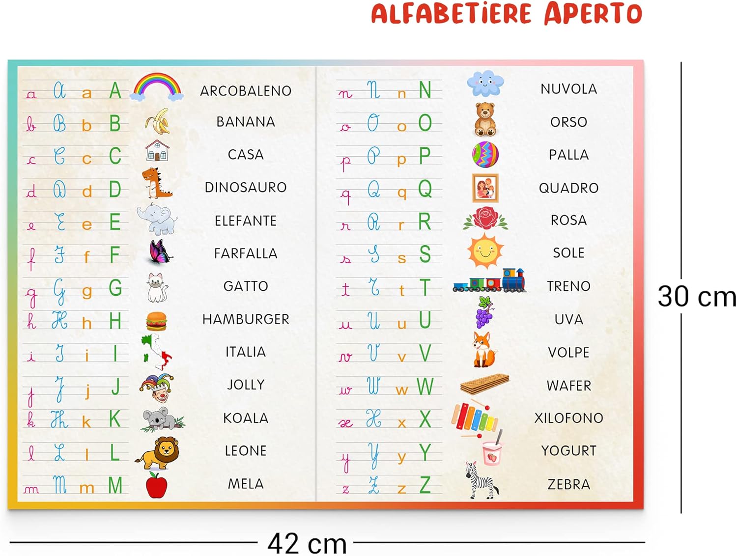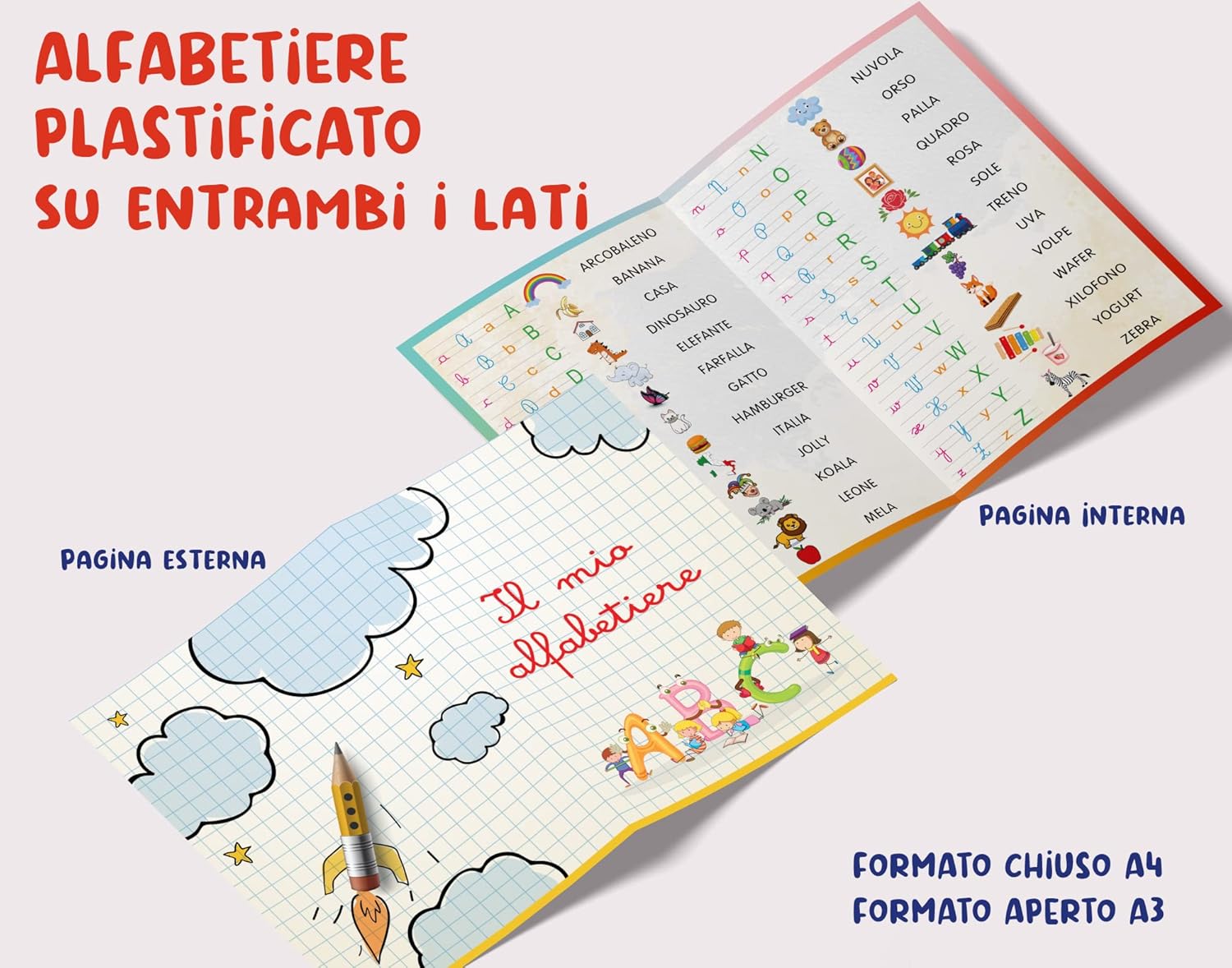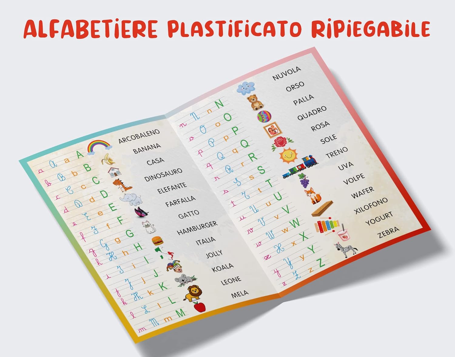 Alfabetiere Plastificato Ripiegabile- Abecedario Illustrato Prime Lettere in Stampatello e Corsivo arricchita da Immagini per Imparare Giocando Cartoncino da 300 g/m² Plastificato su entrambi i lati, 100% Made in Italy Formato Chiuso DIN A4: 21 X 29,7 Cm. Aperto: 30 X 42 Cm. 100% Made in Italy