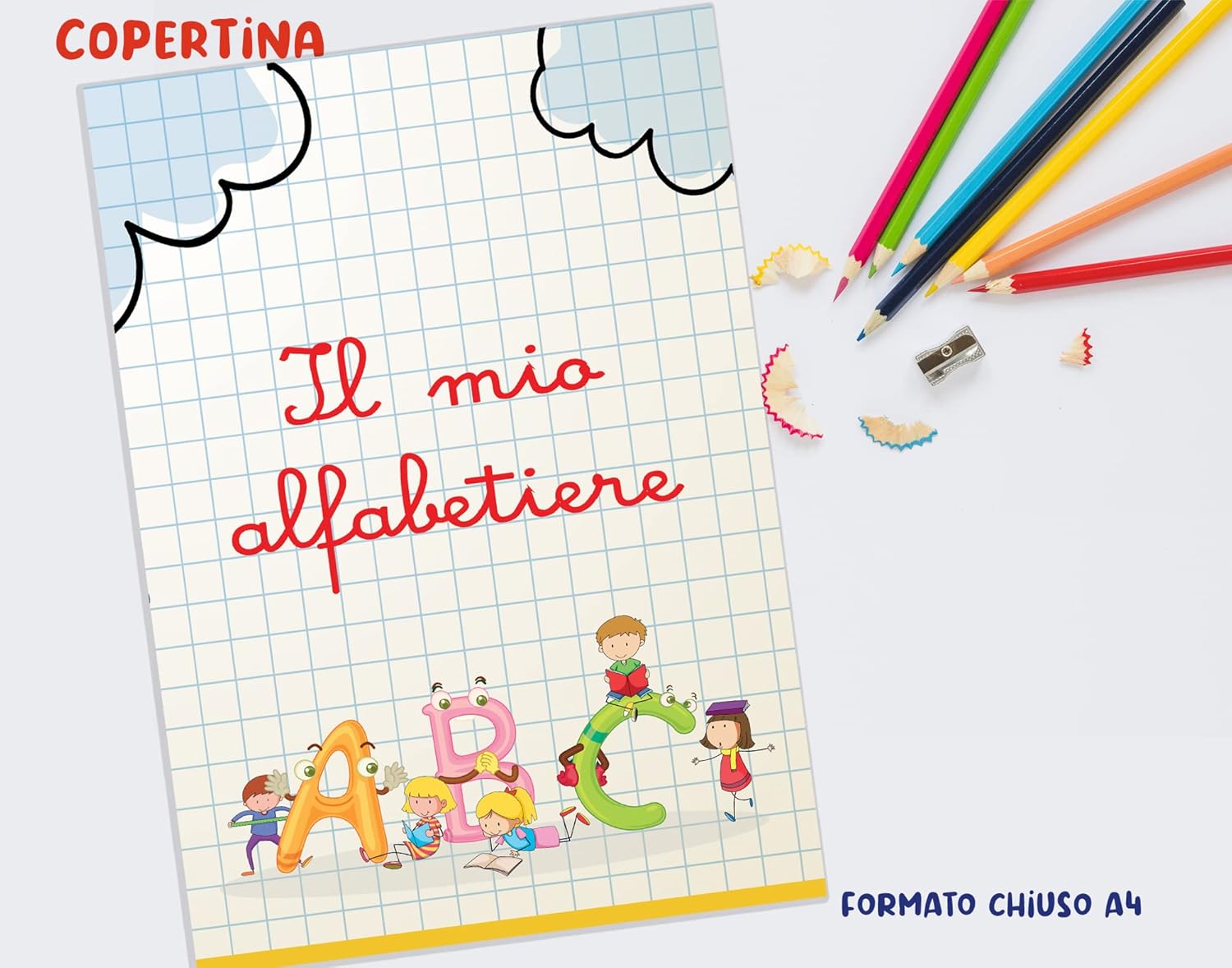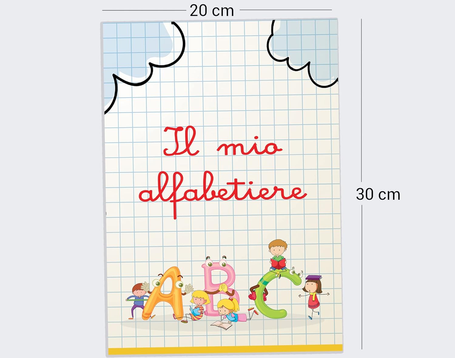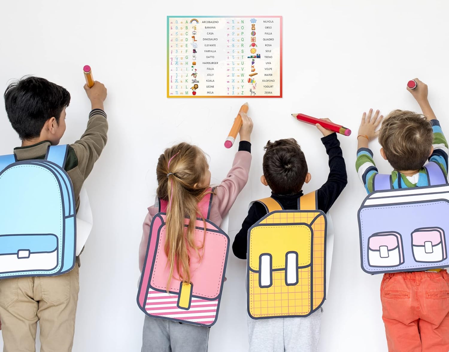 Alfabetiere Plastificato Ripiegabile- Abecedario Illustrato Prime Lettere in Stampatello e Corsivo arricchita da Immagini per Imparare Giocando Cartoncino da 300 g/m² Plastificato su entrambi i lati, 100% Made in Italy Formato Chiuso DIN A4: 21 X 29,7 Cm. Aperto: 30 X 42 Cm. 100% Made in Italy