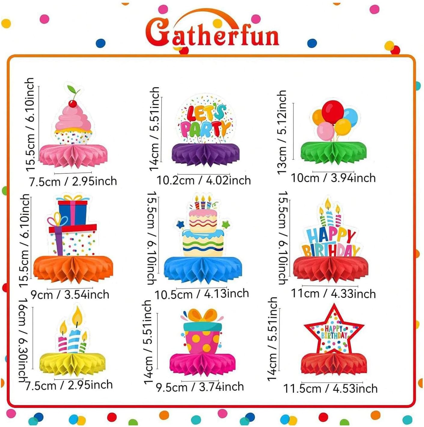 Cosa riceverete: riceverete 9 decorazioni di compleanno in diversi design. Include elementi iconici di compleanno come candeline, stelle, torte, palloncini, scritte “HAPPY BIRTHDAY” e altro ancora, che daranno alla vostra festa un'atmosfera speciale Materiale di alta qualità: le nostre decorazioni da tavola a nido d'ape per compleanni sono realizzate in cartone spesso con stampa su entrambi i lati, ogni decorazione a nido d'ape è accuratamente lavorata per garantire che i colori siano durevoli, lisci, resistenti e non sbiadiscano, in modo da poterle utilizzare a lungo Decorazioni da tavola a nido d'ape: le nostre decorazioni da tavola 3D a nido d'ape sono stampate su entrambi i lati. Da entrambi i lati è possibile ammirare i bellissimi colori. Dopo la festa, possono essere riposte in modo da occupare poco spazio. Perfette come decorazioni per runner da tavola o come complemento ai tovaglioli hawaiani. Facili da montare: le decorazioni possono essere montate senza sforzo, semplicemente aprendo e fissando la forma a nido d'ape. Dopo la festa, le parti possono essere riposte in modo da occupare poco spazio e riutilizzate per future feste a tema unicorno o feste di compleanno. Versatile: la decorazione da tavola a nido d'ape può essere utilizzata per feste di compleanno, baby shower, feste scolastiche, feste canore, decorazioni per feste di laurea e così via. È adatta a tutte le fasce d'età e dona un tocco speciale a ogni festa, rendendola un must per ogni festa di compleanno.