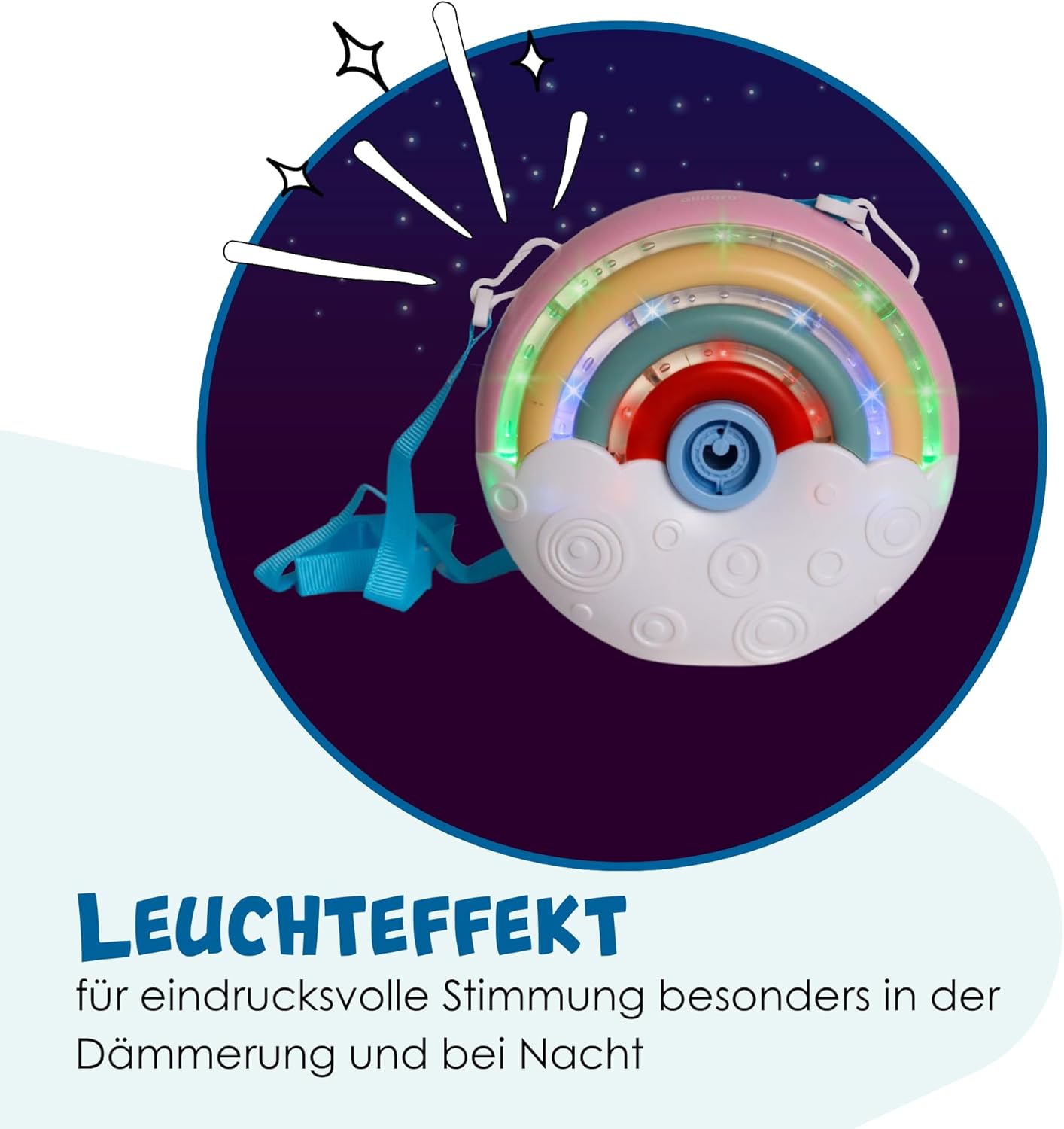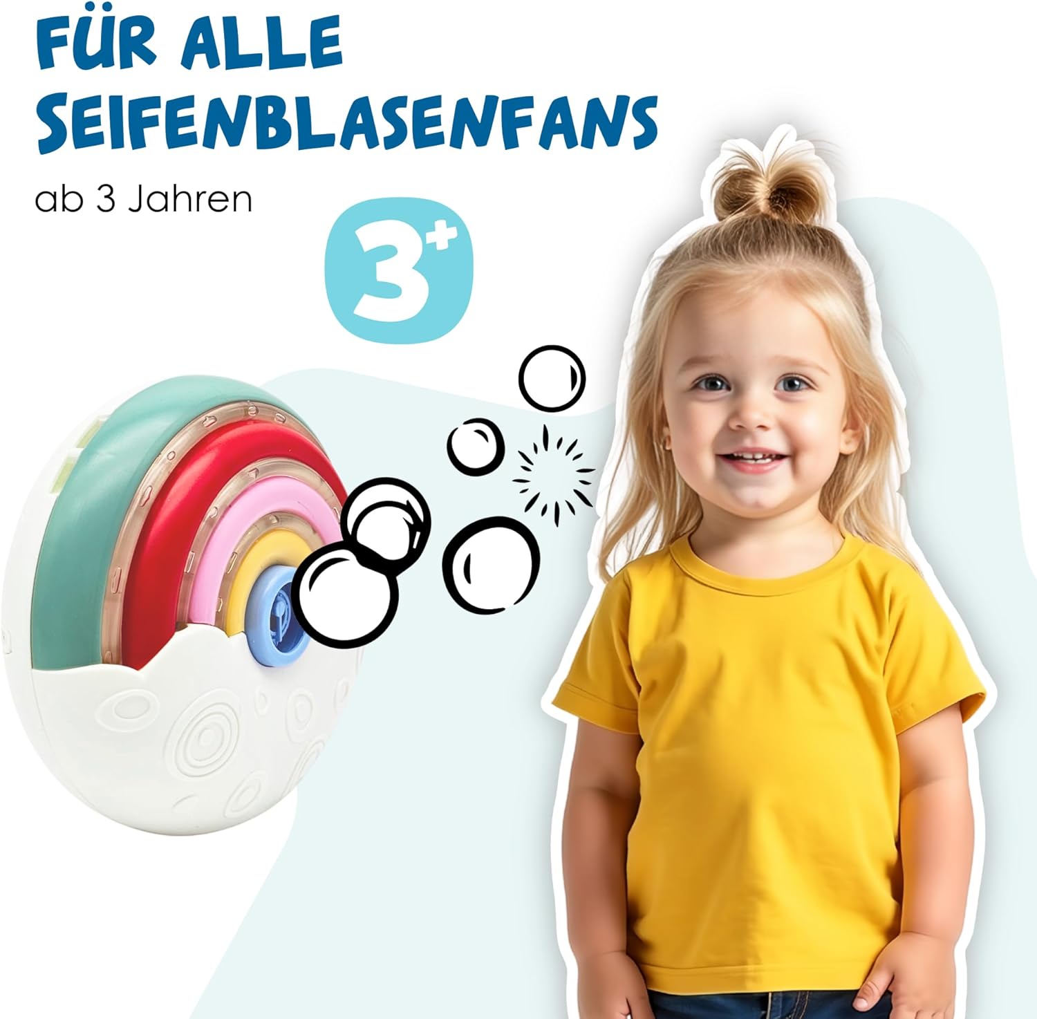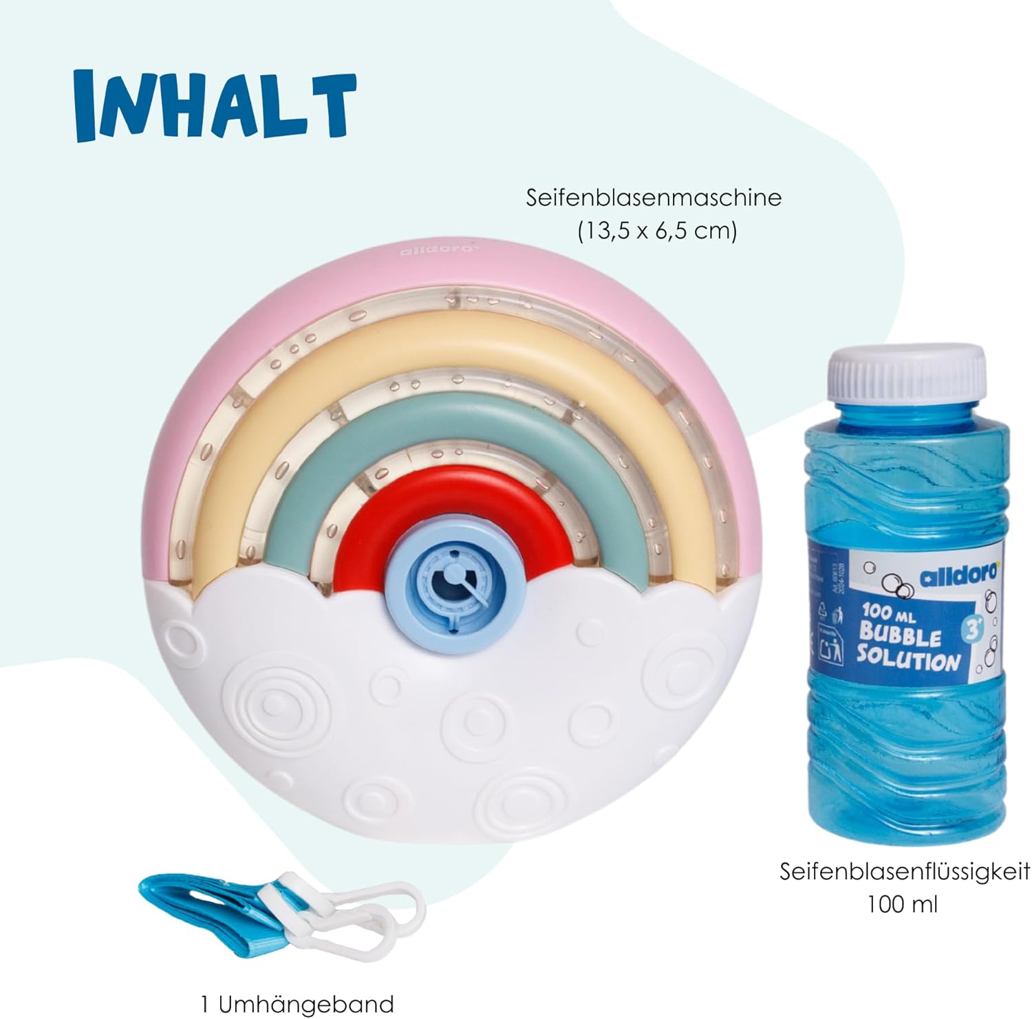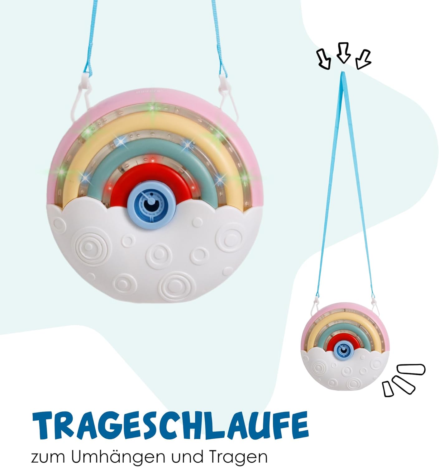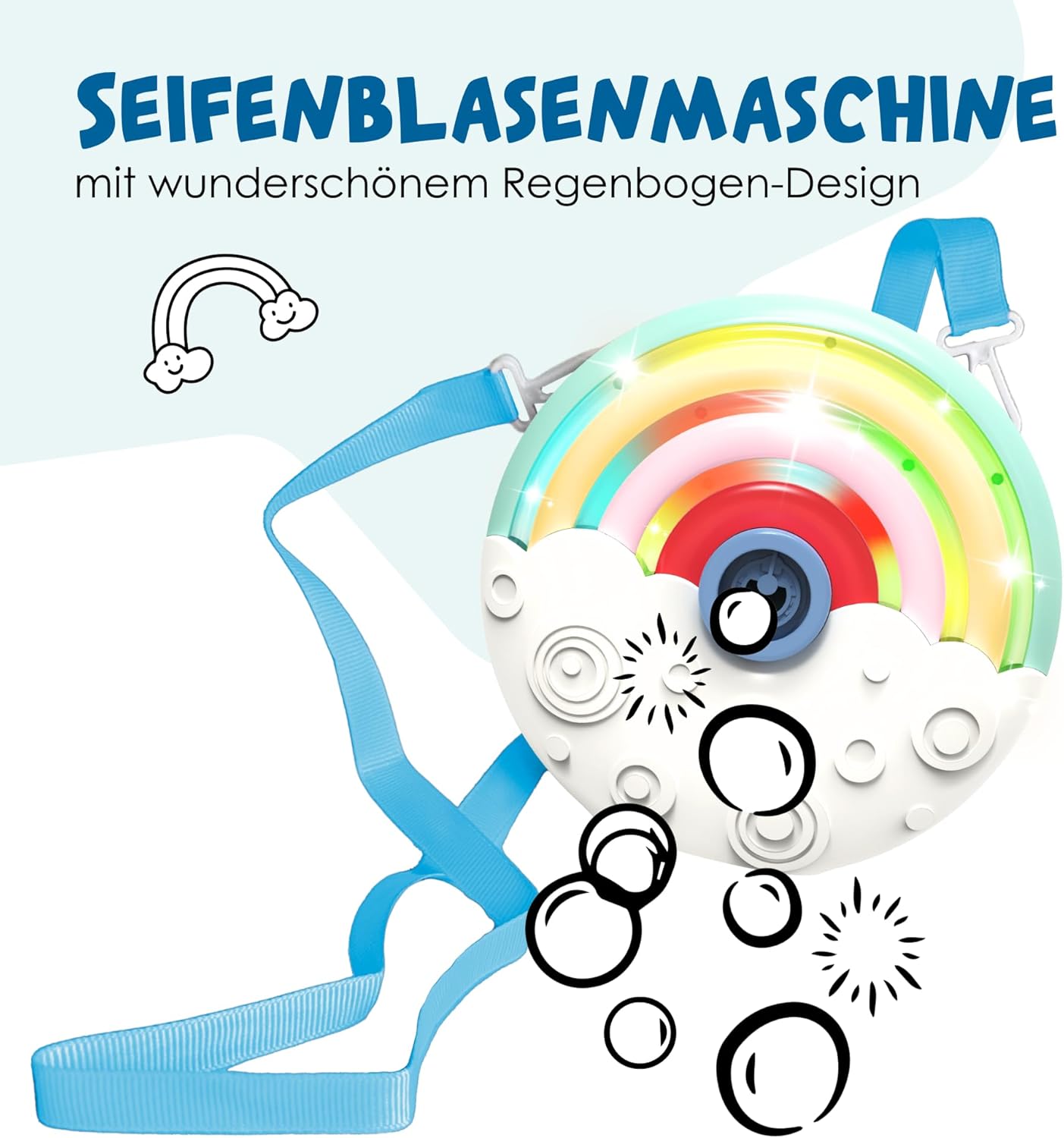 Effetto lampeggiante: la macchina per bolle di sapone colorata e portatile delizia con il suo effetto luminoso. Contiene 100 ml di liquido per bolle di sapone ed è ricaricabile in qualsiasi momento Divertimento - Ideale per i bambini dai 3 anni in su, per giocare e meravigliarsi con i fratelli o gli amici a casa, all'asilo o semplicemente da portare con sé Portatile - Grazie alle sue dimensioni compatte di 13,5 x 6 x 13 cm e ad una tracolla removibile da portare al collo, è un pratico compagno ovunque. Funziona con 3 batterie AA da 1,5 V (non incluse) Regalo - Grazie al design arcobaleno, alle luci arcobaleno lampeggianti e alla garanzia divertente, è il regalo ideale per il compleanno di un bambino, addio al nubilato o all'oro di Pasqua - Dal 2016 offriamo giocattoli con il nostro marchio che incoraggiano il divertimento, l'attività e il movimento. Aiutano i bambini di tutte le età a svilupparsi fisicamente e intellettualmente