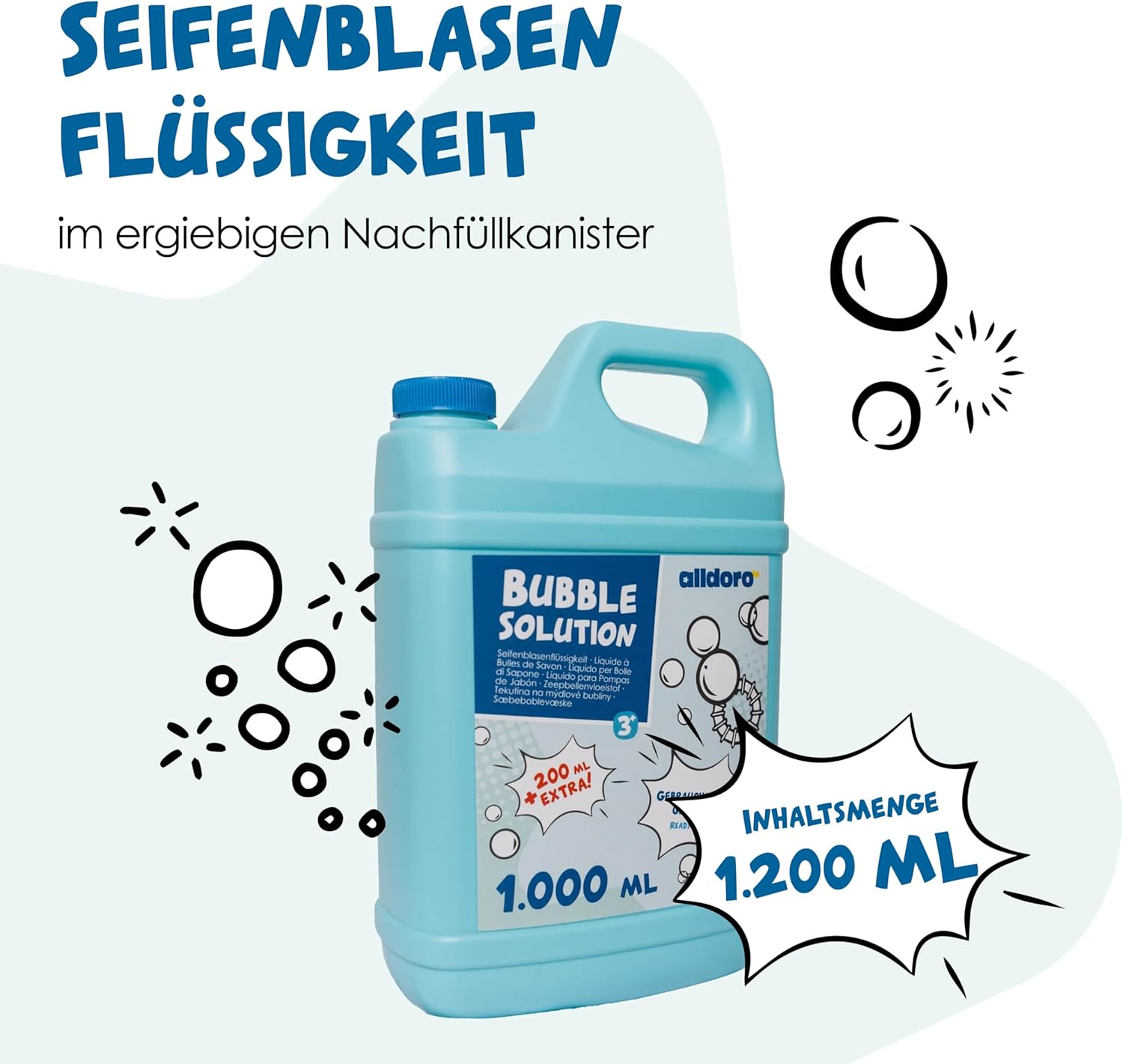La pratica borraccia con bolle di sapone in formato dall'oro da 1,2L stupisce subito grandi e piccini. Le macchine per bolle di sapone sono facilissime da riempire e il divertimento è illimitato. La soluzione di sapone nel comodo formato ricarica contiene 200 ml in più rispetto alle tradizionali bottiglie da 1 litro. Già miscelato e pronto all'uso. Perfetto per barre, anelli e macchine. Il divertimento infinito delle bolle di sapone con la soluzione bolle di sapone per interni ed esterni, in giardino, al parco, in viaggio o all'asilo. Le gigantesche e colorate bolle di sapone che si formano deliziano grandi e piccini. Altri ottimi usi: compleanno dei bambini, addio al celibato, barbecue, feste, anniversari e celebrazioni di ogni tipo, matrimoni e addii al nubilato o al celibato, ingresso a scuola, festa di fine anno e festa estiva alldoro - Dal 2016 offriamo giocattoli con il nostro marchio che promuovono divertimento, attività e movimento. Aiutano i bambini di tutte le età a svilupparsi fisicamente e intellettualmente.