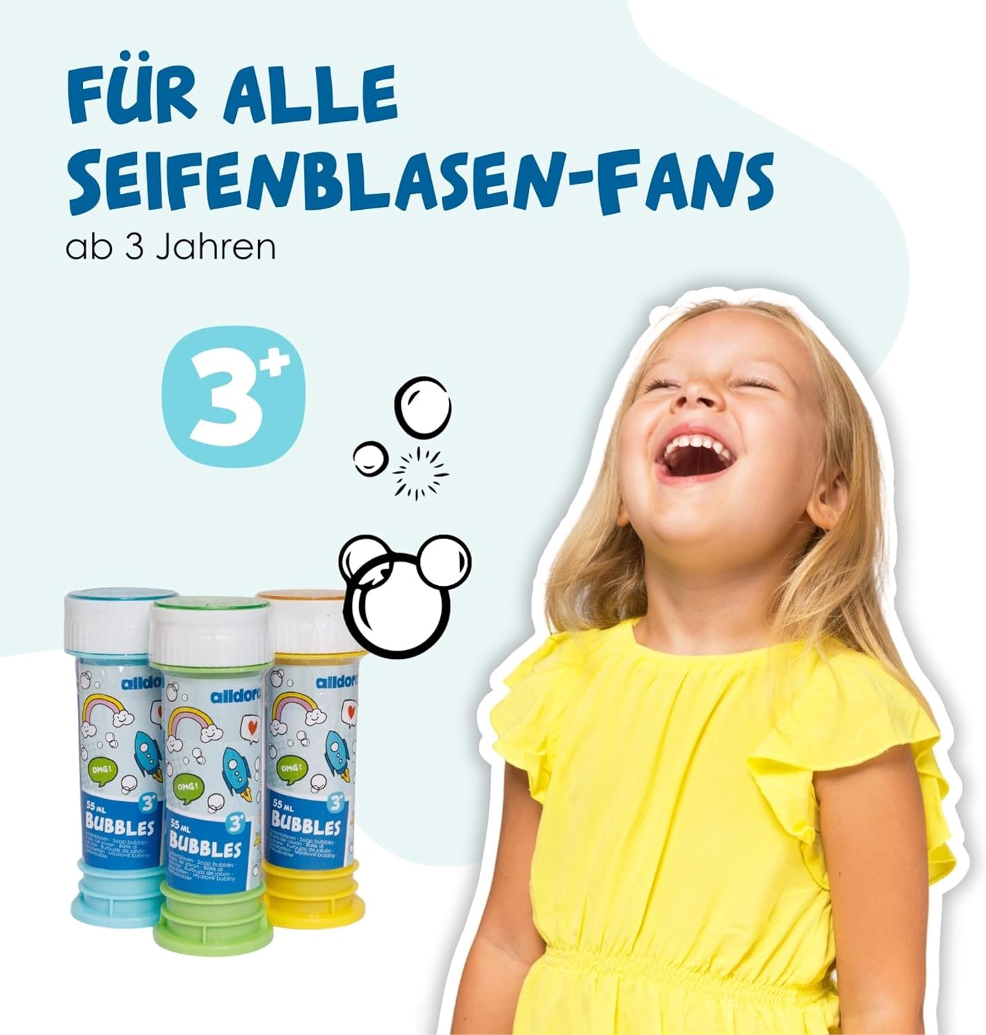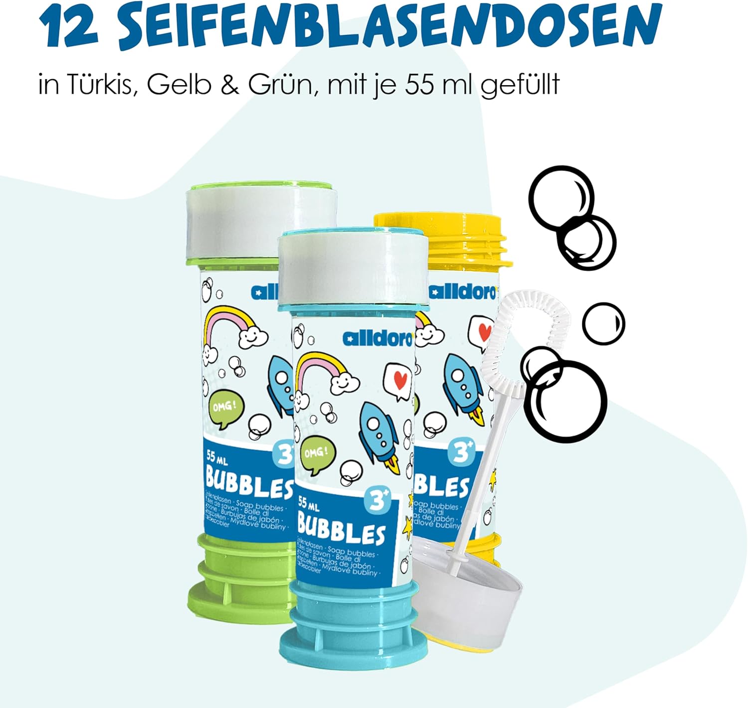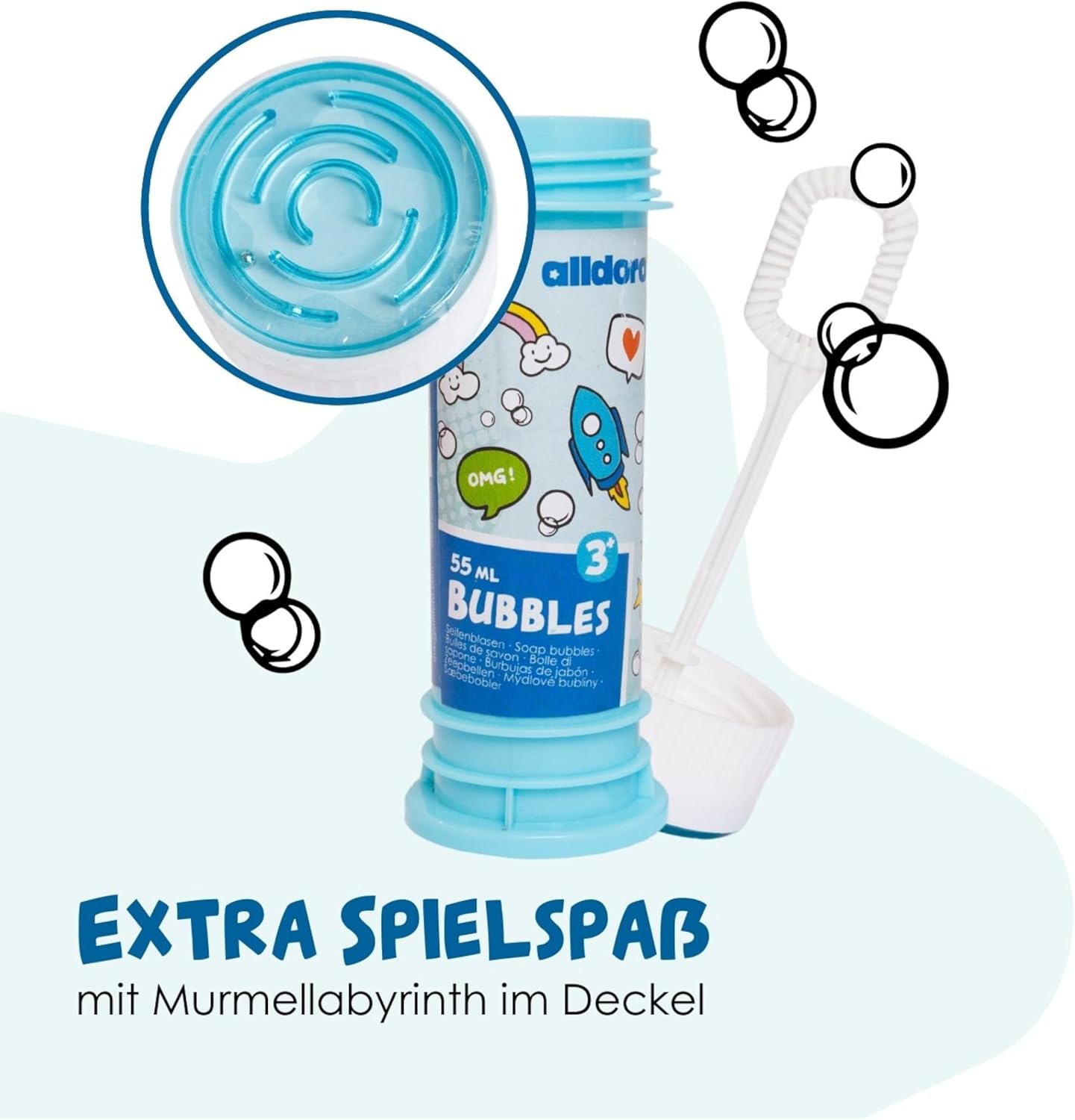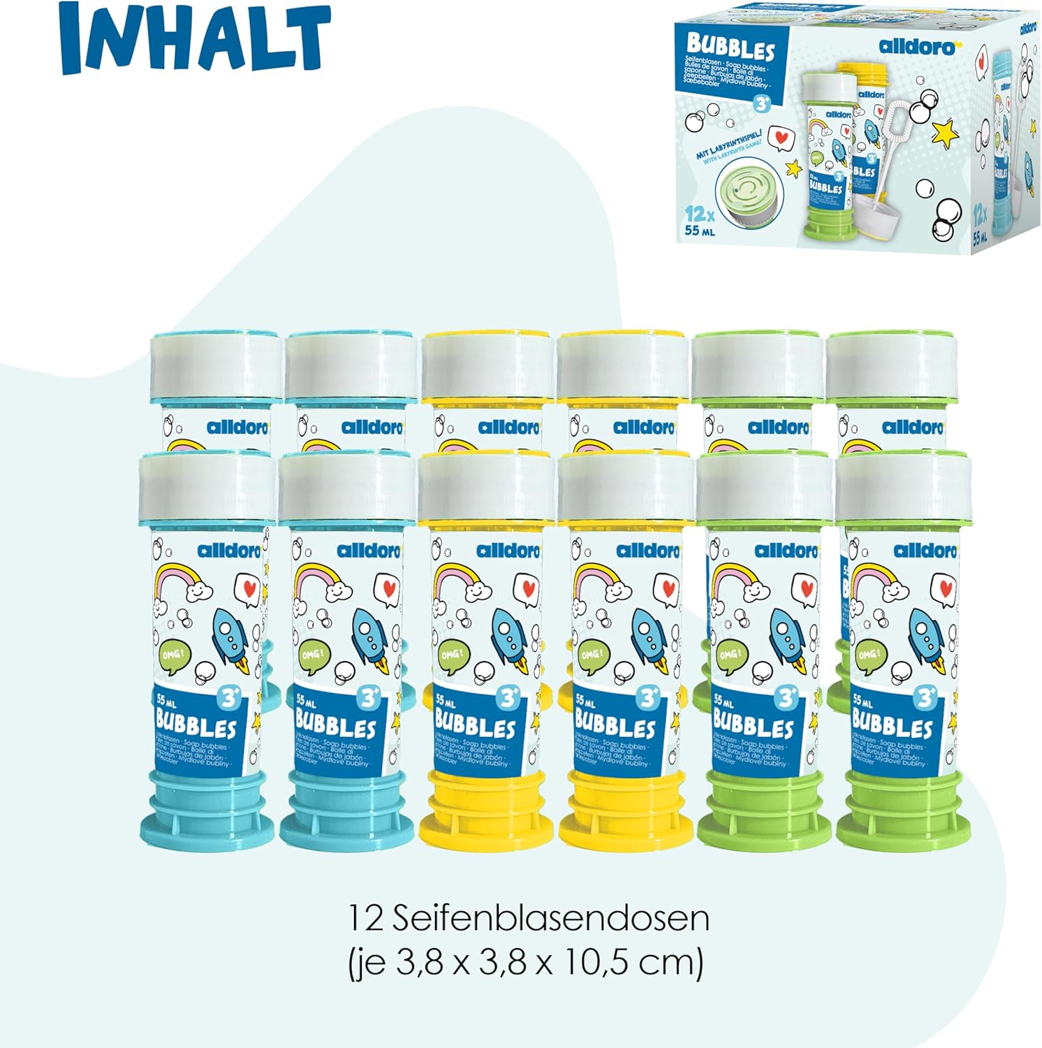 La confezione da 12 bolle di sapone Dalldoro stupirà subito grandi e piccini. Le scatole sono alte circa 10,5 cm e sono dotate di un bastoncino per creare bolle di sapone colorate. Ciascuno contiene 55 ml di liquido per bolle di sapone, per iniziare subito. Basta tenere il bastoncino per bolle nel tubo della soluzione di sapone, metterlo davanti alla bocca e soffiare: si formano molte bolle. Un sapone gigante per interni ed esterni, in giardino, al parco o all'asilo. Facile da usare per ragazzi e ragazze dai 3 anni in su. Extra: il gioco del labirinto di biglie nel coperchio. Altri ottimi usi: compleanno dei bambini, addio al celibato, barbecue, feste, anniversari e celebrazioni di ogni tipo, matrimoni e addii al nubilato o al celibato, ingresso a scuola, festa di fine anno e festa estiva alldoro - Dal 2016 offriamo giocattoli con il nostro marchio che promuovono divertimento, attività e movimento. Aiutano i bambini di tutte le età a svilupparsi fisicamente e intellettualmente.