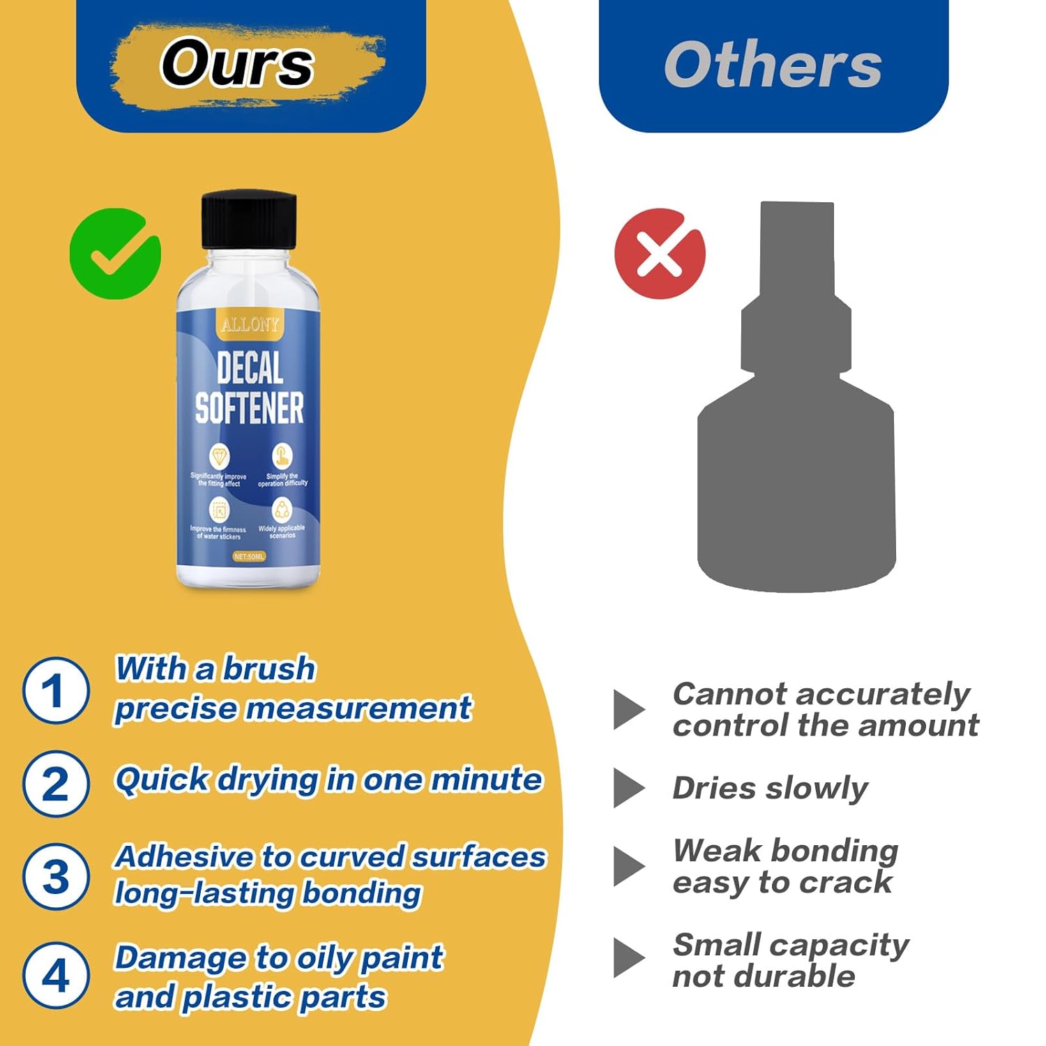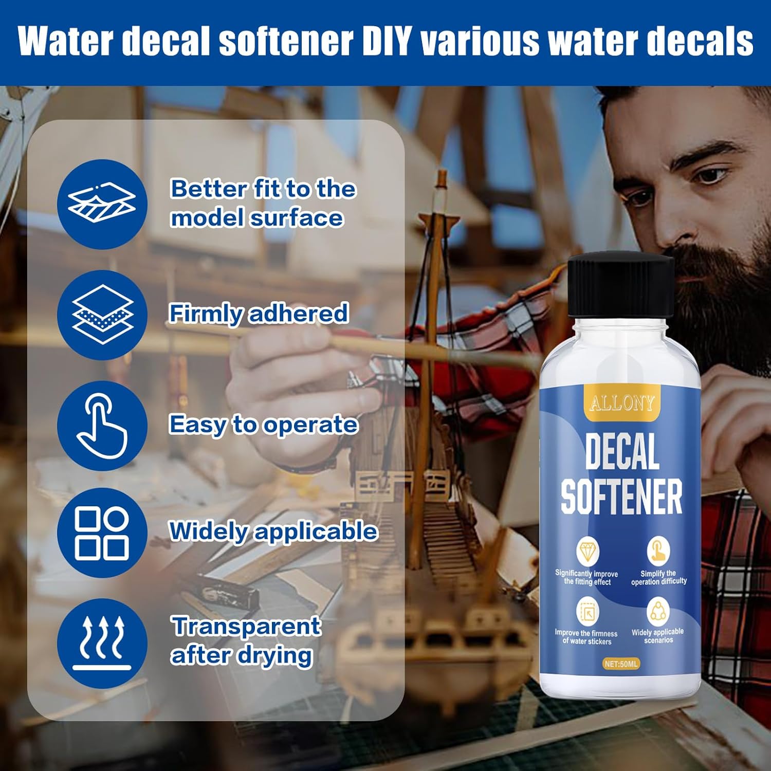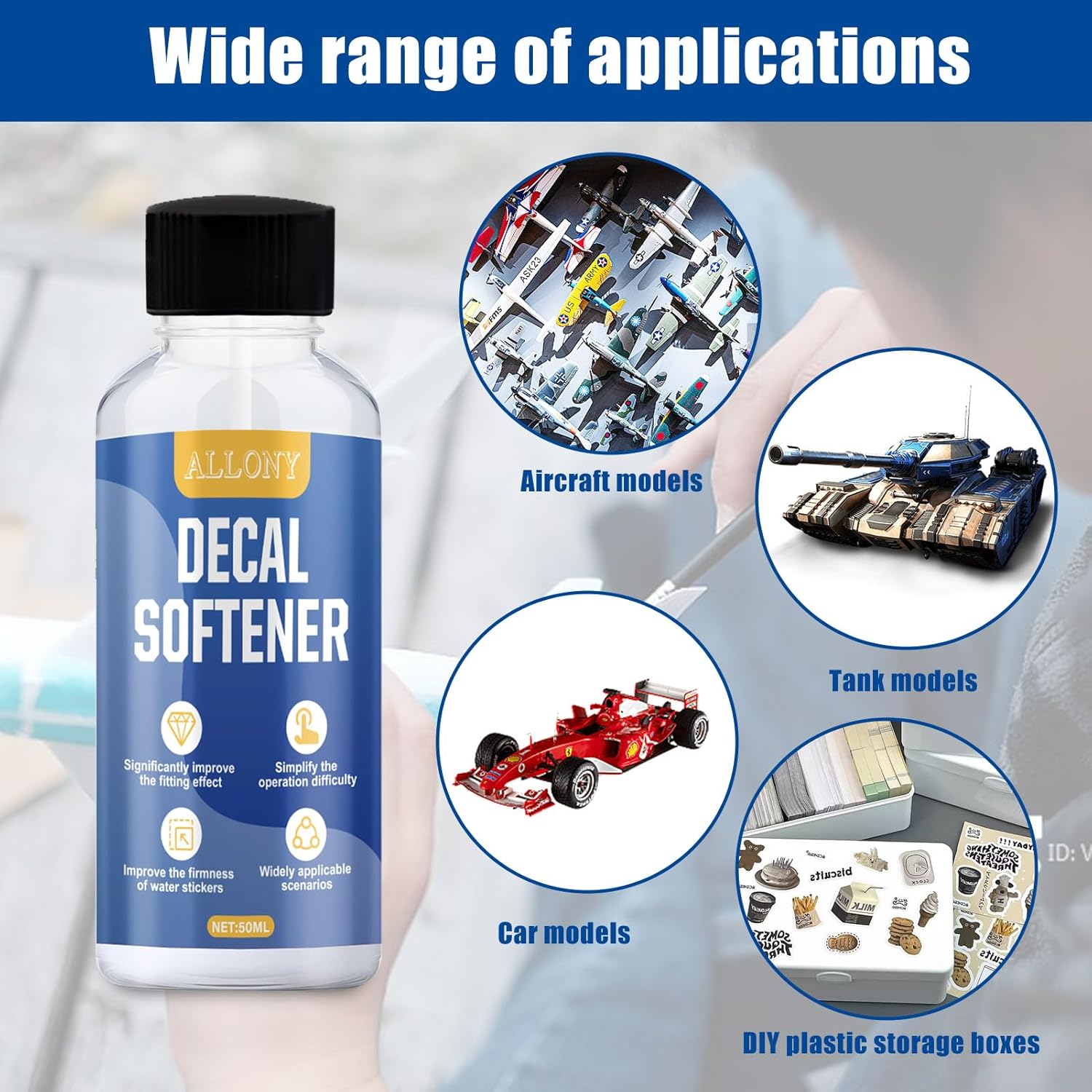 Esperto in superfici curve complesse: Decal Softener è progettato per superfici irregolari, risolvendo facilmente il problema delle deformazioni in corrispondenza delle giunzioni dei modelli/superfici curve. Bastano poche gocce sulla decalcomania per adattarla facilmente a superfici irregolari o curve. Perfettamente invisibile: Decal Softener si asciuga diventando trasparente, dissolvendo i bordi della pellicola man mano che si ammorbidisce, permettendole di adattarsi perfettamente a dettagli e contorni complessi, riducendo le bolle e dando l'impressione che la decalcomania sia stata dipinta direttamente sulla superficie. Adesione salda: il nostro colla per plastica personalizzato può aumentare la duttilità della decalcomania ad acqua, rendendola più docile e aderente, soprattutto per le decalcomanie su superfici irregolari. Bastano pochi minuti perché la decalcomania inizi ad adattarsi alla superficie e, una volta completamente asciutta, può essere incollata saldamente al modello. Facile da usare: l'addolcitore per decalcomanie ad acqua è dotato di una testina graduata. Controlla con precisione la quantità di liquido, ogni decalcomania necessita solo di una piccola quantità di liquido, si adatta facilmente e perfettamente a vari dettagli e contorni e migliora la tenuta dell'adesivo ad acqua. Multiuso: il nostro addolcitore per decalcomanie ad acqua è adatto a vari modelli di adesivi ad acqua, come aeroplani, carri armati, modellini di auto, ecc. e può essere utilizzato anche nel campo dell'artigianato creativo e del fai da te, senza danneggiare la superficie di vernici oleose e parti in plastica.