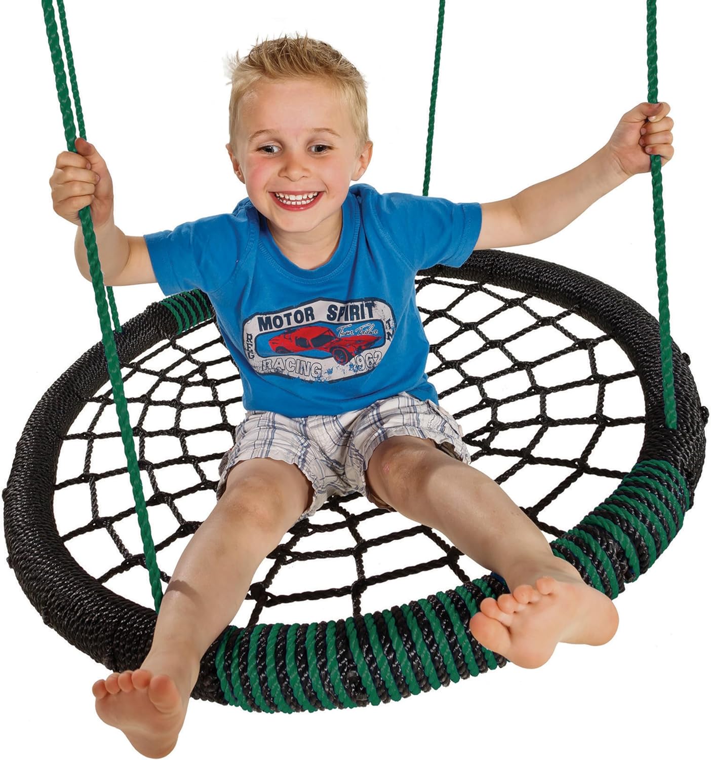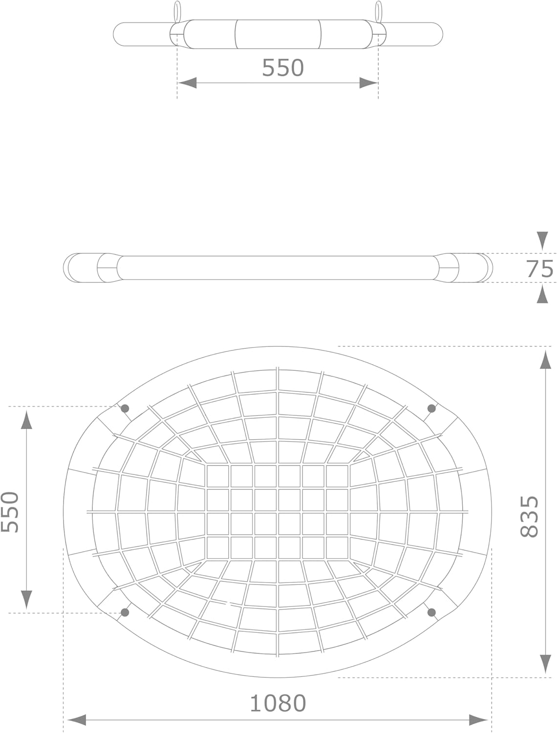 Anelli e otto in acciaio zincato Sedile Altalena Nest Corde Regolabili. Dimensioni del sedile: 1080 x 835 x 75 mm Saldature in PP nero sulle corde dell'altalena Sedile Soft Impact Zone
